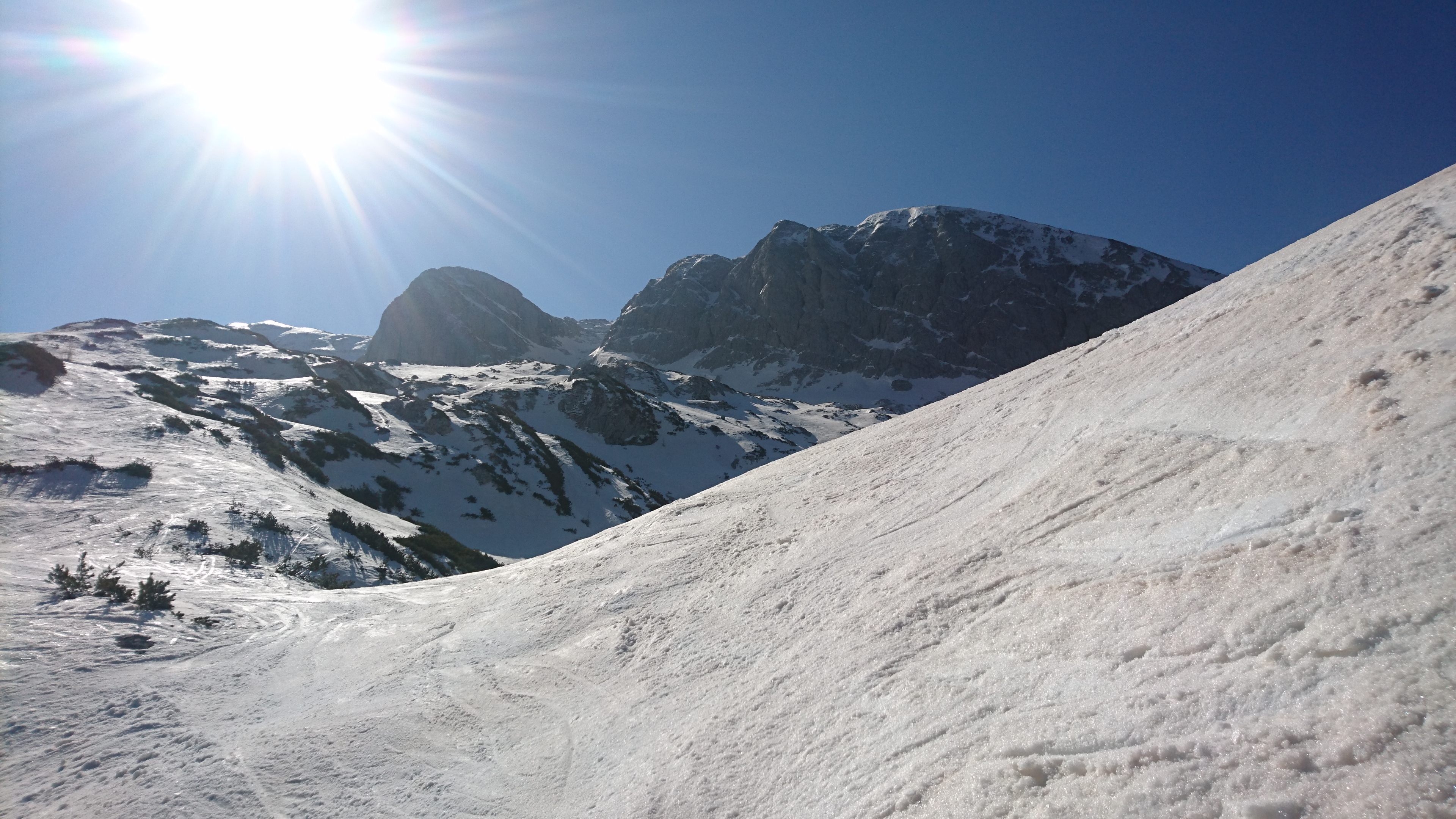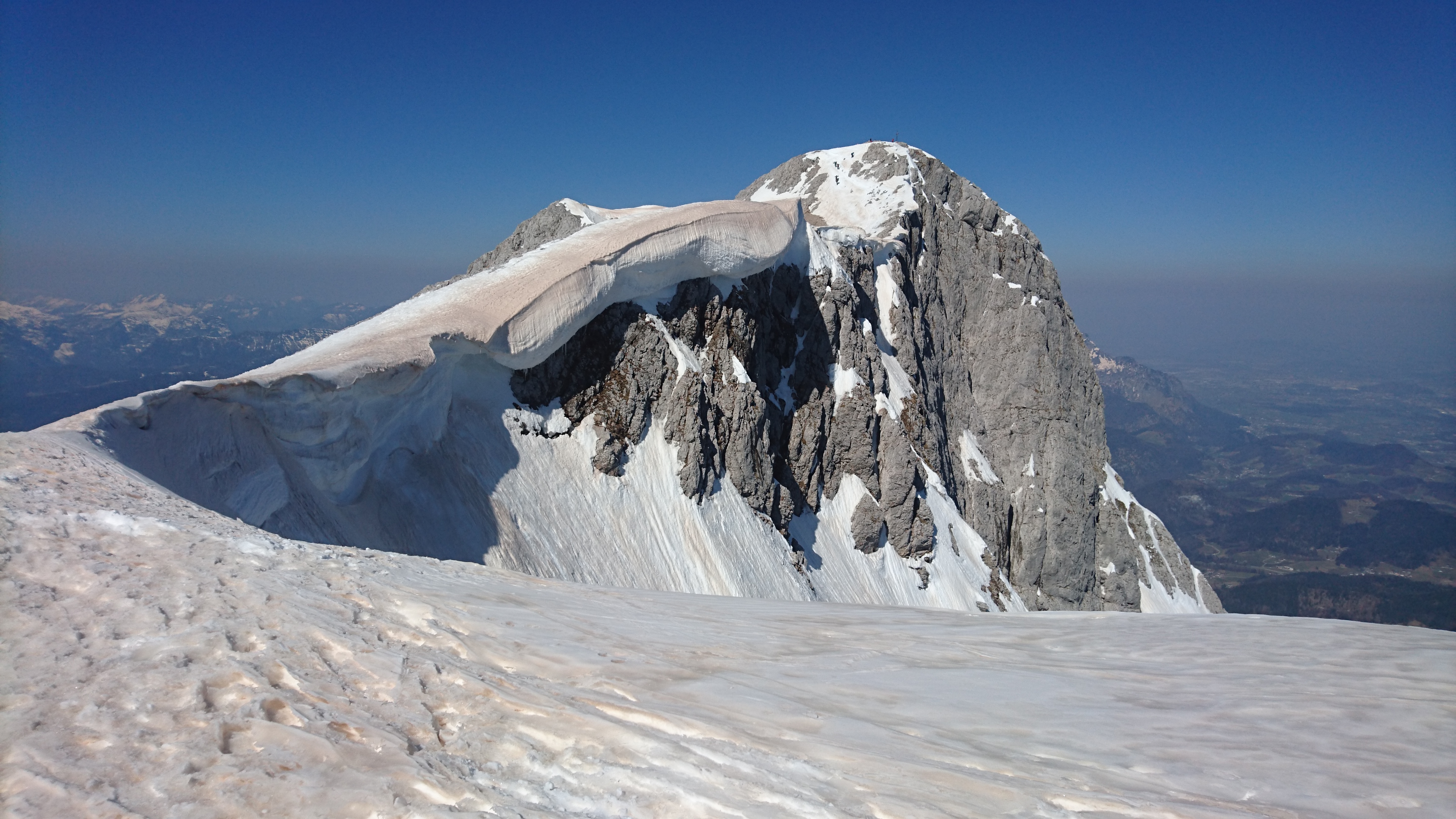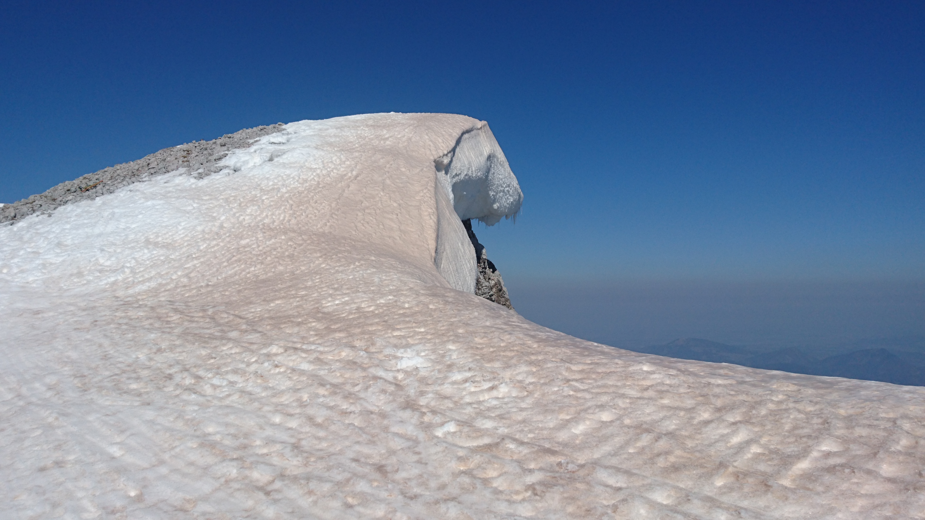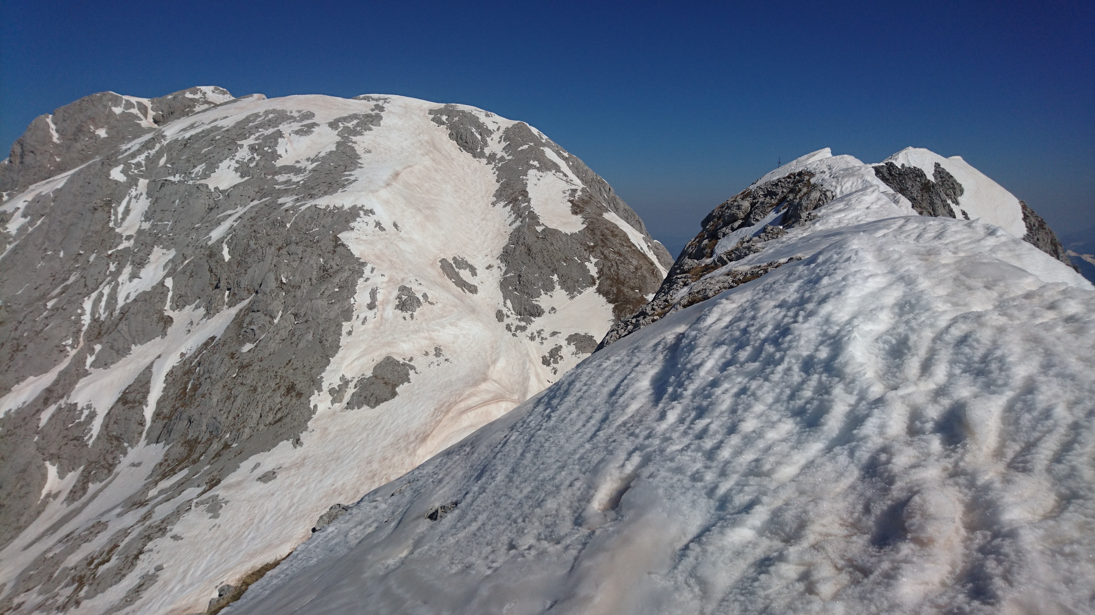Keine Nassschneerutsche zu beobachten, trotz hoher Temperaturen am Südhang zum Gipfel