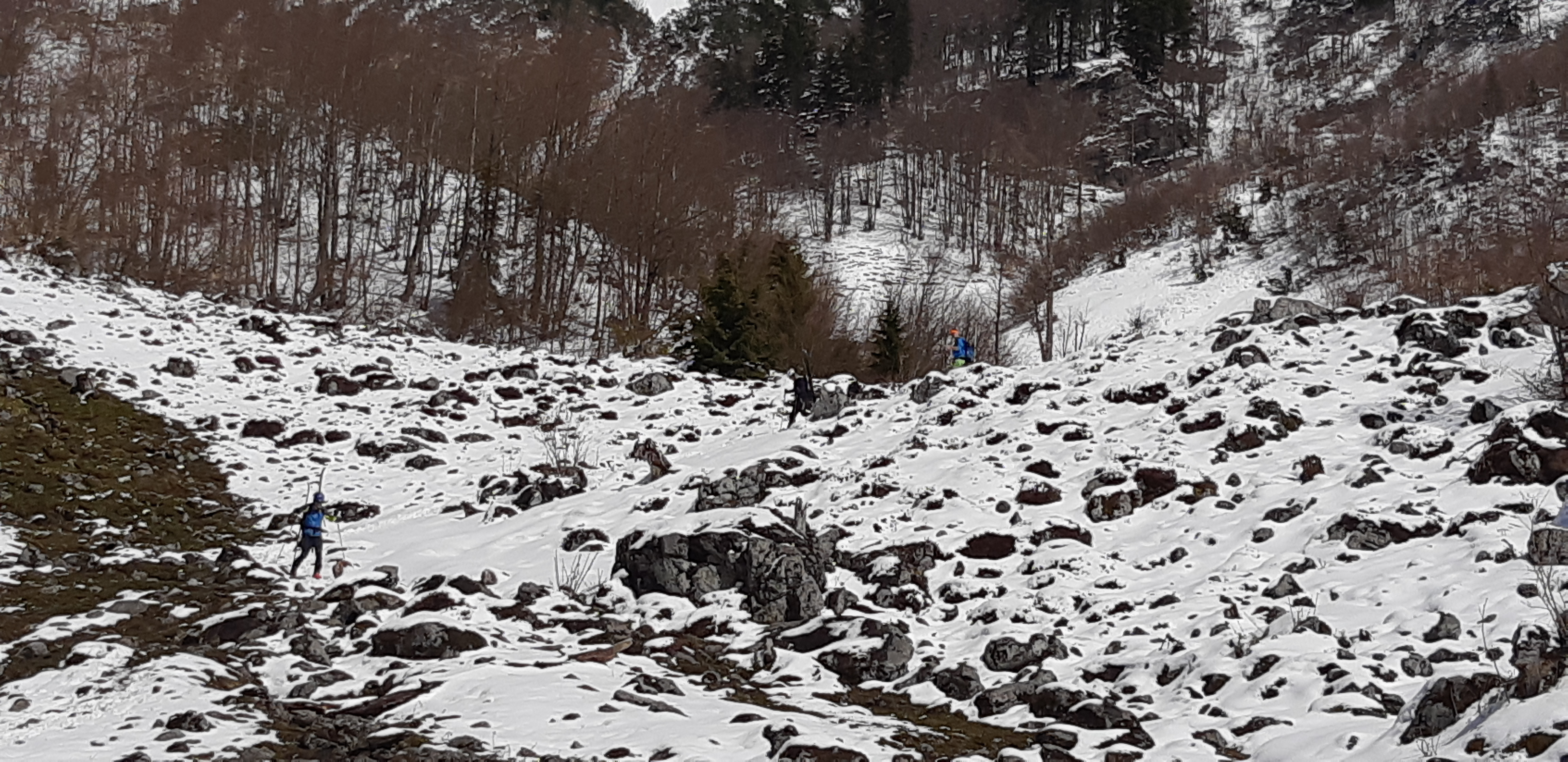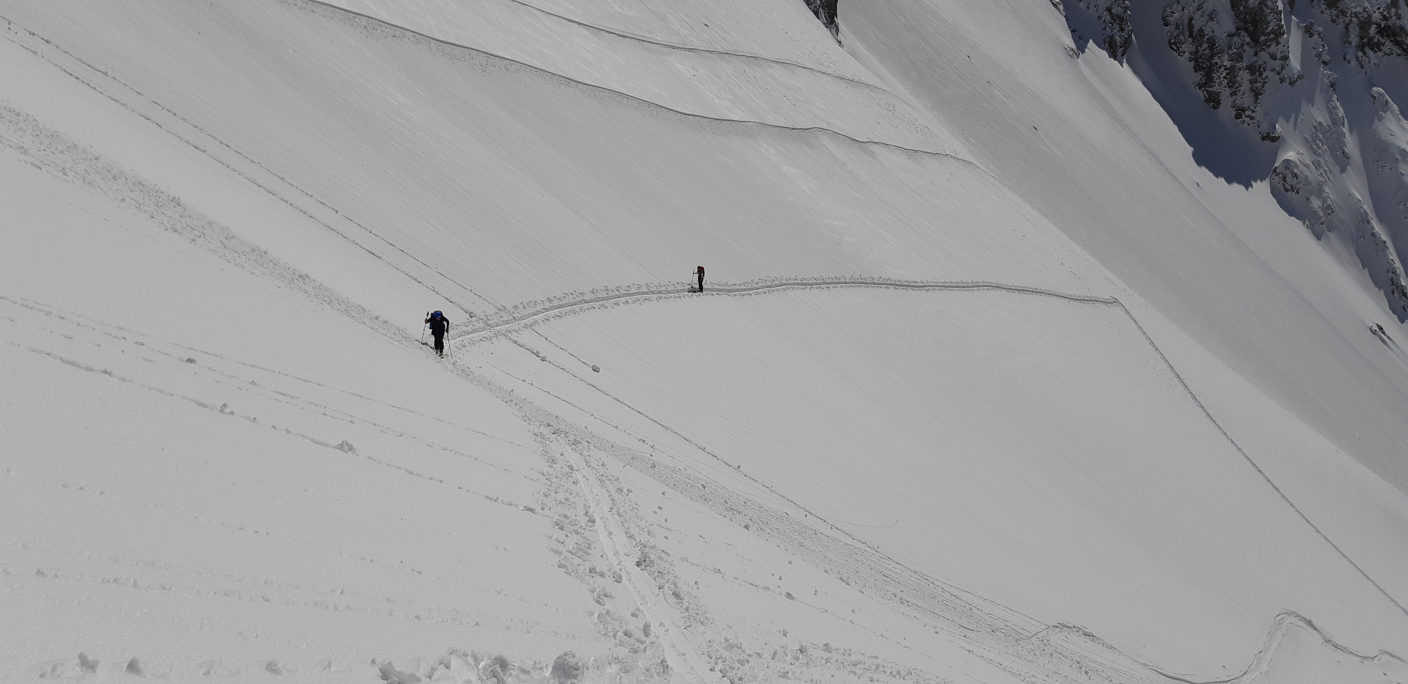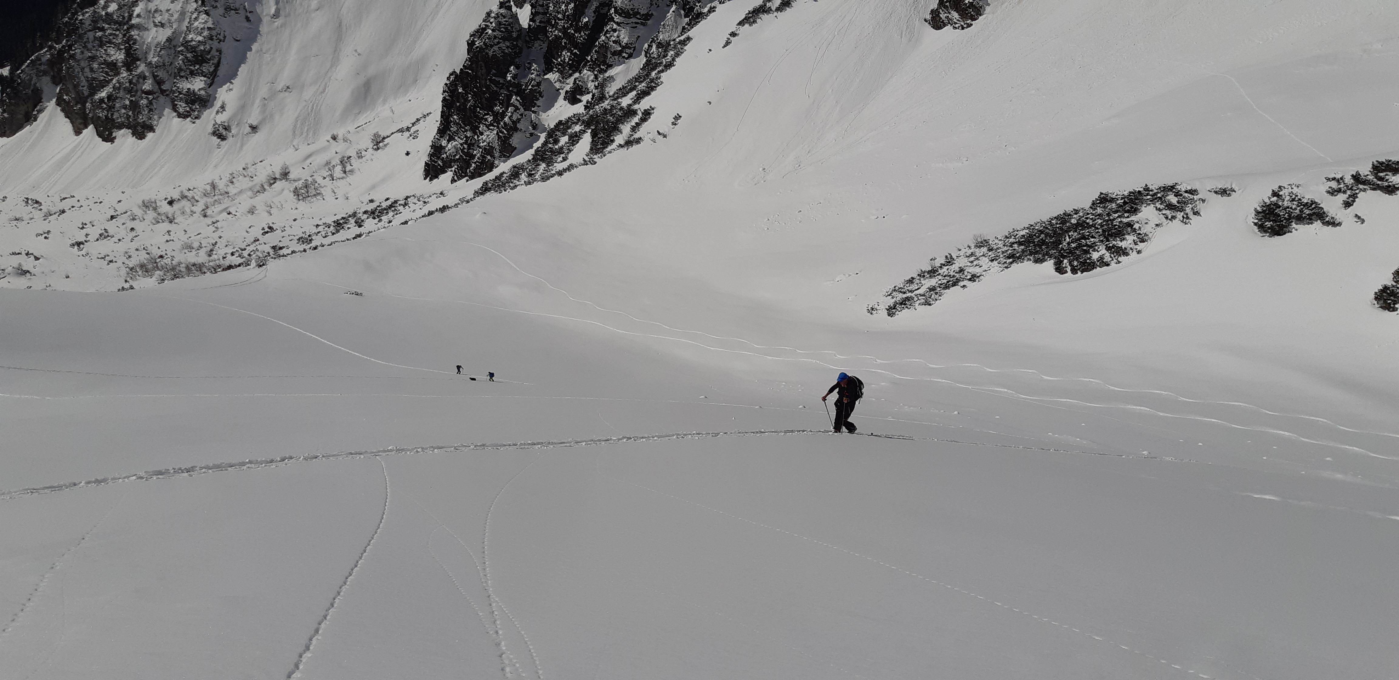 Beim Aufstieg links sonnseitig aus den Felsen schon rege Lawinentätigkeit und ab 13 Uhr kollerten auch auf der gegenüberliegenden Seite zahlreiche "Fremdlinge " herab.