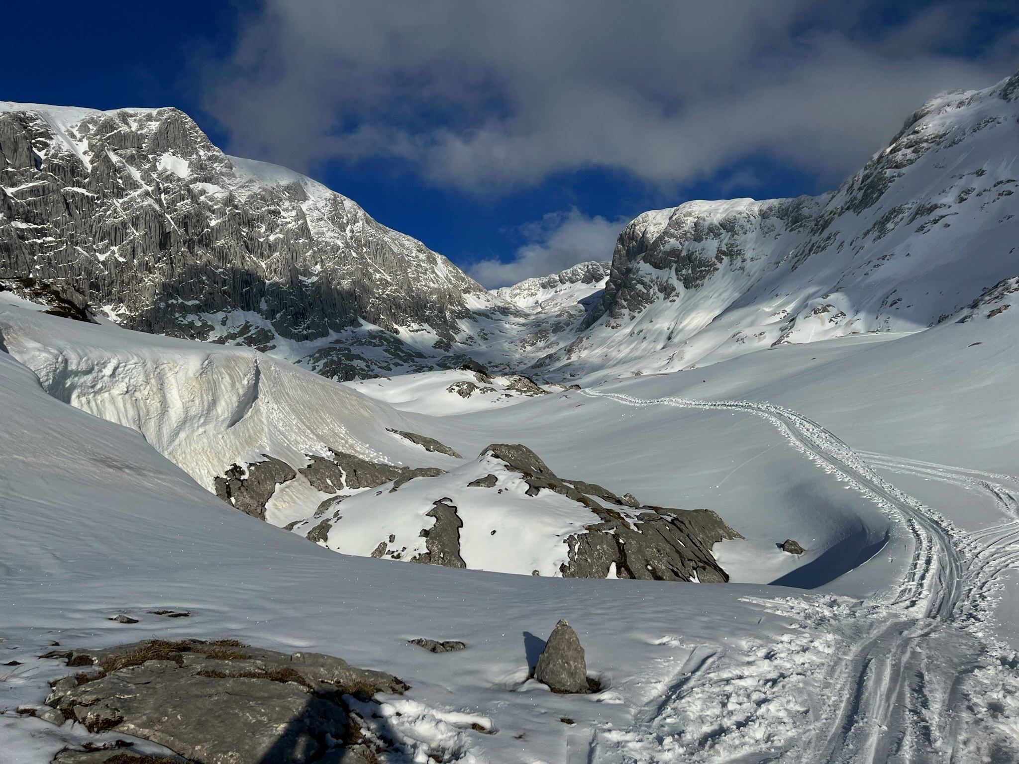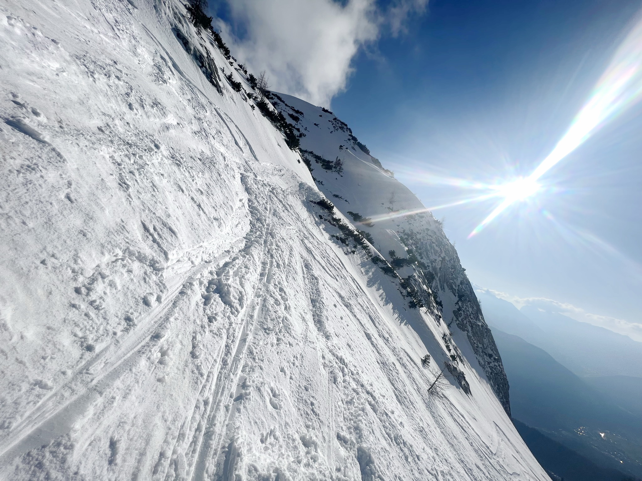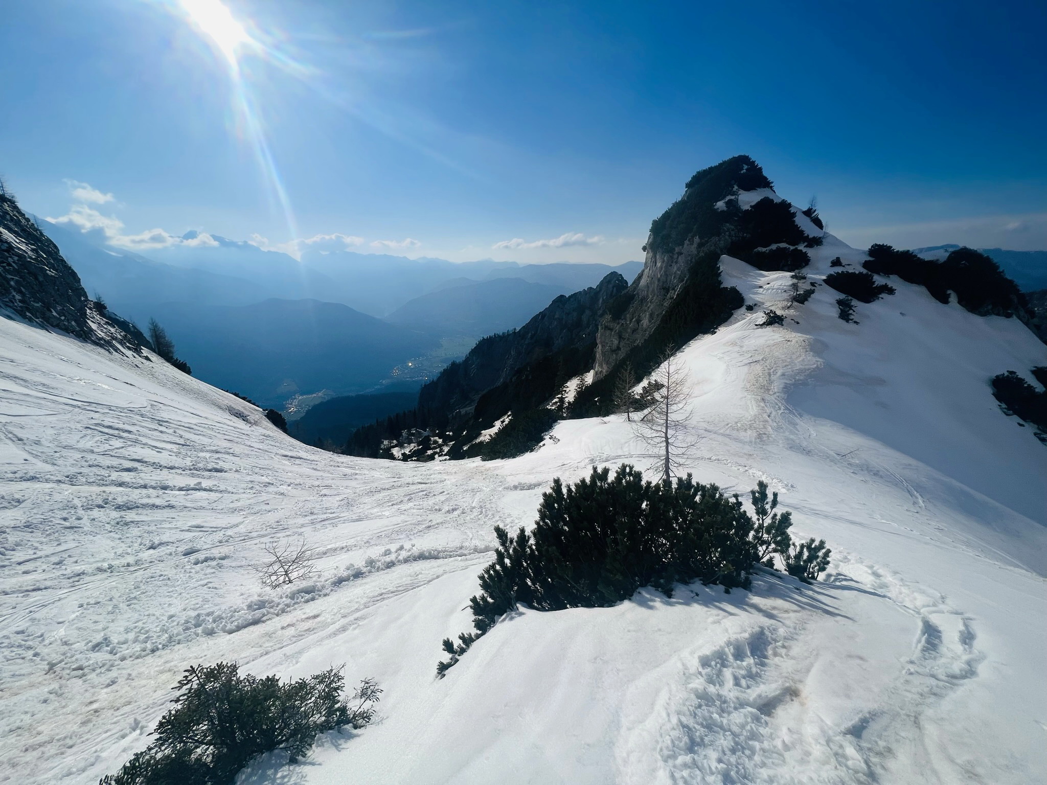 Es sind letzten Tage am Hohen Göll mit Ski. Der Schnee ist ab dem Steilhang durchgehend, jedoch im unteren Bereich schmilzt er mit der Sonneneinstrahlung weg.