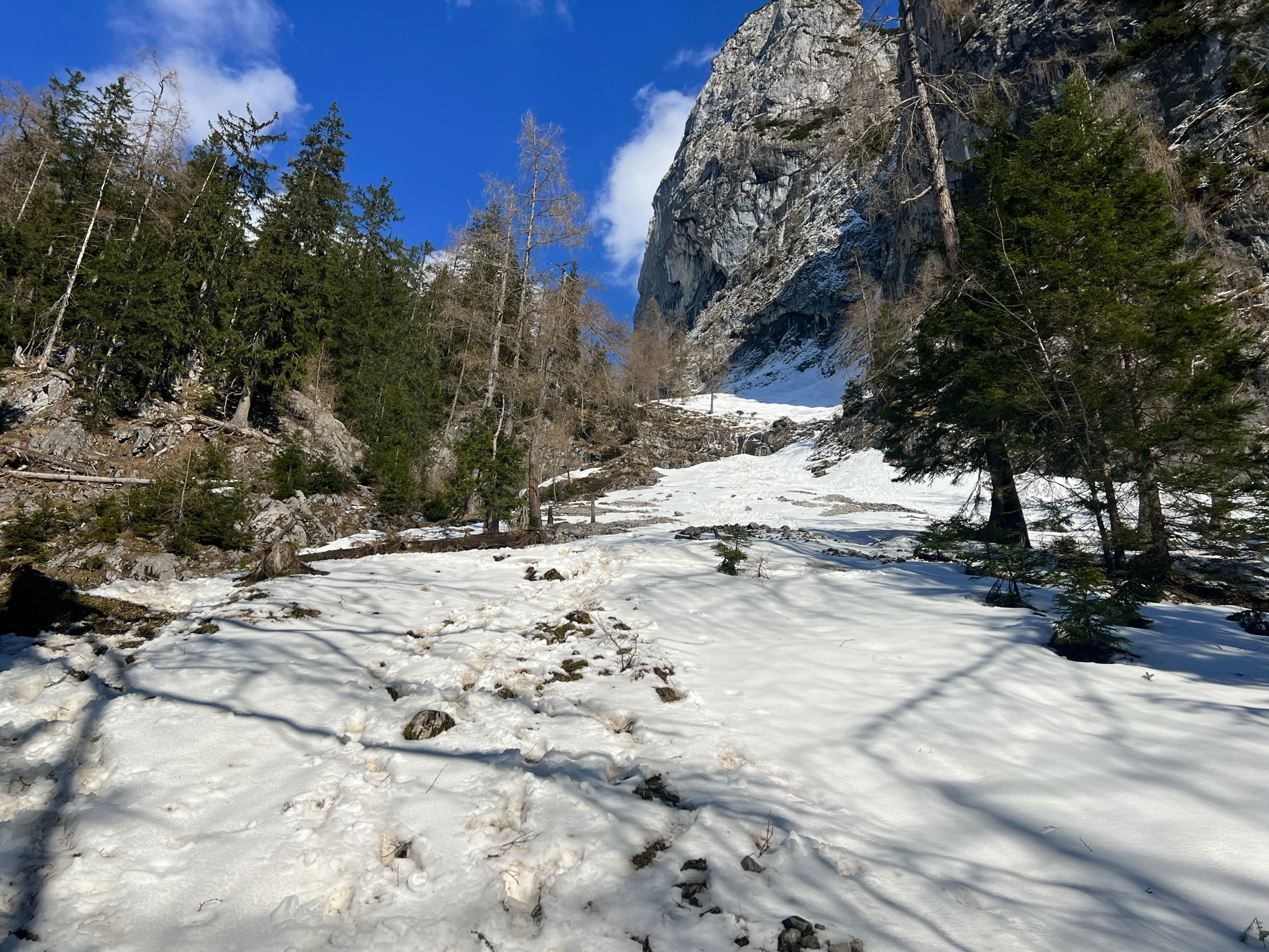 Bis zum Steilhang, 300Hm ist kein Schnee mehr, danach schwerer Schnee. Der Neuschnee von vorgestern mit 10 cm ist bereits teilweise rausgerutscht.