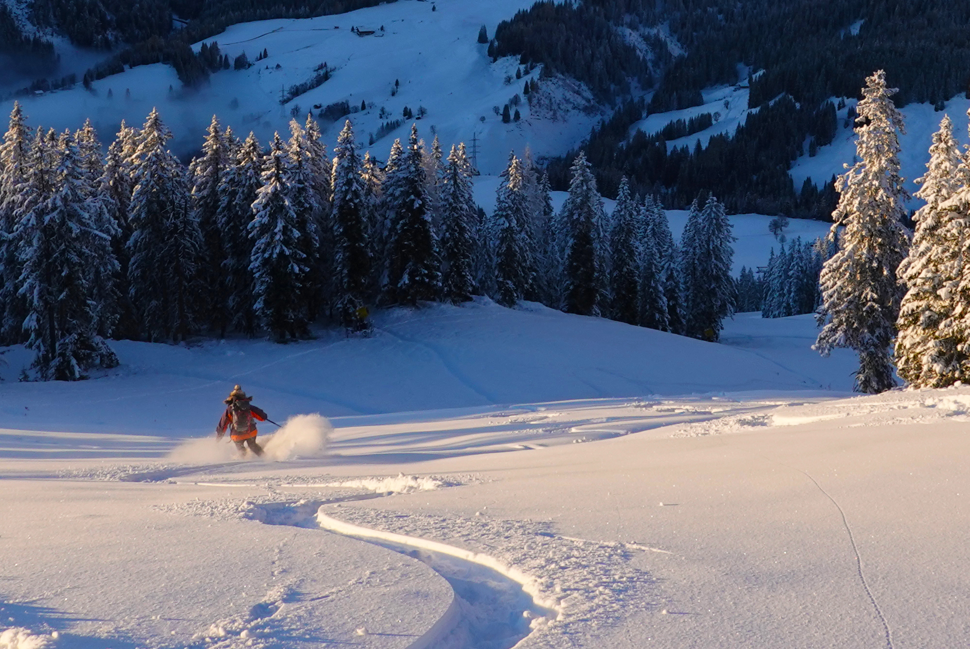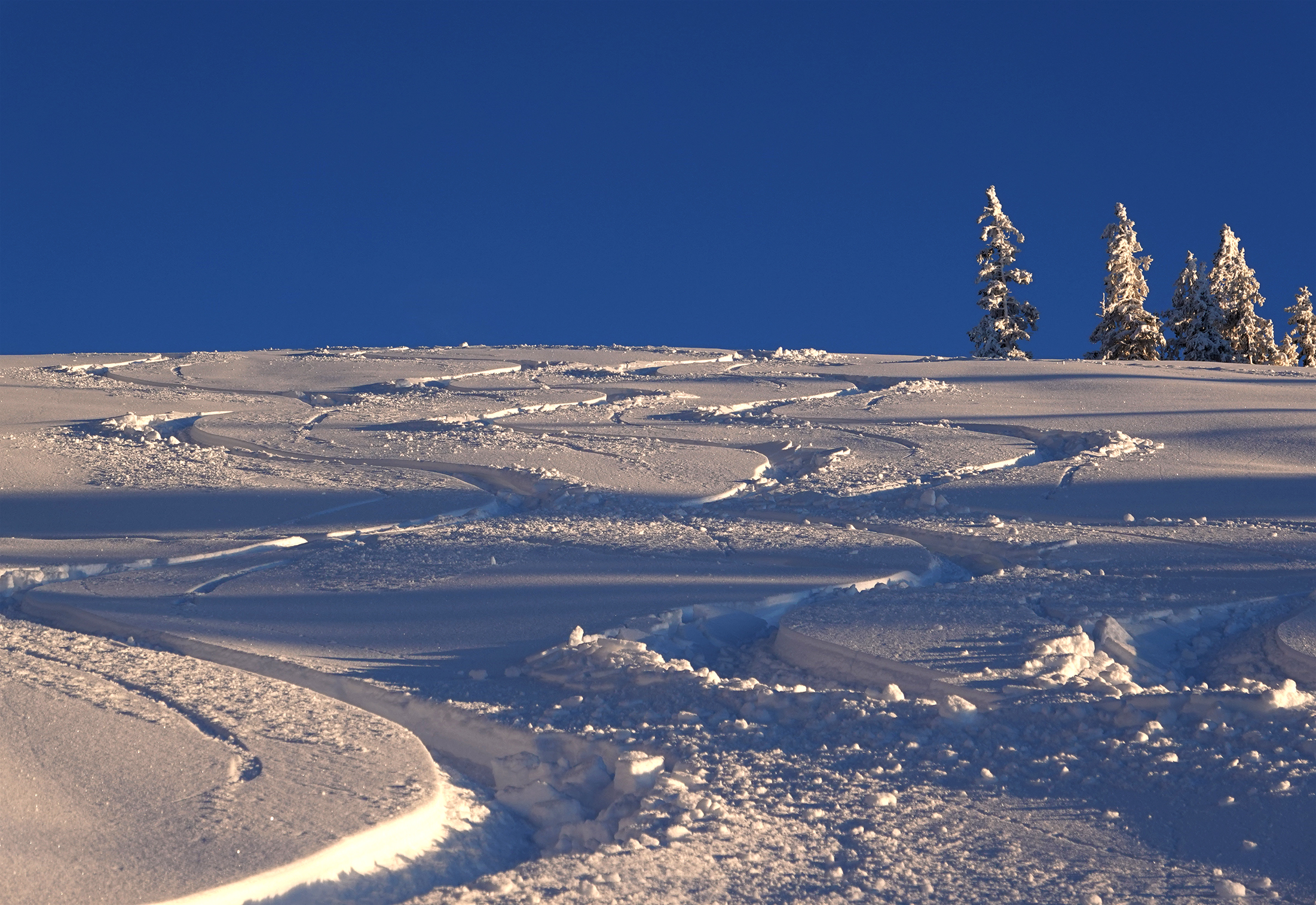 Bis zu einem halben Meter Pulverschnee, der schon gut fahrbar war, weiter unten schon etwas gesetzt. Keine Windzeichen an der Schneedecke.