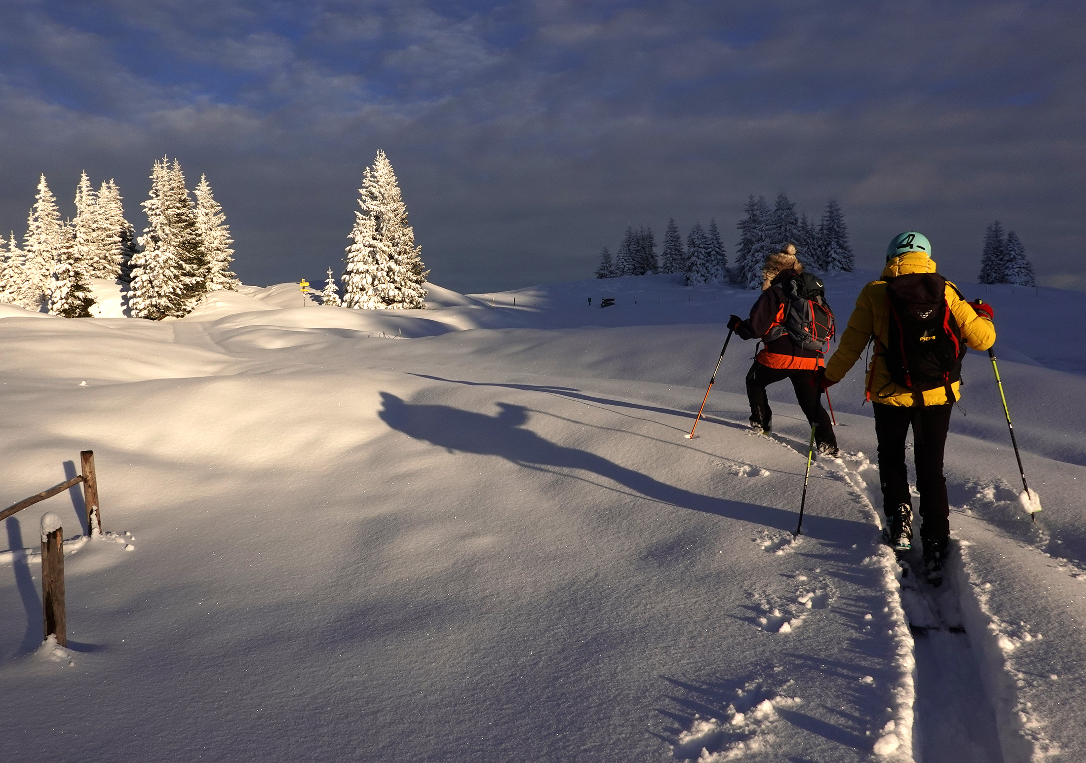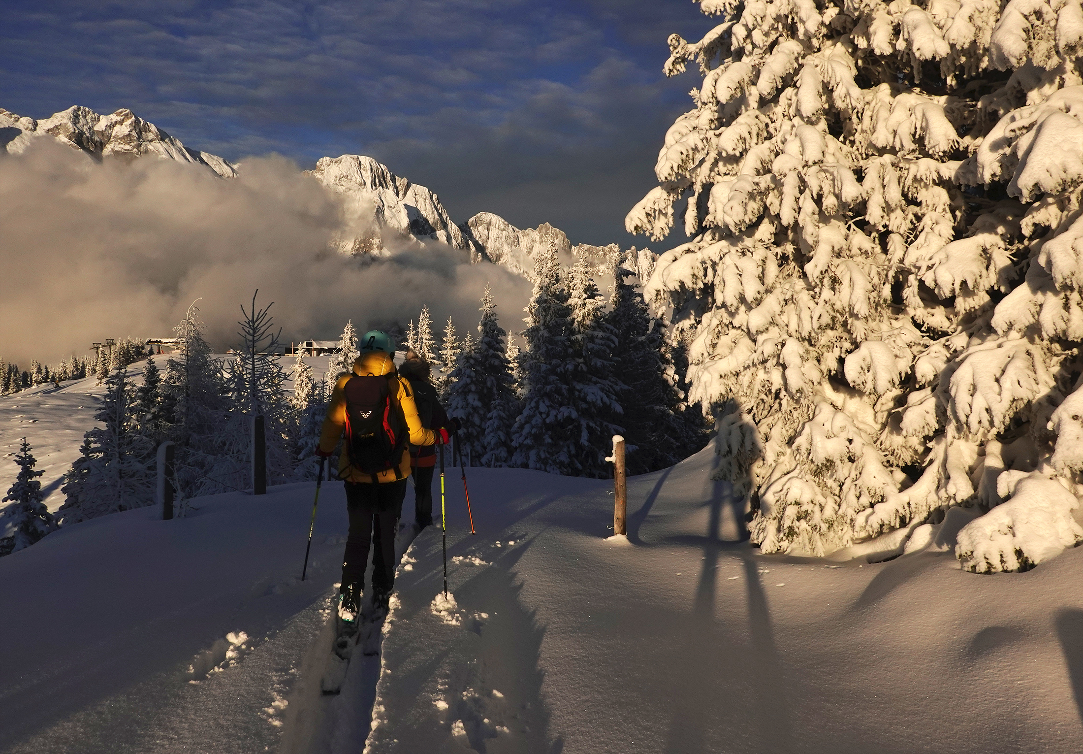 Gemütliche Skiwanderung auf und zwischen den Pisten über dem Deant'ner Sattel. Der späte Start hat sich mal wieder gelohnt.