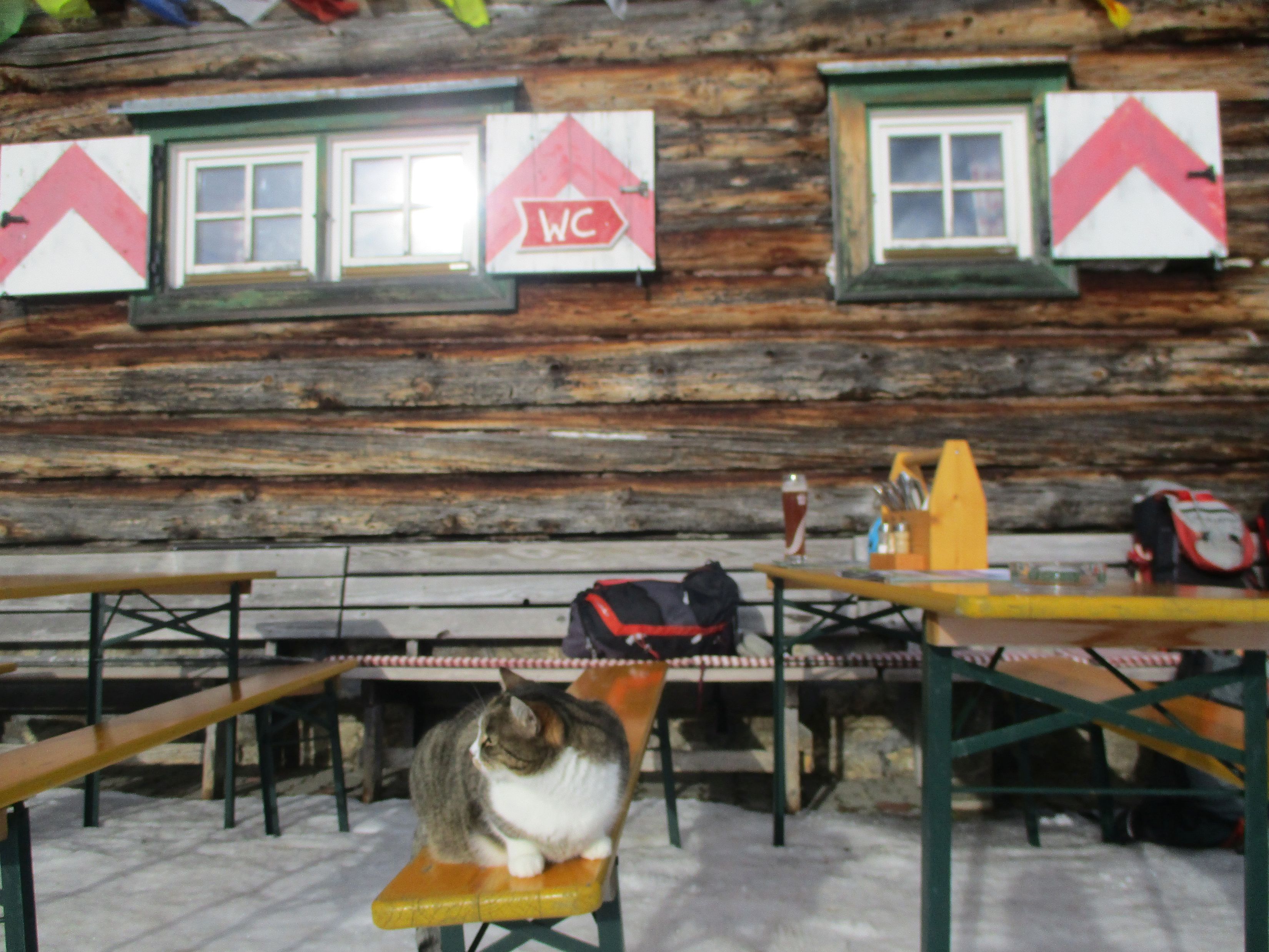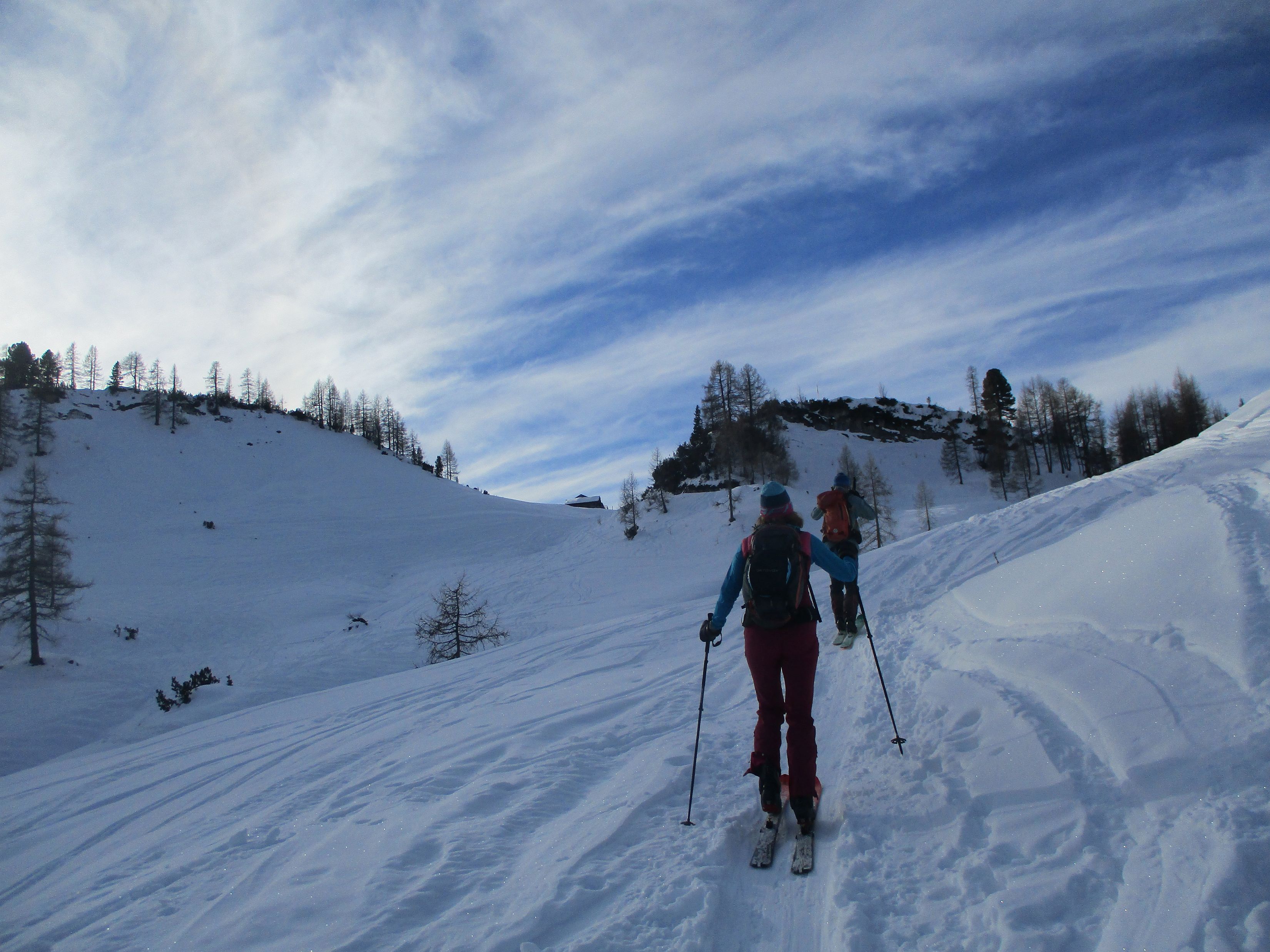Die Schneedecke auf der Straße von der Vordergnadenalm zur Südwienerhütte ist hart und griffig. Die Südwienerhütte hat geöffnet. Der Aufstieg zum Spirzinger war heute ein Latschenslalom, die Abfahrt verspurt und ungut zu fahren. ein gutes Training für die Oberschenkel. Nach dem schattigen Straßenzustieg ab der Südwienerhütte großteils Sonne und milde Temperaturen, Wind heute kein Thema.
