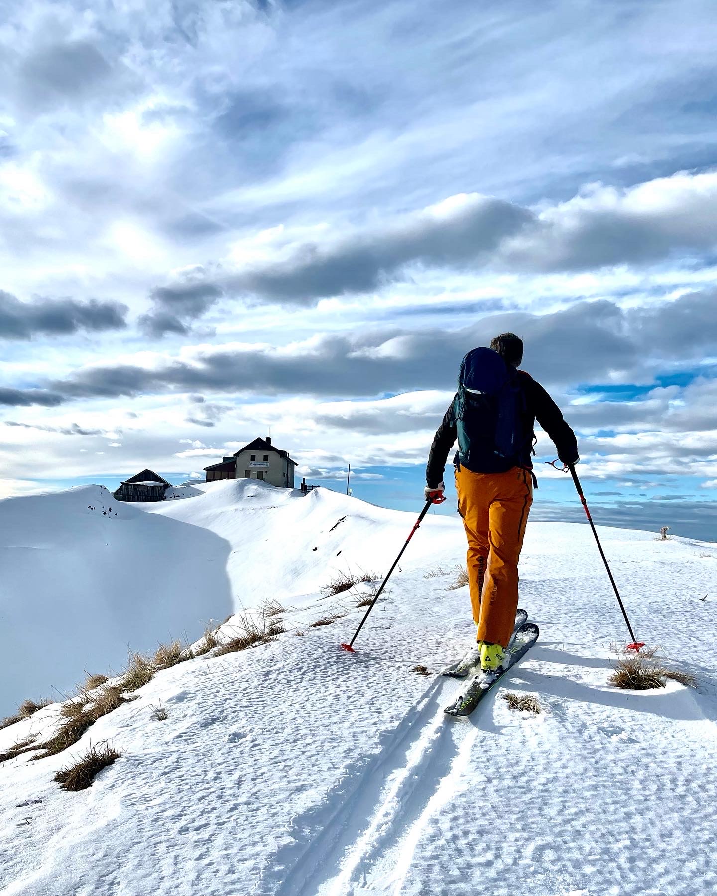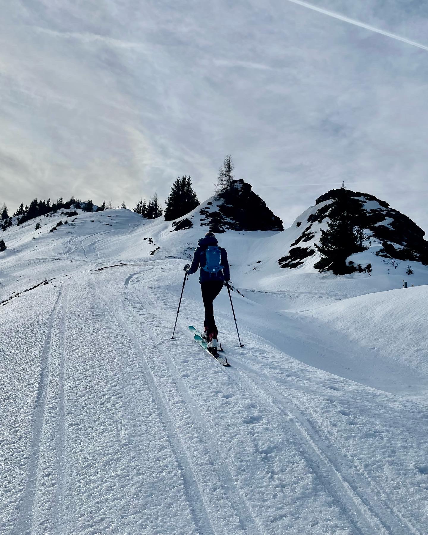 Von der Bergstation der Aberg Bergbahnen am Langegg zum Hundstein. Bis hierher kann man natürlich über diverse Aufstiege entlang der Skipisten aufsteigen. Die Schneedecke ist tragfähig! Südseiteig kann man gut vom Langegg bis zum Anfellplatz abfahren. Es führt eine gute Spur bis zum Statzerhaus. Wir sind zum Hundsteinsee gequert und über den steilen Ostgrat in mehreren Spitzkehren zum Statzerhaus am Hundstein aufgestiegen. Dann ist es gleich eine richtige Tour. Wer ein gutes Auge und Gespür für gute Hänge hat kann in den Ostflanken des Hundsteinsee kurze, aber gute Abfahrtsmöglichkeiten finden. Wir sind dann wieder über diverse kleinere Hänge mit kurzen Gegenastiegen zurück ins Skigebiet gelangt. Über die Skipisten wieder zurück zum Ausgangspunkt in Hintermoos. Eine Talabfahrt im Gelände ist nicht zu empfehlen.