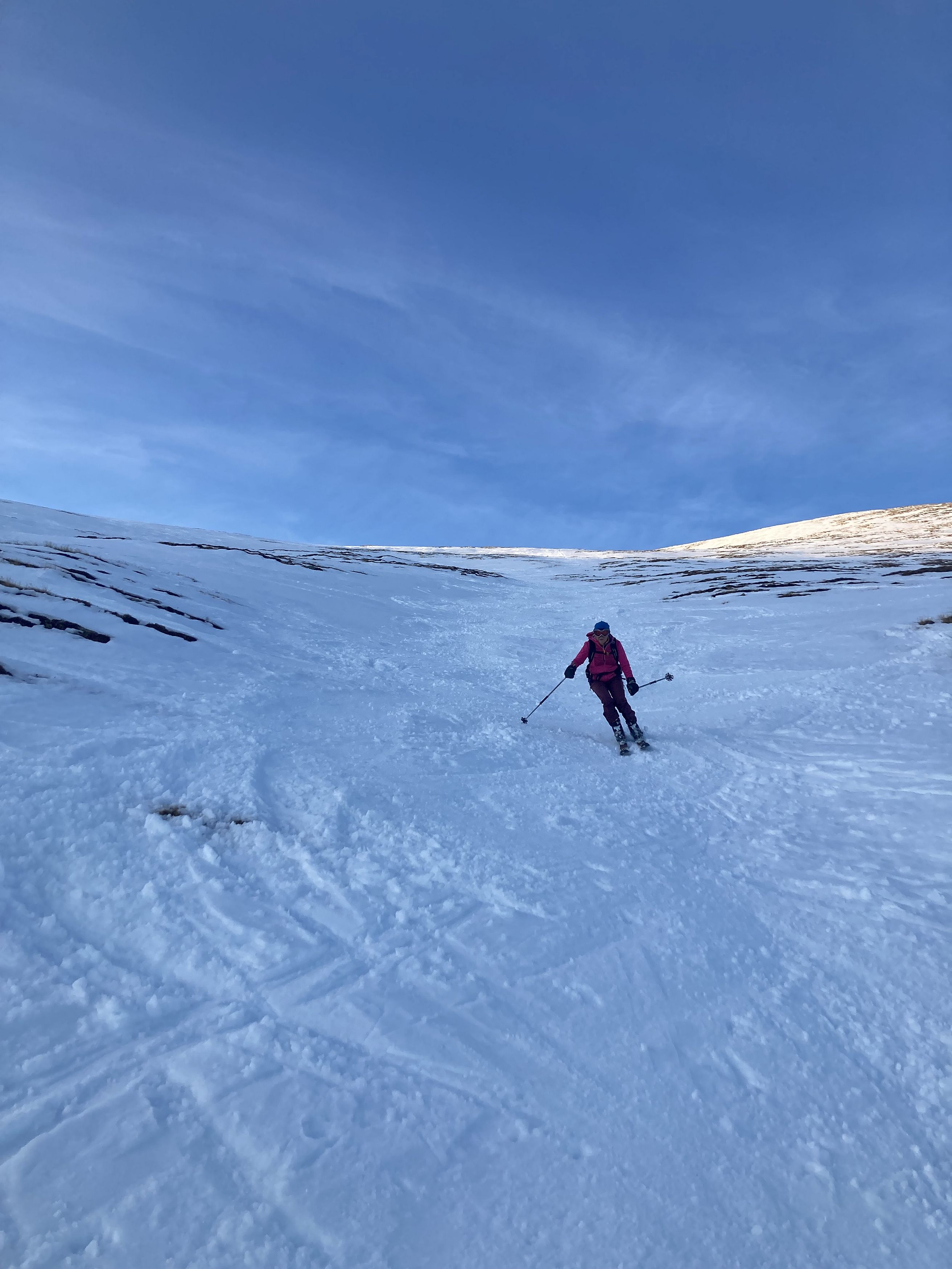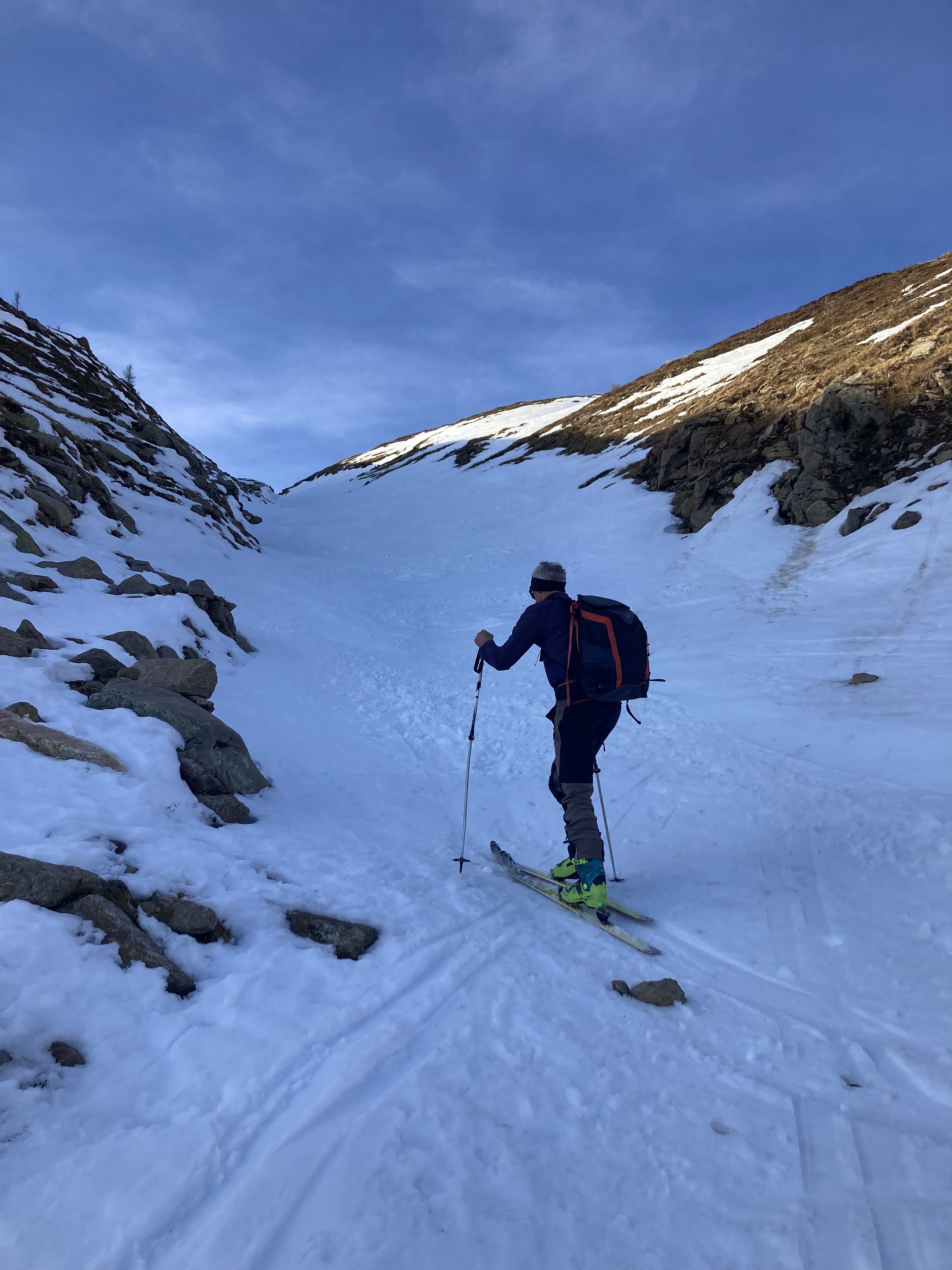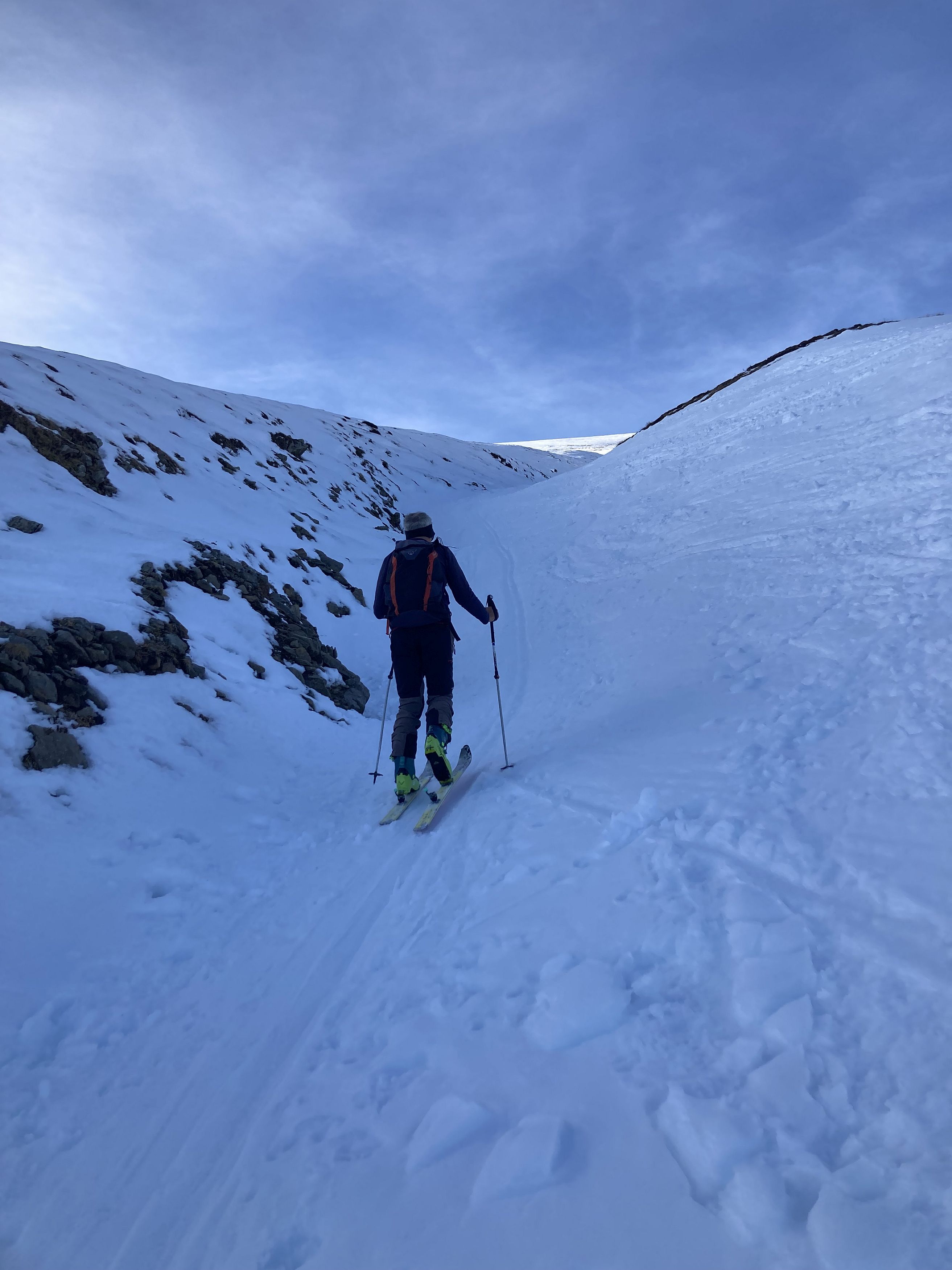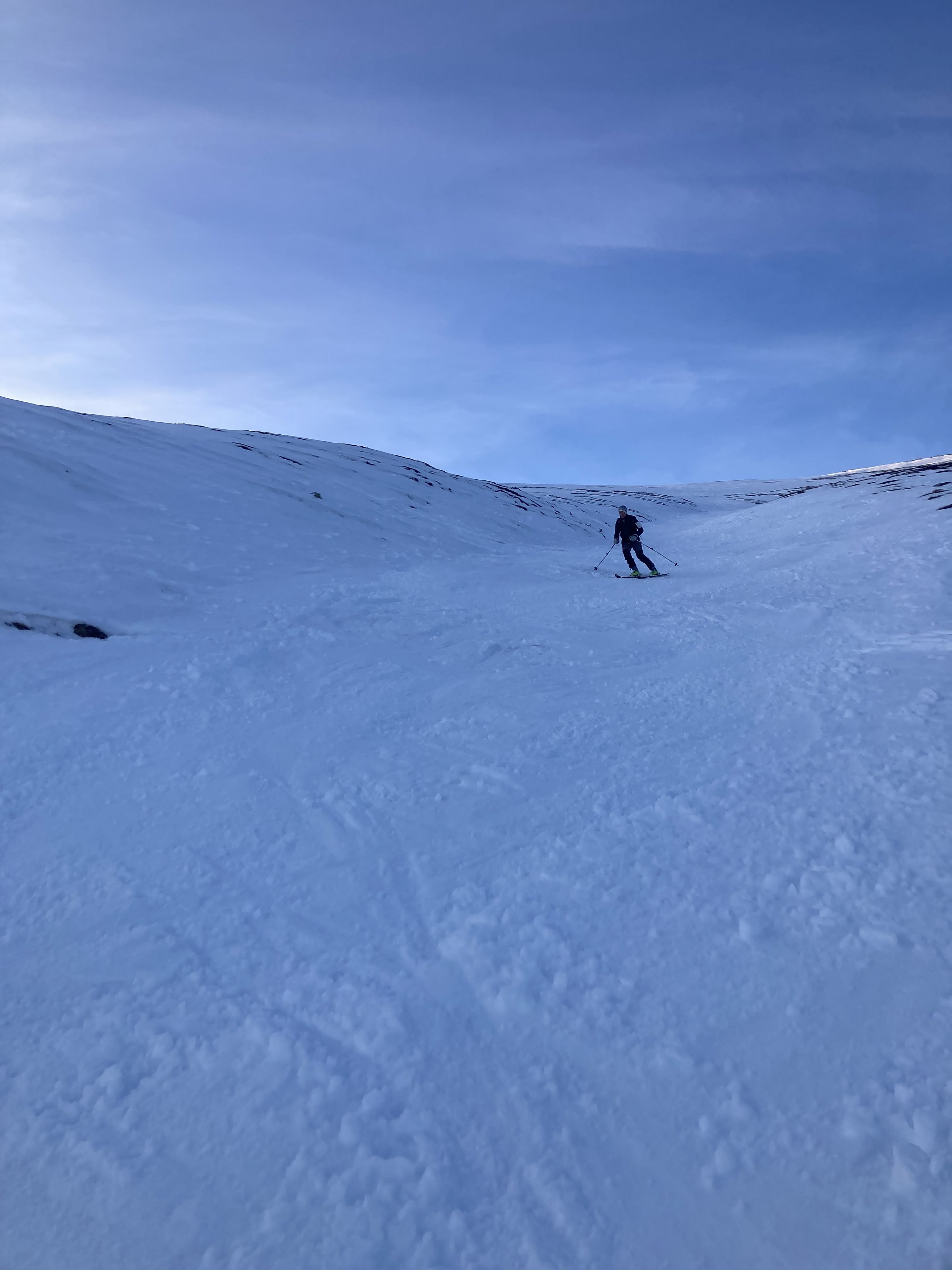 In der Rinne kompakte Schneelage, im Gelände wechselhaft wird auch weniger, daher ist vorsichtige Fahrweise angesagt.