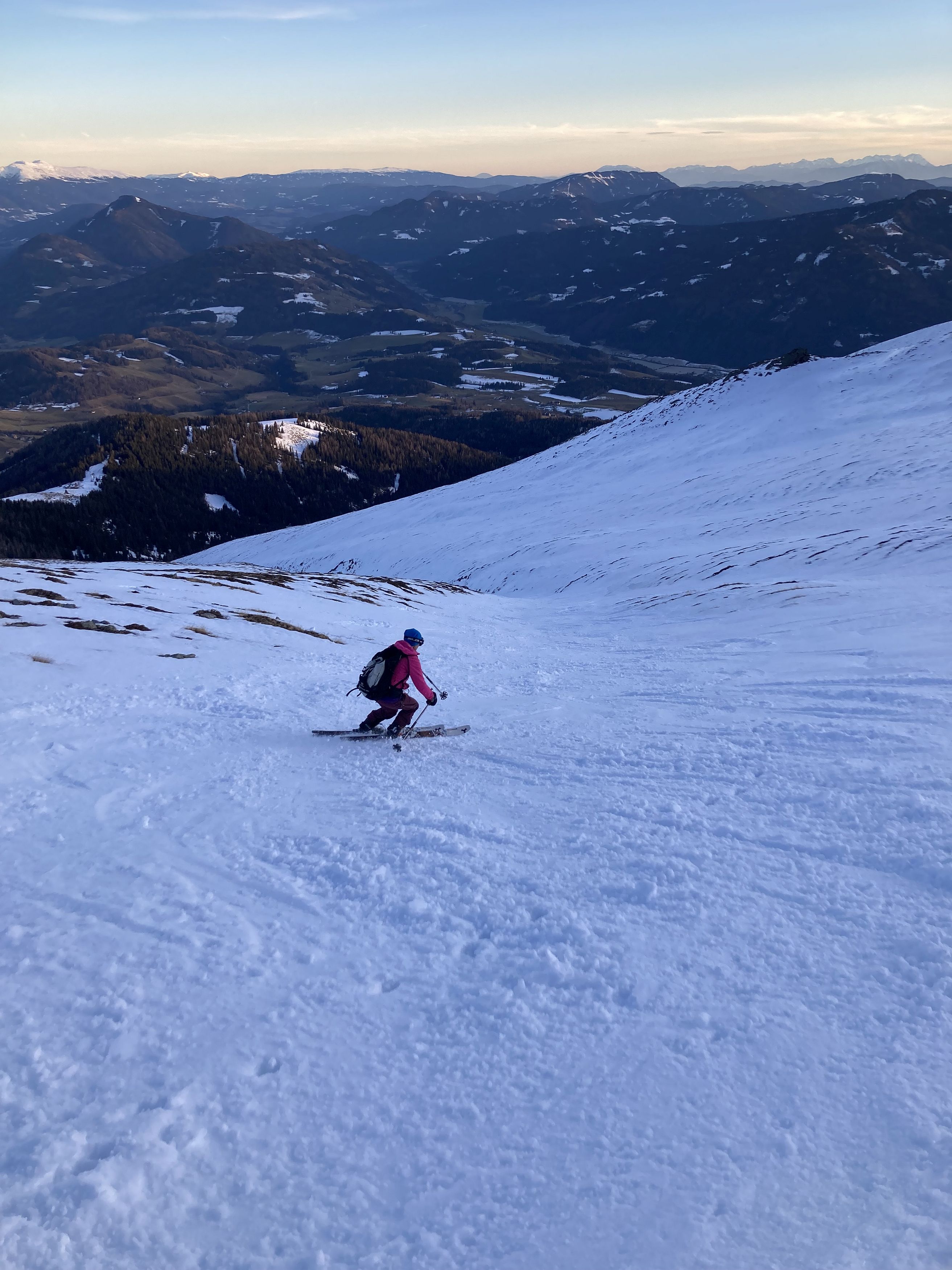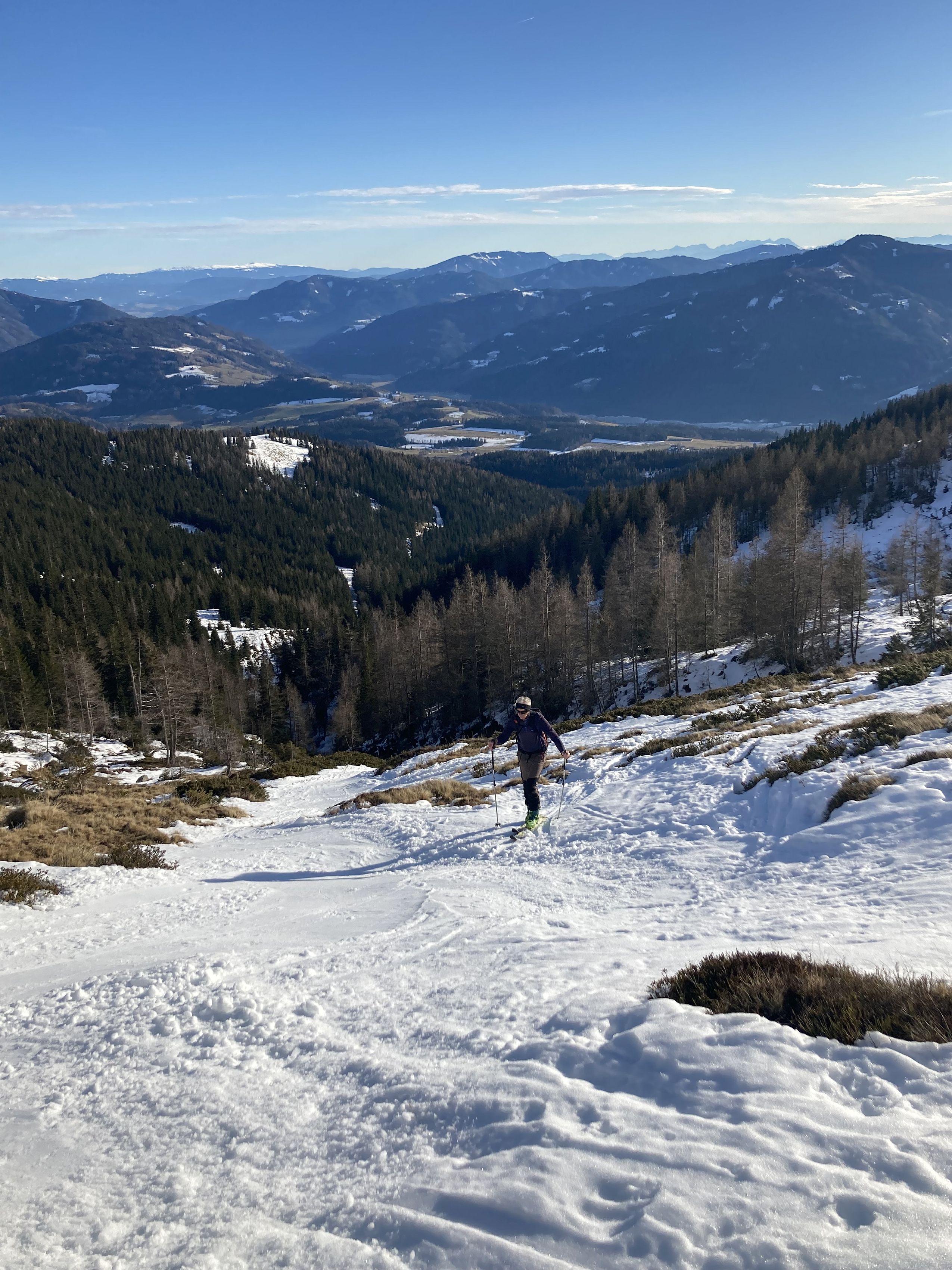 Die Straße zum Parkplatz Greimhütte ist stellenweise Schneebedeckt und eisig.Die Ski können schon am Parkpklatz angeschnallt werden, der Weg zur Greimrinne hat einige kurze Unterbrechungsstellen und am Ende eine ca 50m lange tragestelle. Milde Temperatur ,deshalb gute Aufstiegsverhältnisse ,sind bis zum Gipfel mit den Ski gegangen. Wie derzeit überall - eine magere Schneedecke.