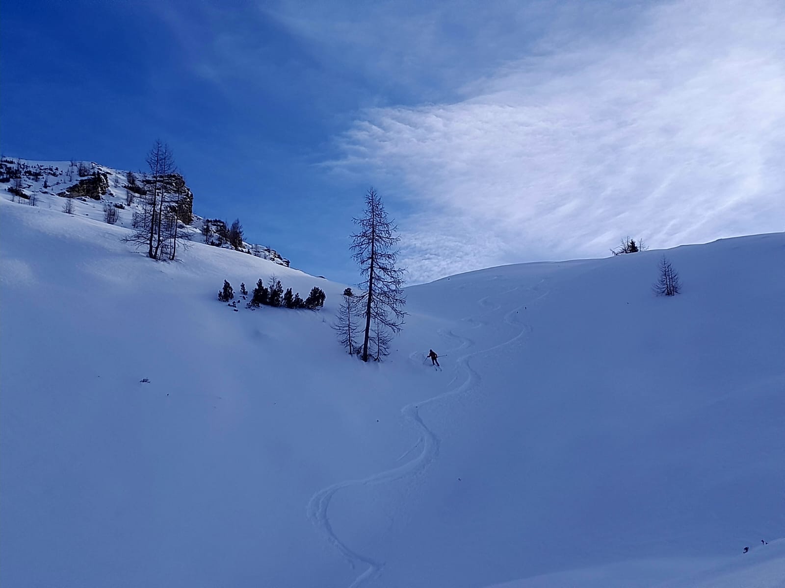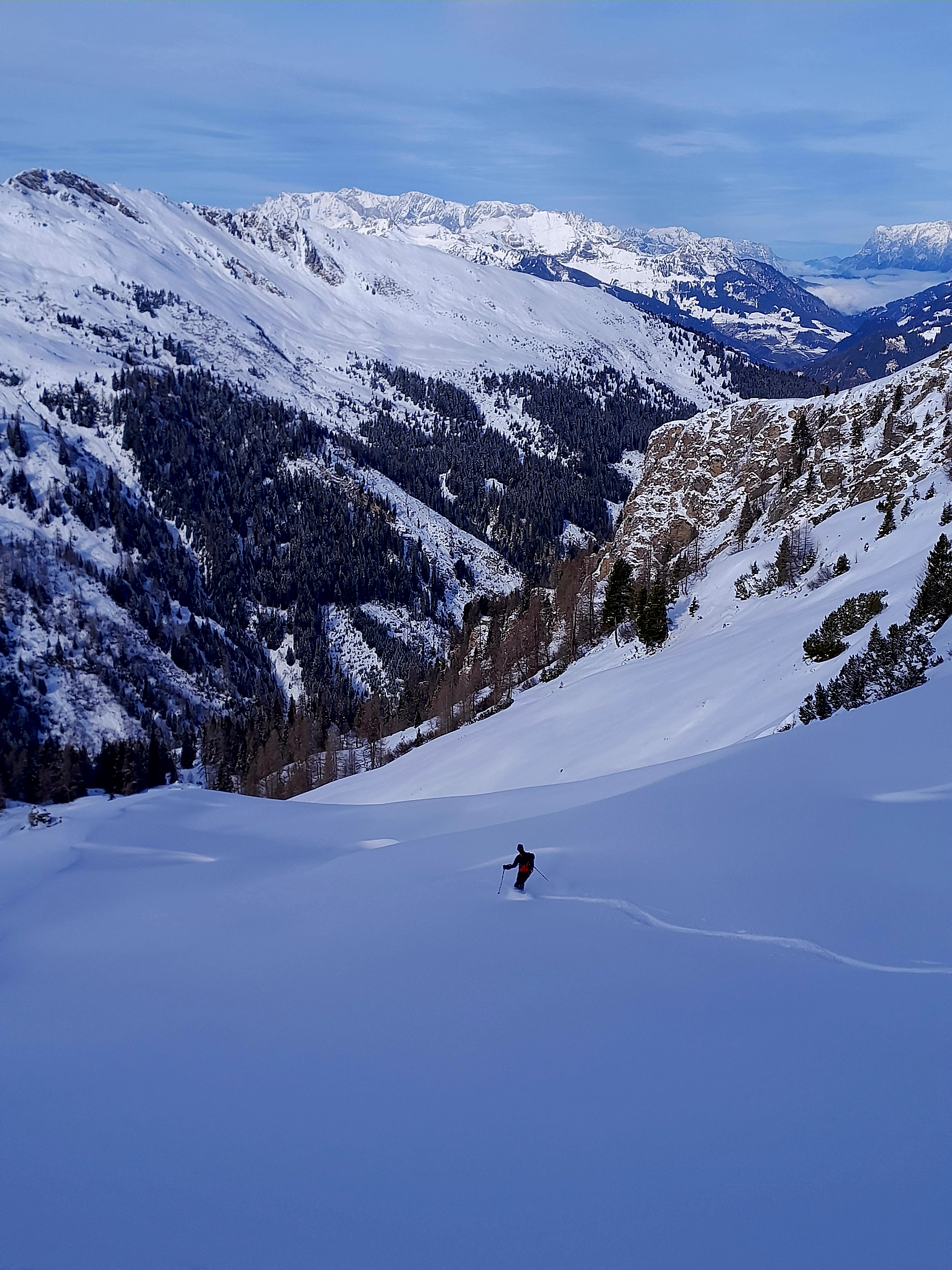 Los gehts vom Reitalmparkplatz, wir starten aber in den Hubalmgraben. Lange Forststraße bis zur Vorderkaseralm, weiter zur Hinterkaser und über sanfte Almböden zur Scharte. Man sieht gut die schönen Spuren vom Gamskarkogel. Abfahrt in den Reitalmgraben, überraschenderweise unverspurt.