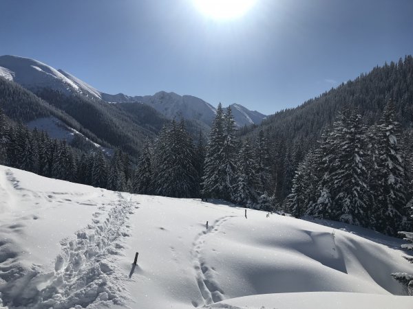 Von der Bergerhube weg ausgezeichnete Schneelage. Enormer Andrang bei diesem Traumtag. Dennoch gibt es ausreichend Parkplätze.