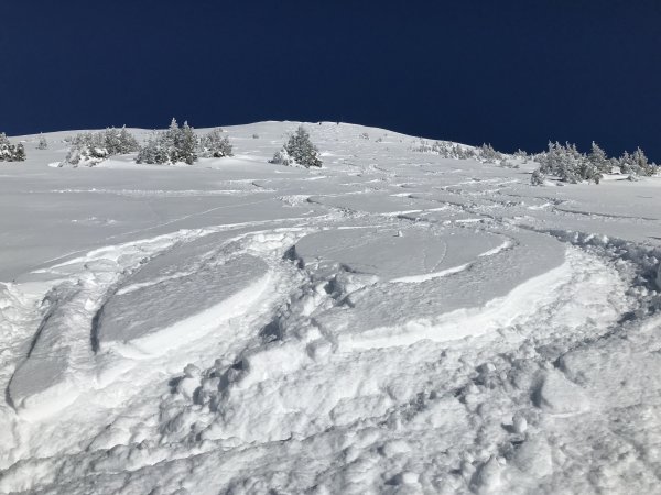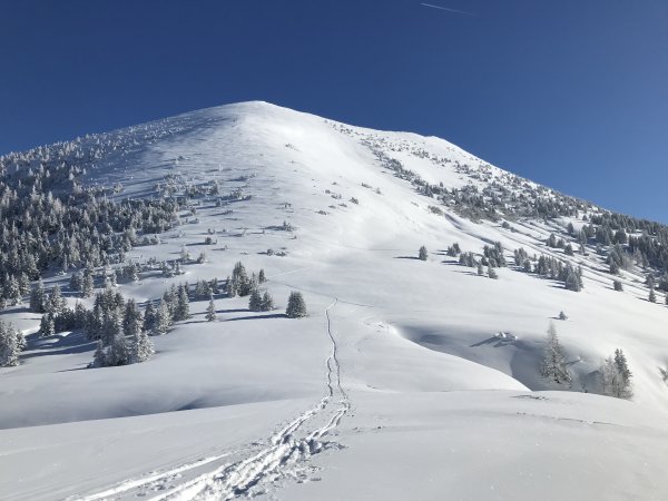 30 Zentimeter frischer Pulver ohne Windeinfluss garantierten heute einen Traumtag. Die Abfahrt erfolgte heute direkt vom Gipfel weg über den Südwesthang.