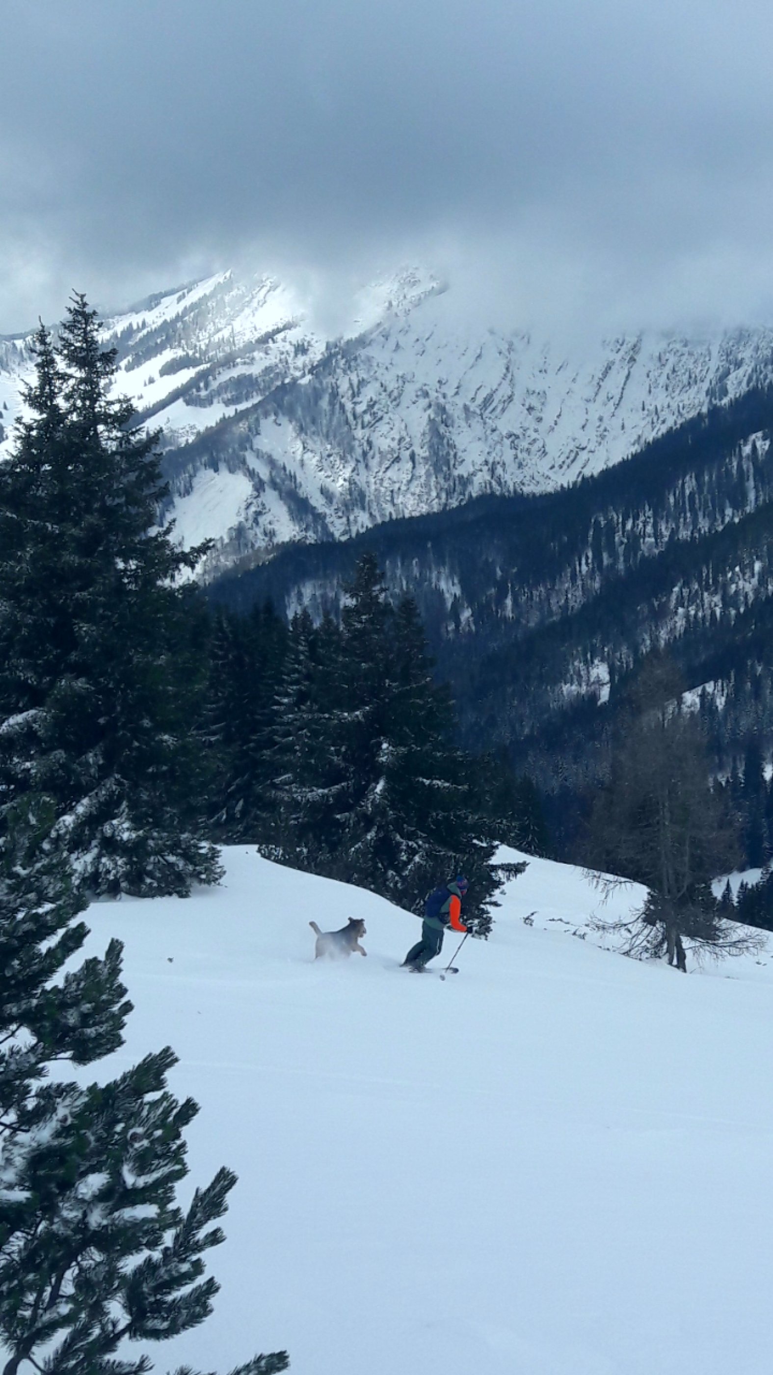 Auf den Spuren des Sturms heute den Wolkenvorhang etwas gelüftet. Vormittags noch Hochnebelbewölkung ab 1800m, die sich bis mittags auflöste und der Sonne mit blitzblauem Himmel Platz machte. Wind lebhaft und saukalt. Klaus hat die Verhältnisse gestern schon differenziert geschildert - heute waren dann ca. 5-10 cm Graupelgrieselschnee auf dem Harschdeckel. Die Spürnase hat dann im nordwestexponierten steilen Hang unter der Wand noch federleichten Pulver gefunden ohne Deckel, ohne Makel, ohne Feindkontakt. Traumhaft !