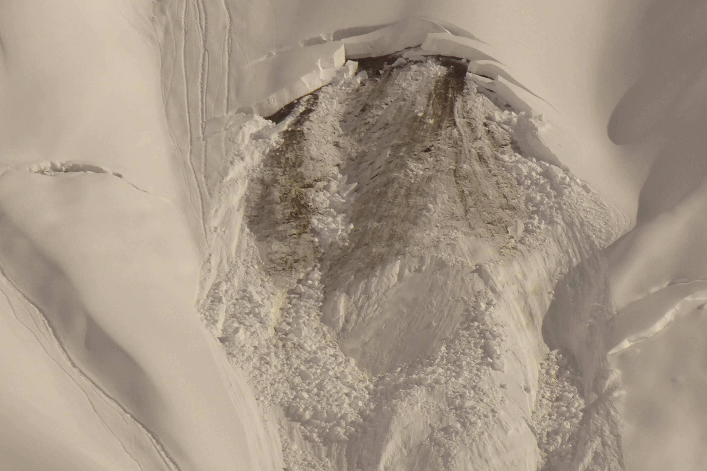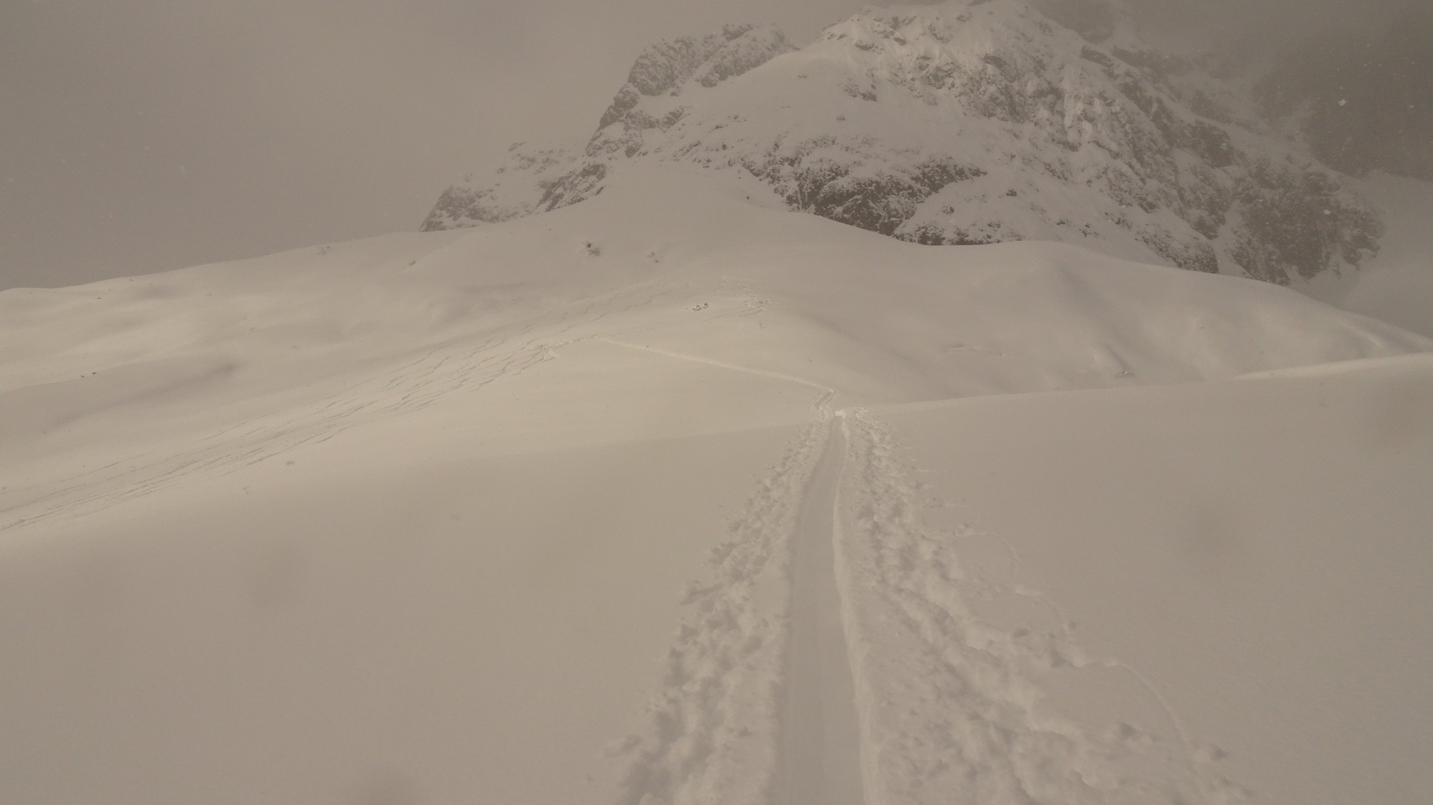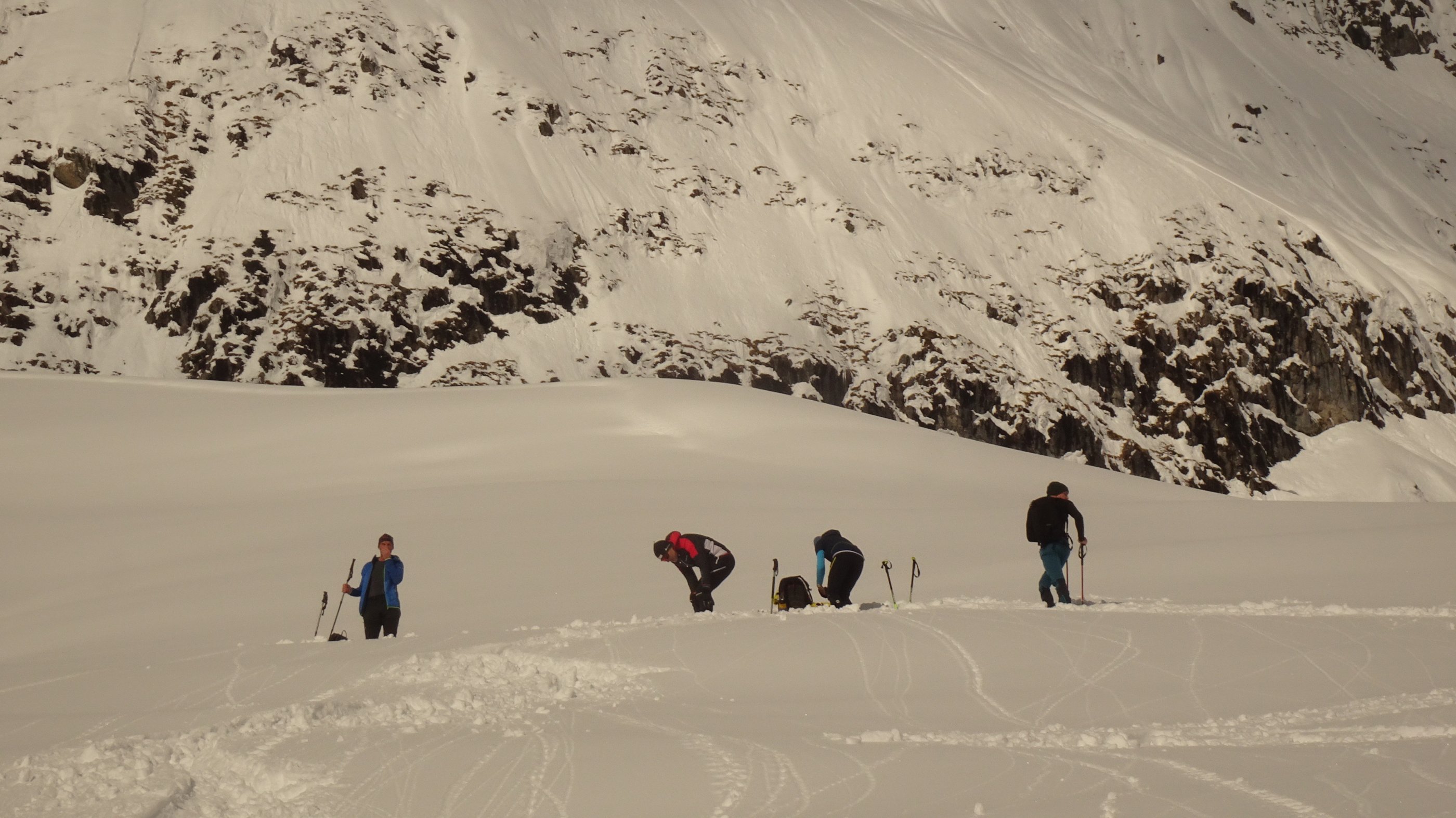 1 1/4 Meter gleichmäßiger Neuschnee liegt auf einem guten halben Meter Altschnee. Da die Sonne abgeschirmt wurde, kam aus den Felsen kaum Schnee. Ins Riedingtal sind schon während des Schneefalles Lawinen abgegangen.