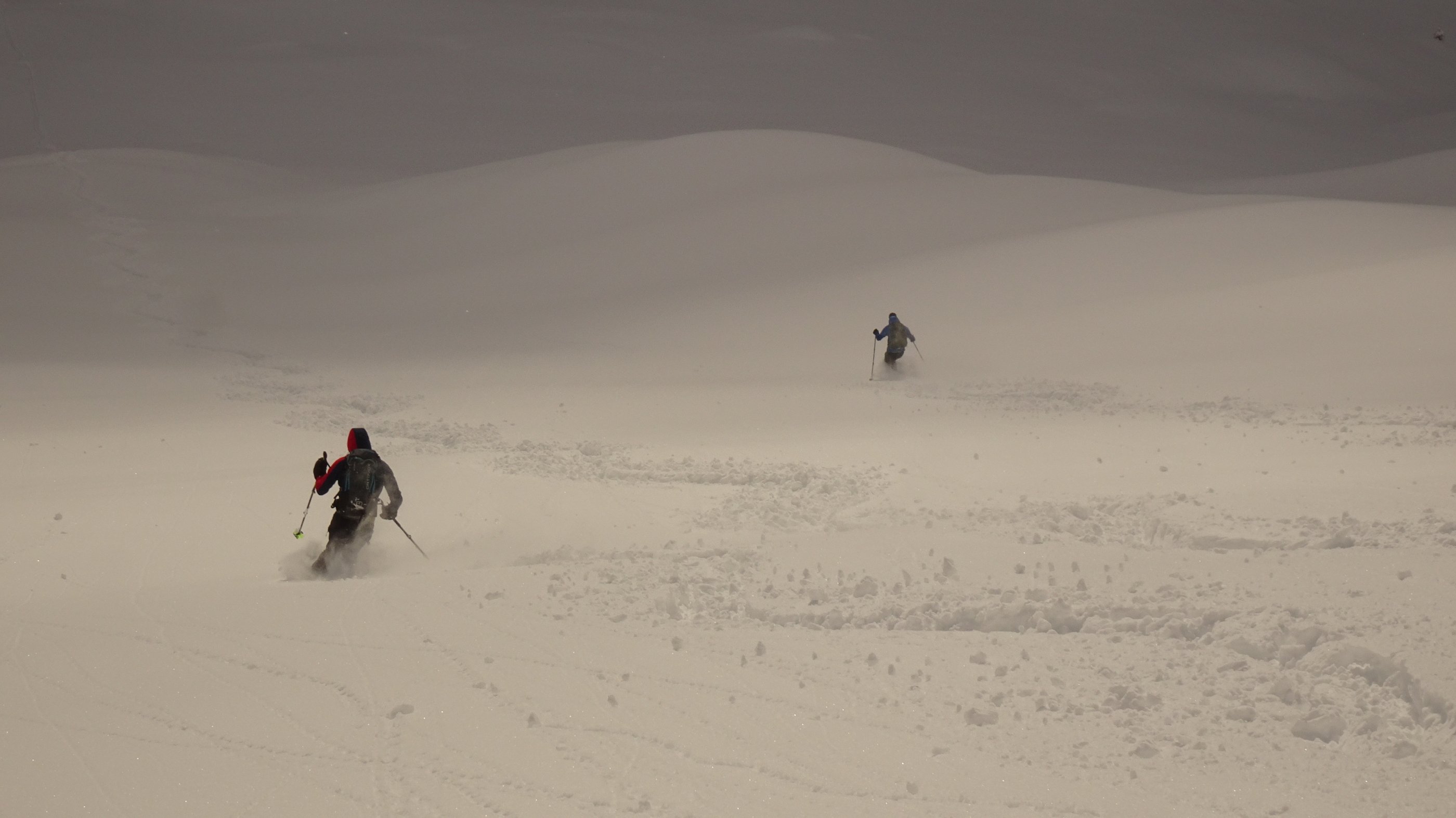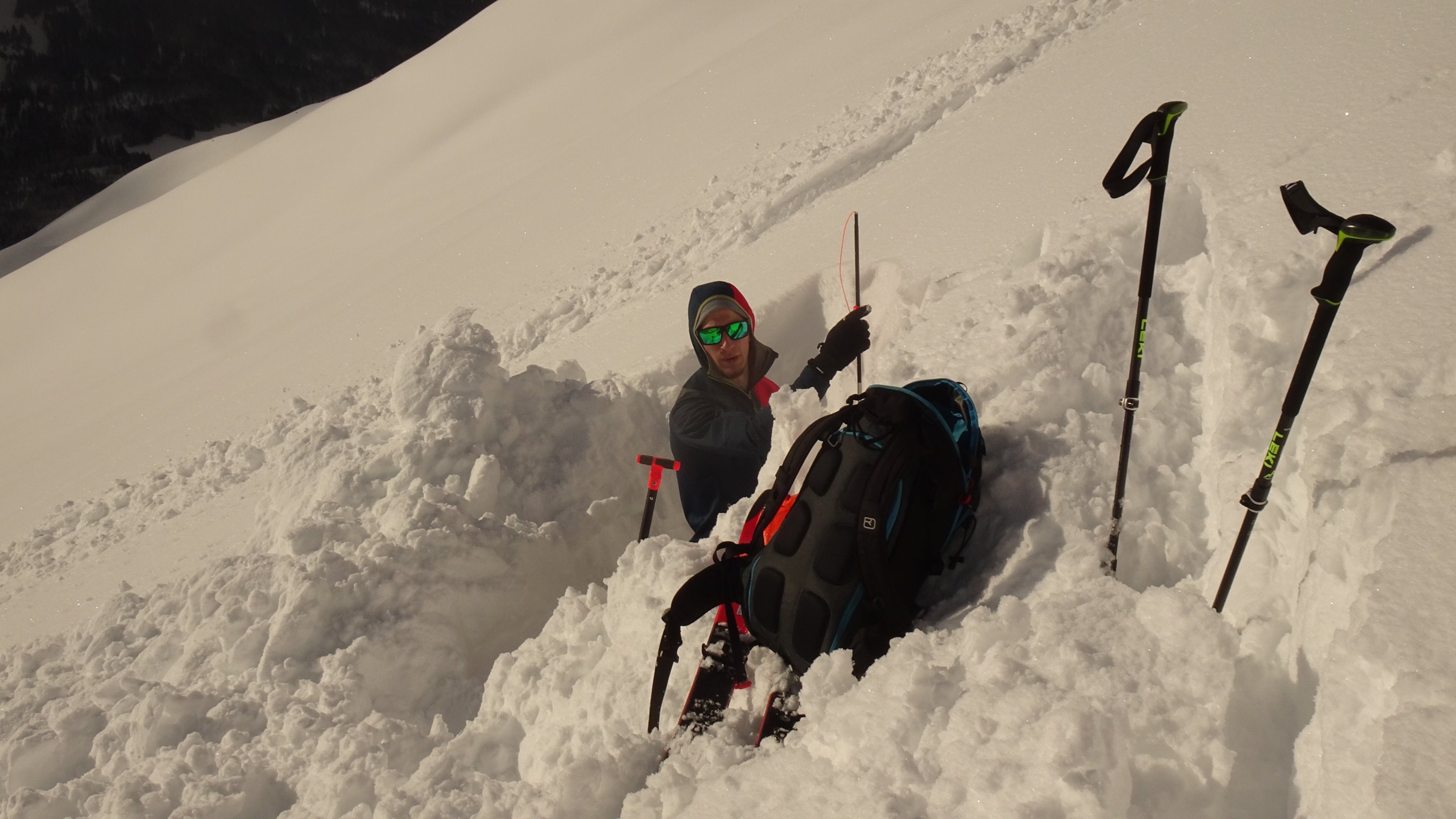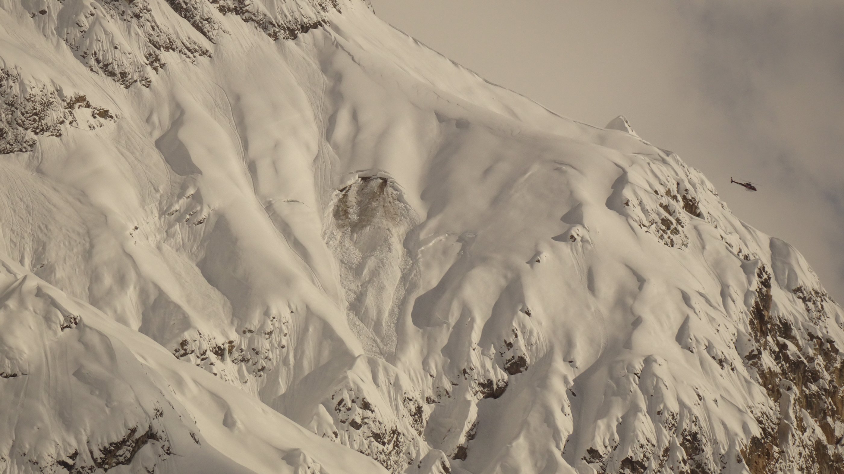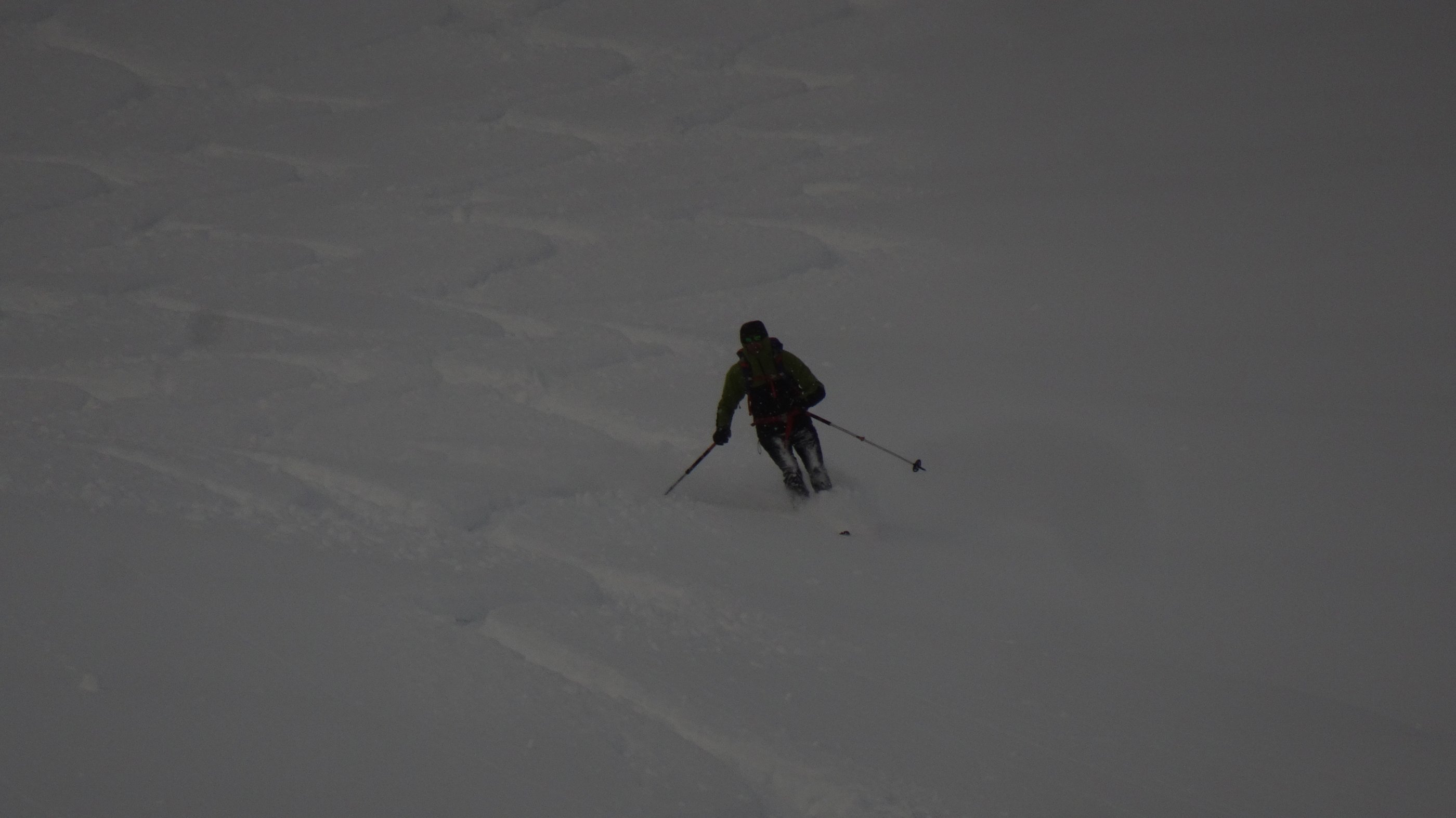 1 1/4 Meter gleichmäßiger Neuschnee liegt auf einem guten halben Meter Altschnee. Da die Sonne abgeschirmt wurde, kam aus den Felsen kaum Schnee. Ins Riedingtal sind schon während des Schneefalles Lawinen abgegangen.