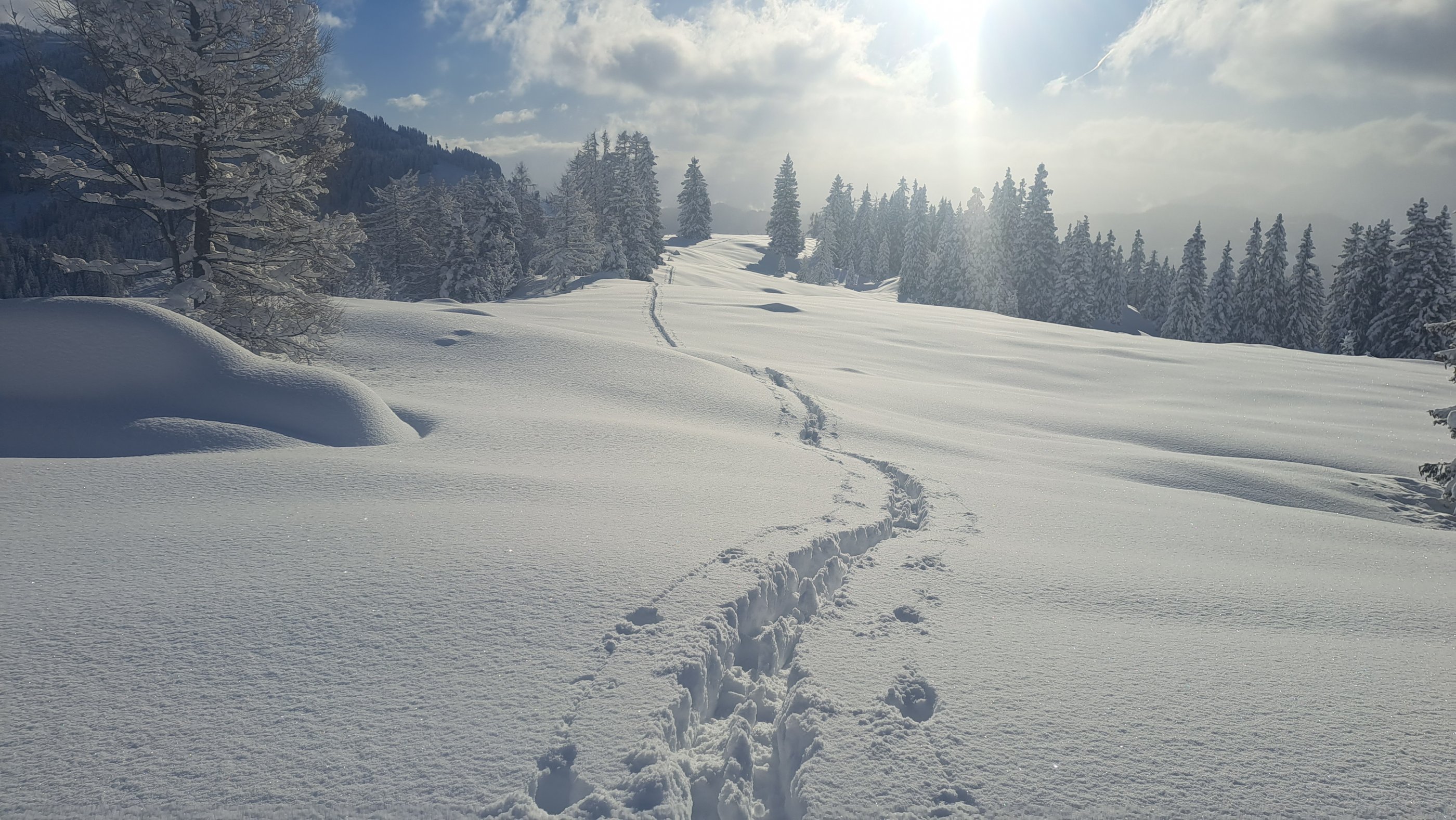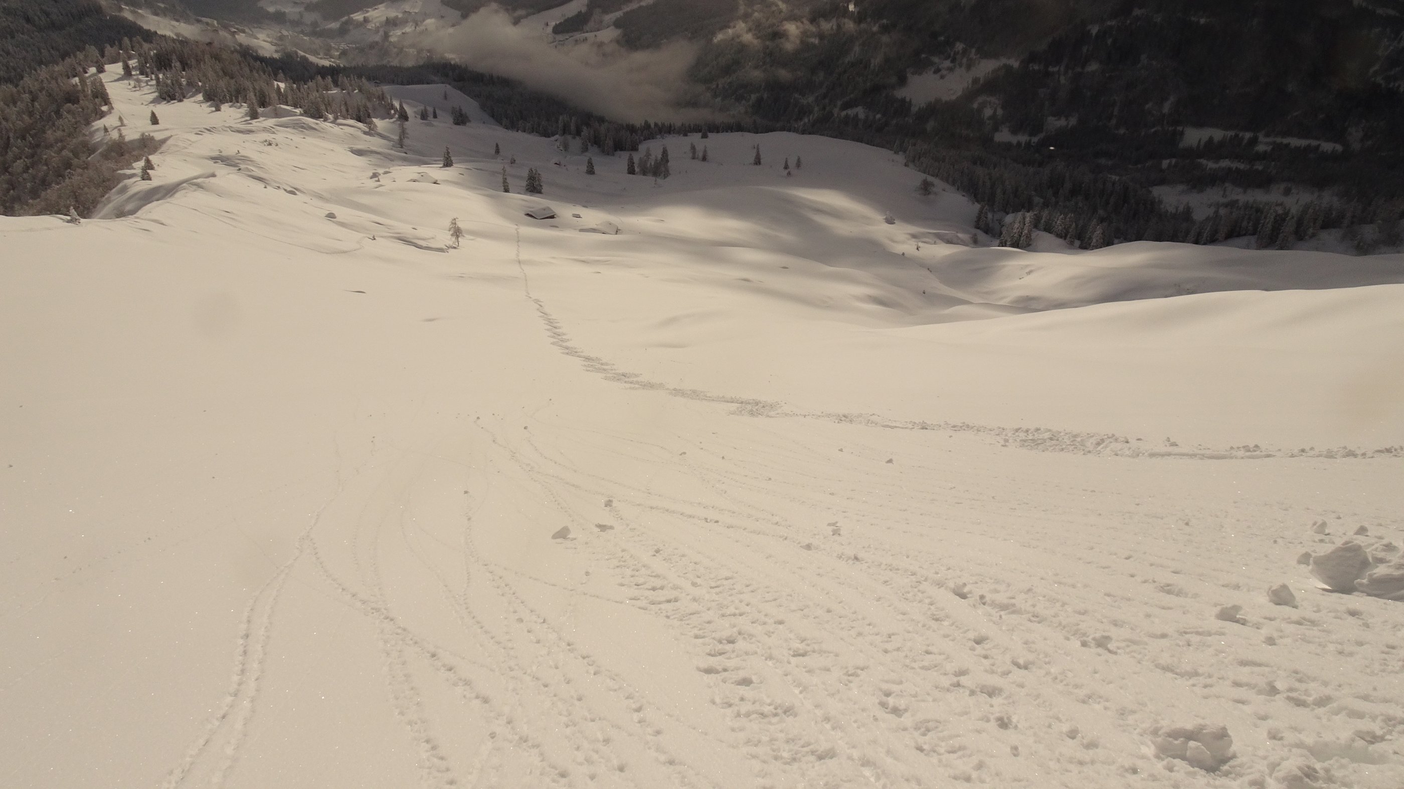Dort, wo ich im Sommer x mal hinaufgehe, nach unseren Kalbinnen zu schauen, gehen wir heute Schifahren. Die Wolken haben uns den Pulferschnee konserviert, so hatten wir nach ein paar mal rauf und runter auch noch einen schönen Schnee. Wir blieben rechts um nicht in der Falllinie eventueller Lawinen aus den Felswänden unterwegs zu sein.