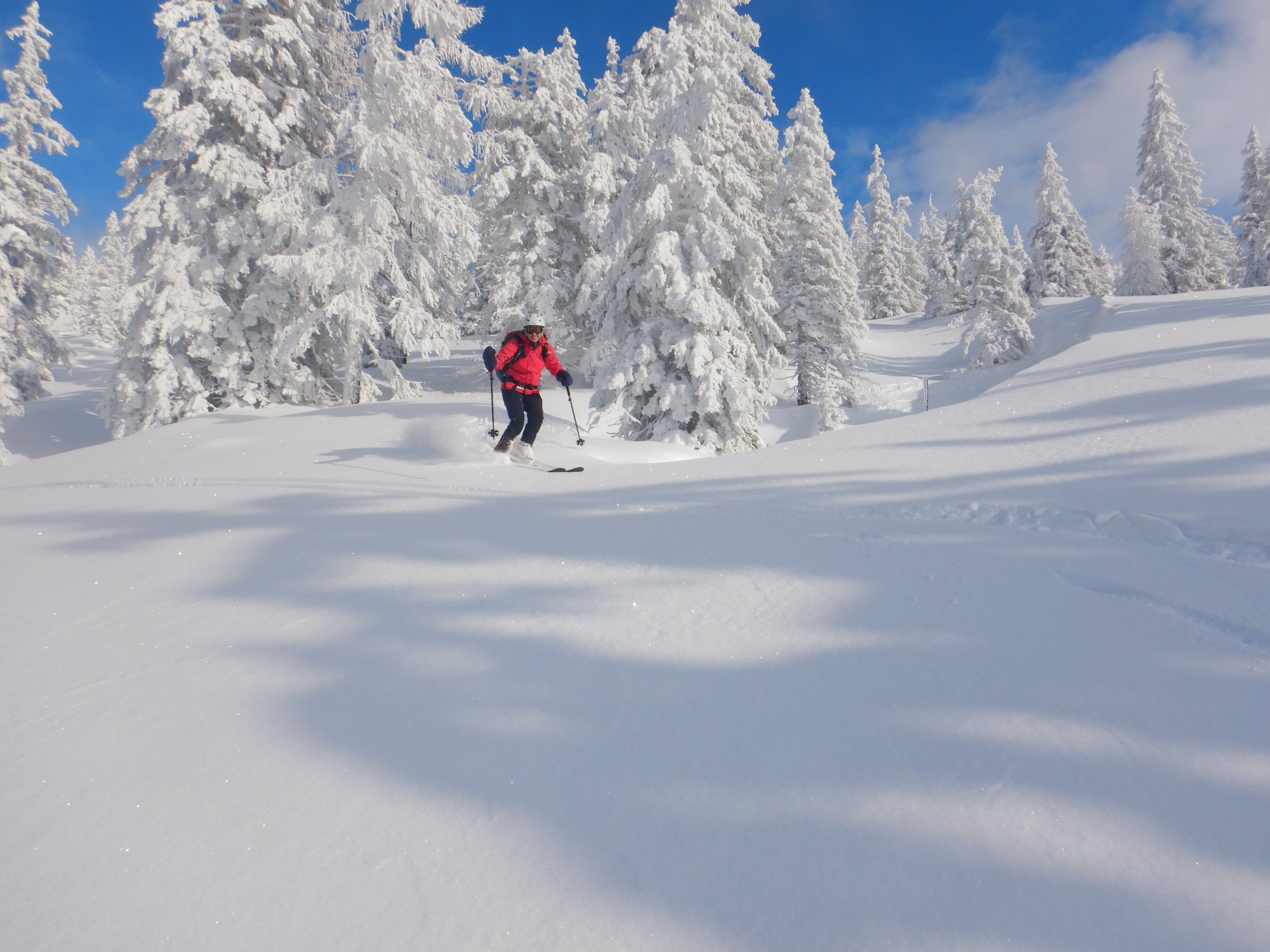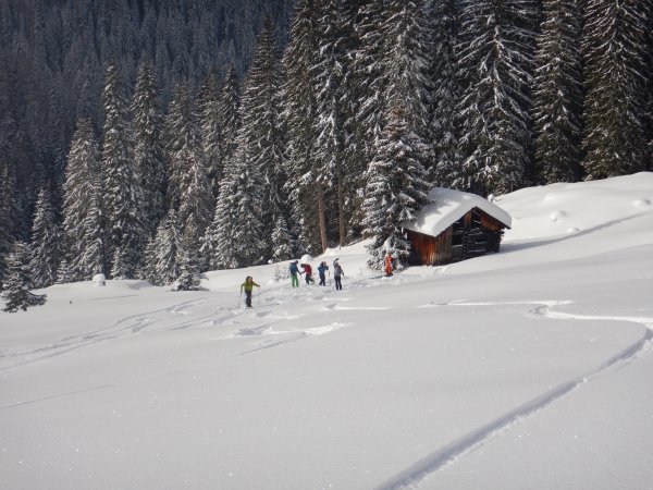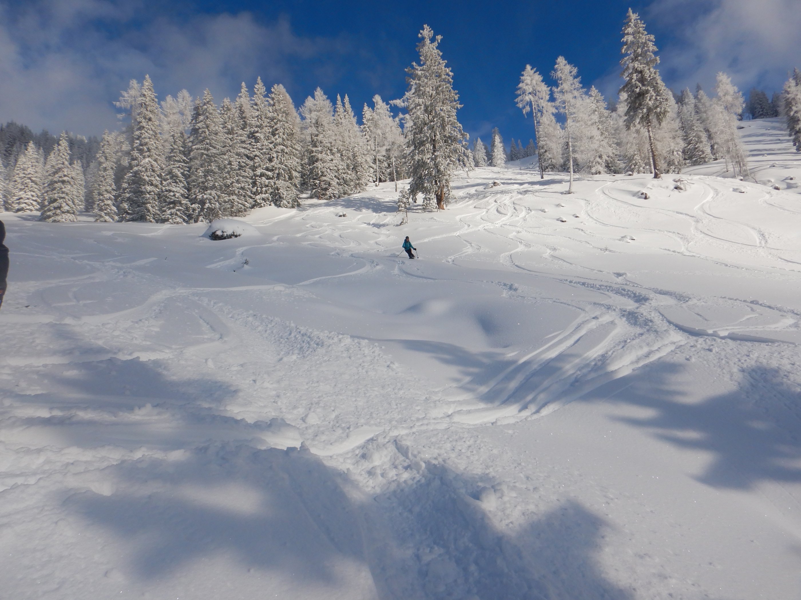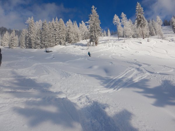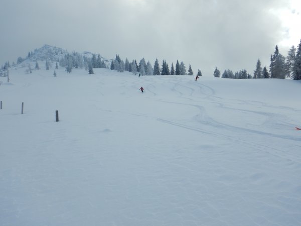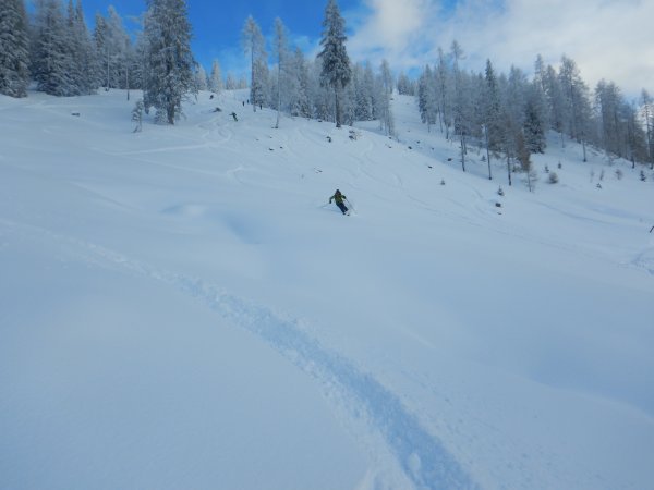 Pulver, großteils noch unverspurt. Unterhalb der Kammhöhen gut verteilt und großartig zu fahren. Gipfelkamm zum Hinteren Labeneck abgeblasen und wenig einladend