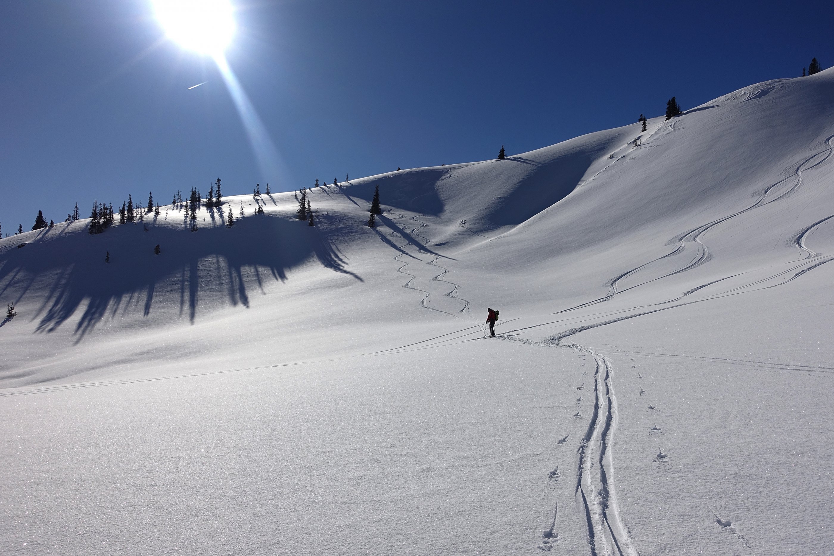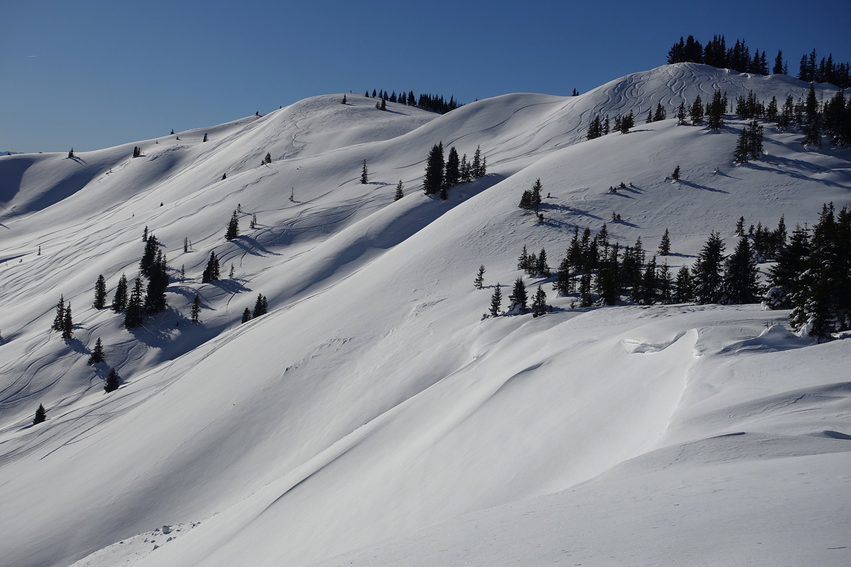 Sehr stabile Verhältnisse, wenn man die ganz steilen und zum Teil auch eingewehten und windgepressten Einfahrten meidet. Der Neuschnee von letzter Woche ist mit der Altschneedecke gut verbunden.