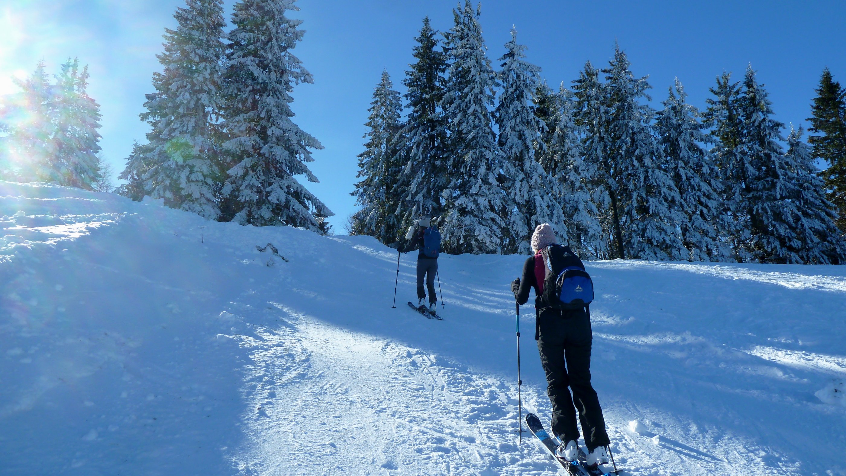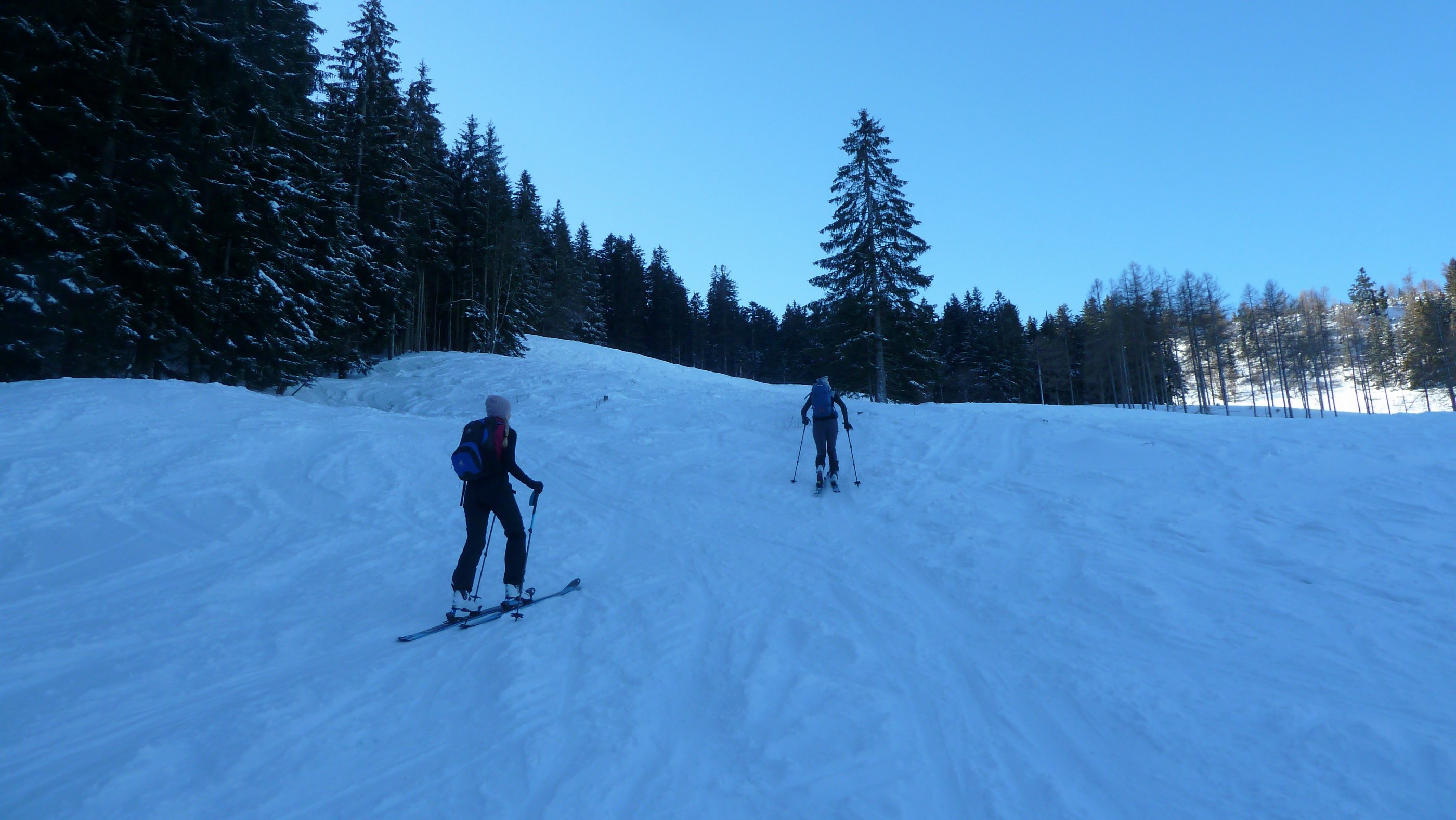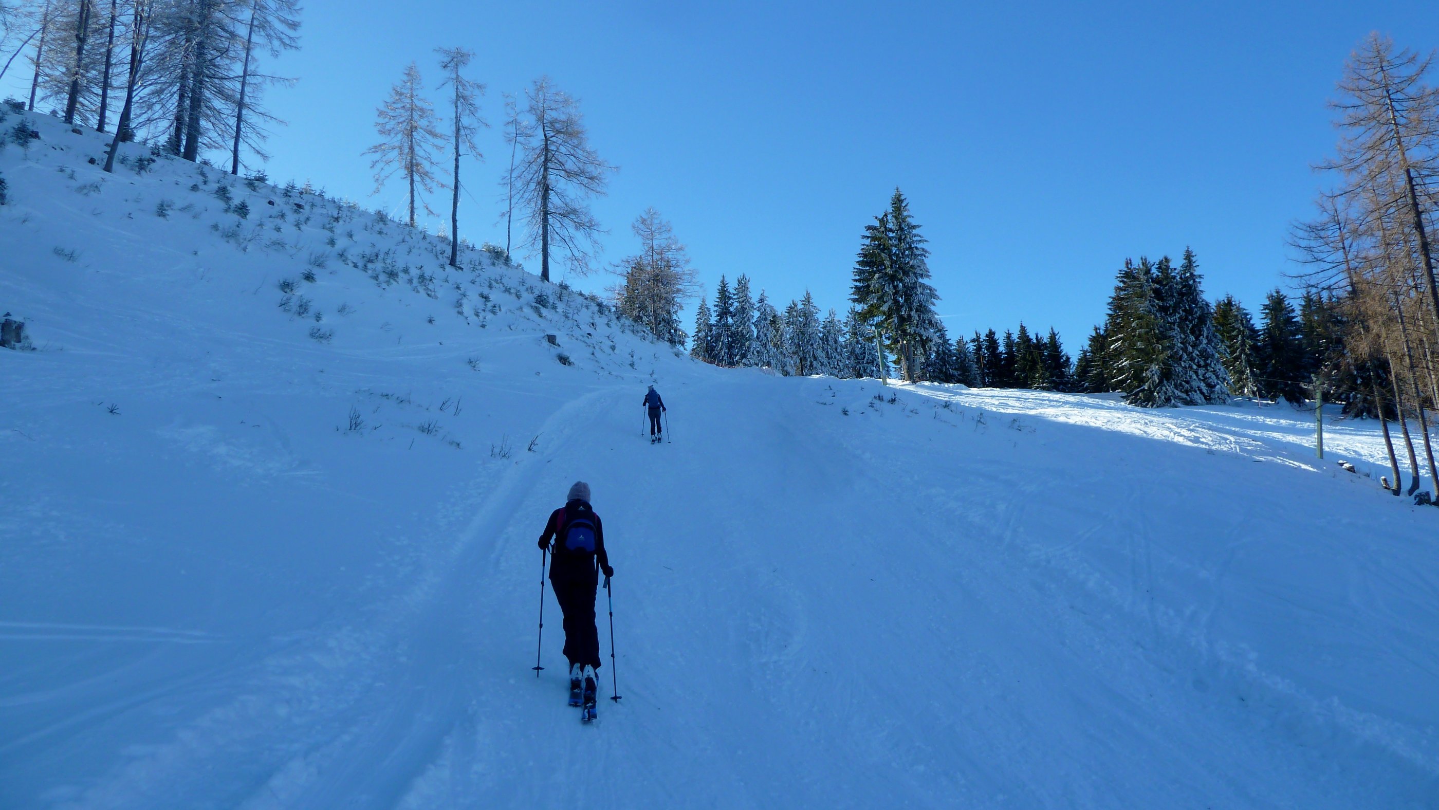 Start am Parkplatz Döllerer Wald, wo heute Mittwochfrüh nur eine gute Handvoll Autos stehen. Bei minus 13 Grad knirscht es unter den Schiern, dafür ist der eisige Südostwind bis zum Gipfelplateau kaum einmal zu spüren. Um den Gipfel ist es weniger abgeblasen, als man erwarten würde und auch der Hang zu den Oberwiesalmen ist gut mit Schnee versorgt und fast pistenmäßig festgefahren, wie übrigens auch der Großteil der Aufstiegsroute. Die Forststraße ist pickelhart.