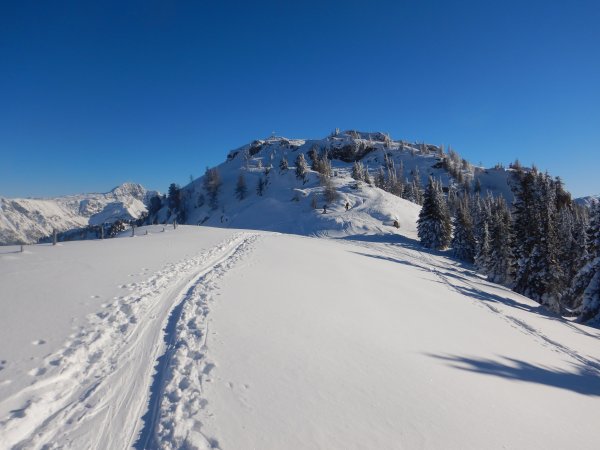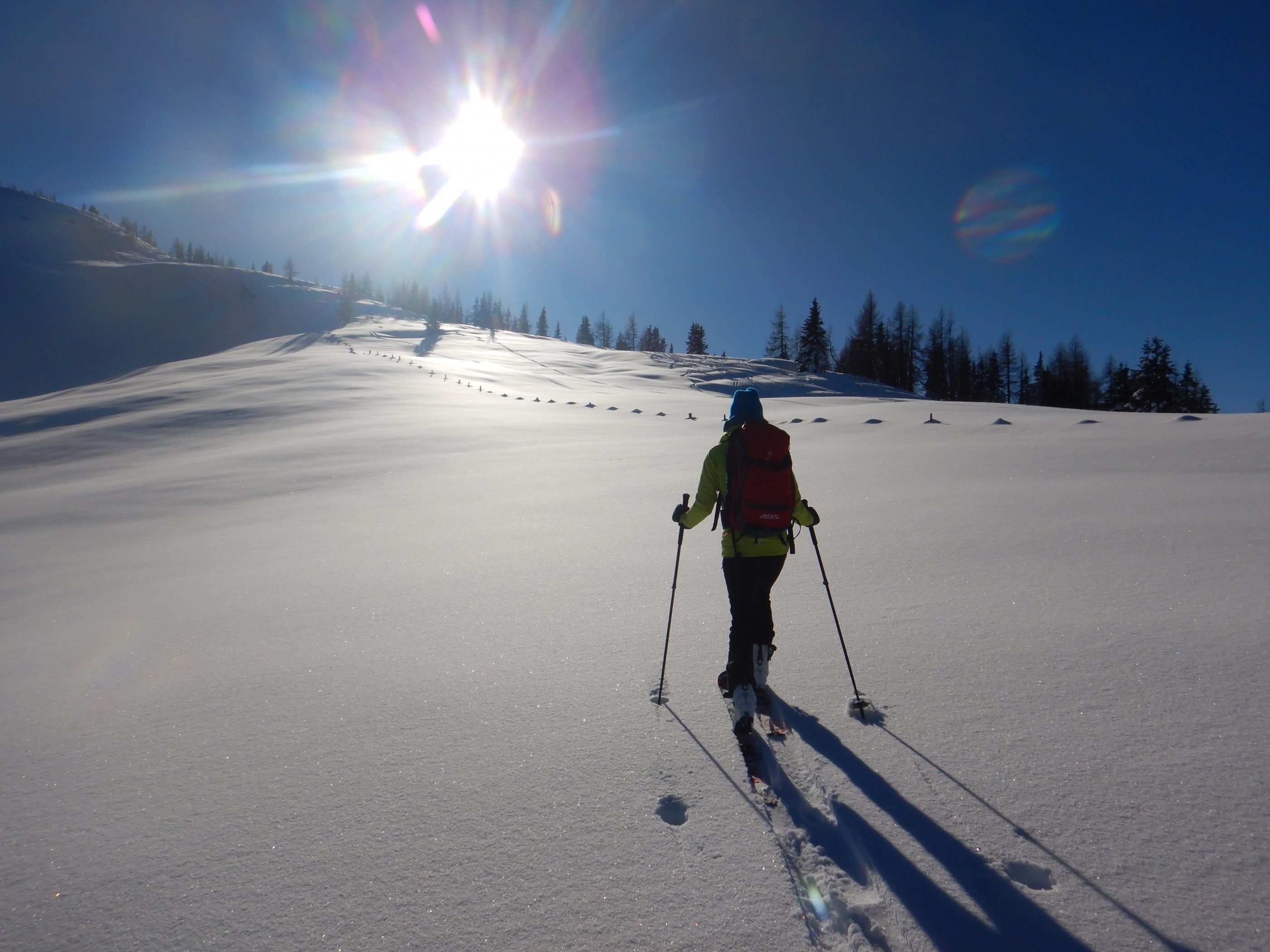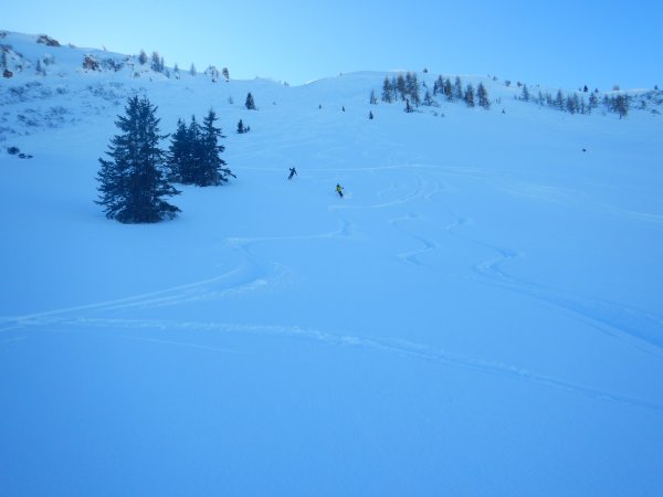 Standardroute pistenartig zerfahren, in griffigem Schnee trotzdem gut zu fahren. Abseits der Standardroute durch die Kälte bestens konservierter Pulver, z.B. bei nordseitiger Abfahrt und Wiederaufstieg. Sehr gute Schneelage, auch im Wald. Eisiger Wind nur im Gipfelbereich.