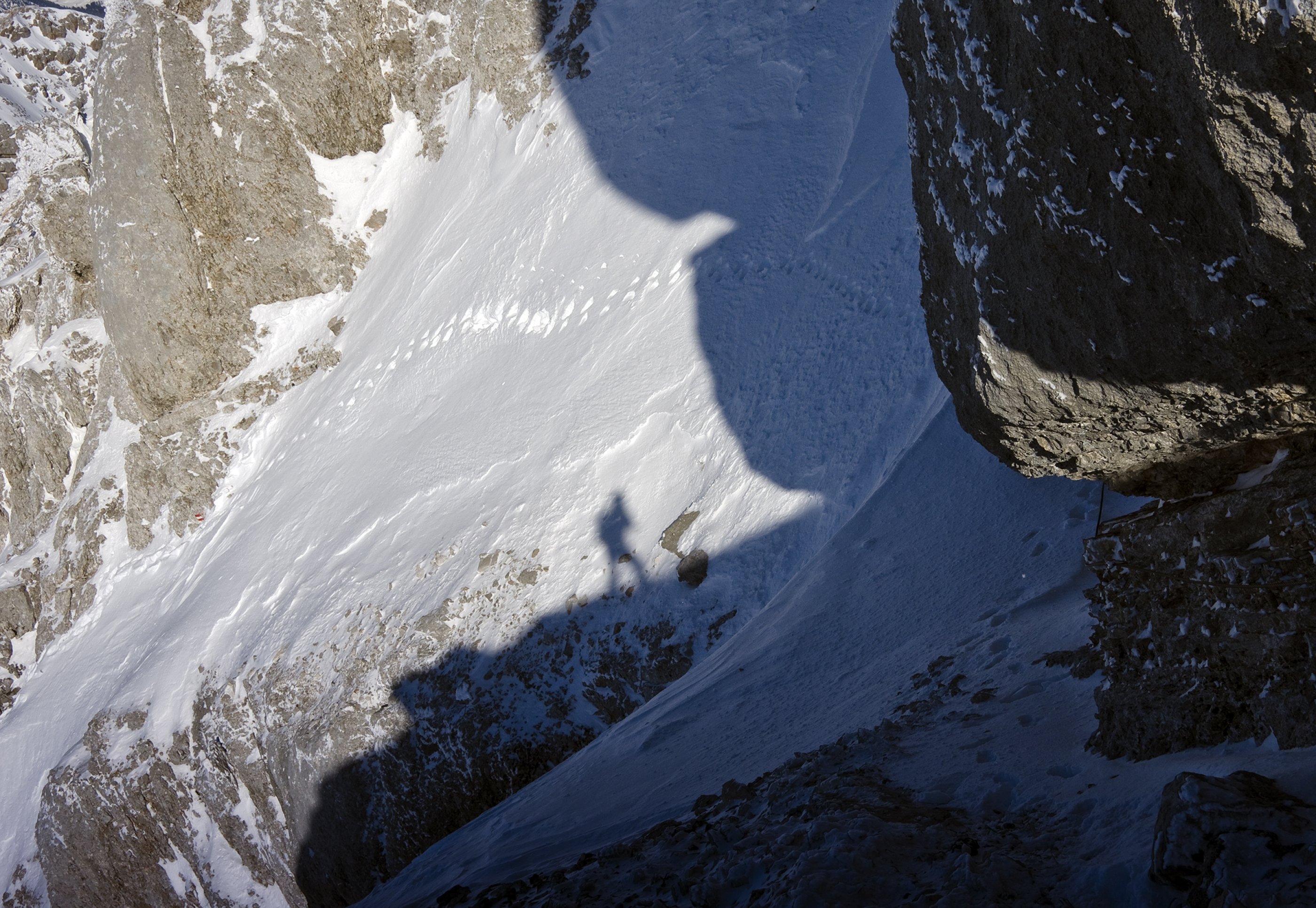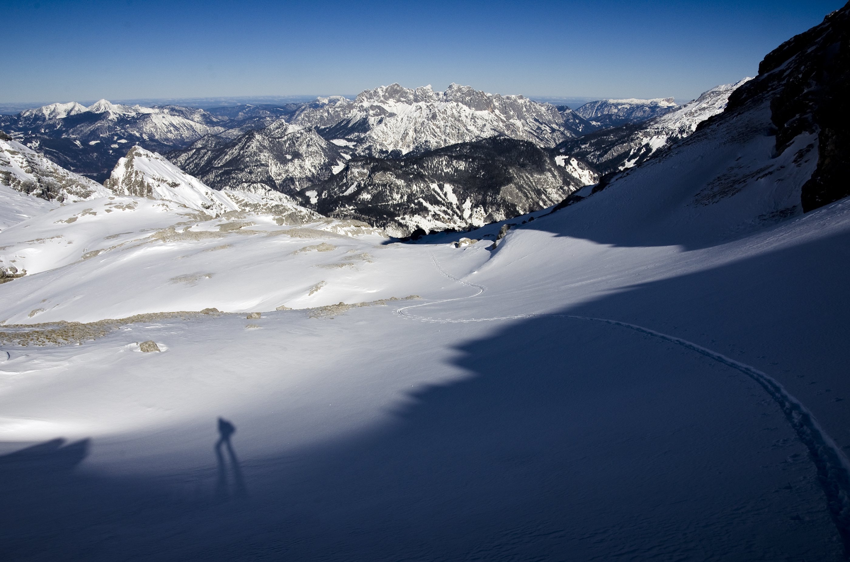 Vormittags ist es fast windstill im einsamen weiten Ebersbergkar, aber das Spuren ist manchmal mühsam.