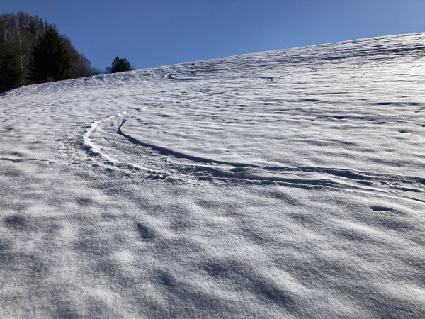 5 cm Pulver auf tragendem Harsch, im unteren Teil kurzes Stück ohne Unterlage