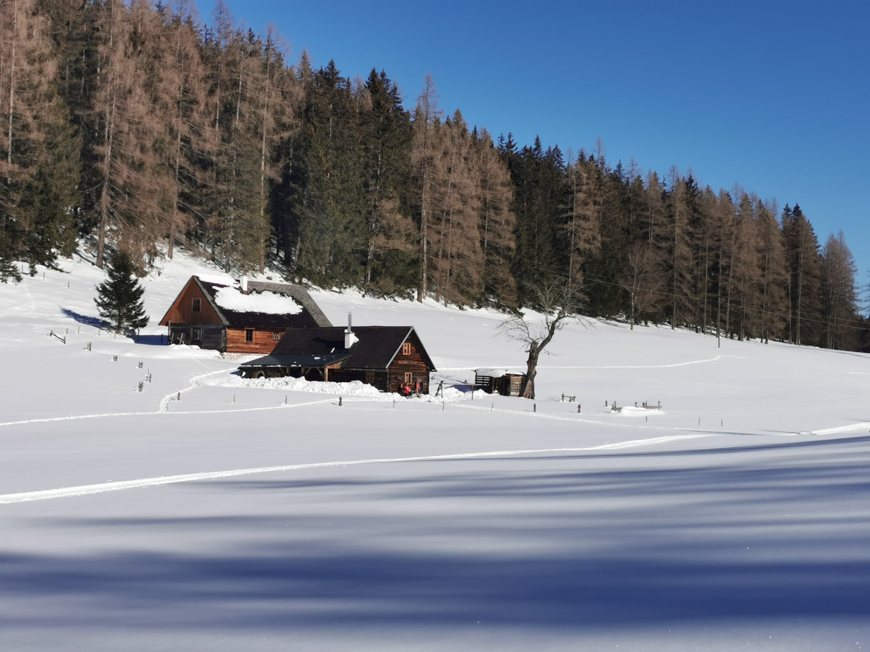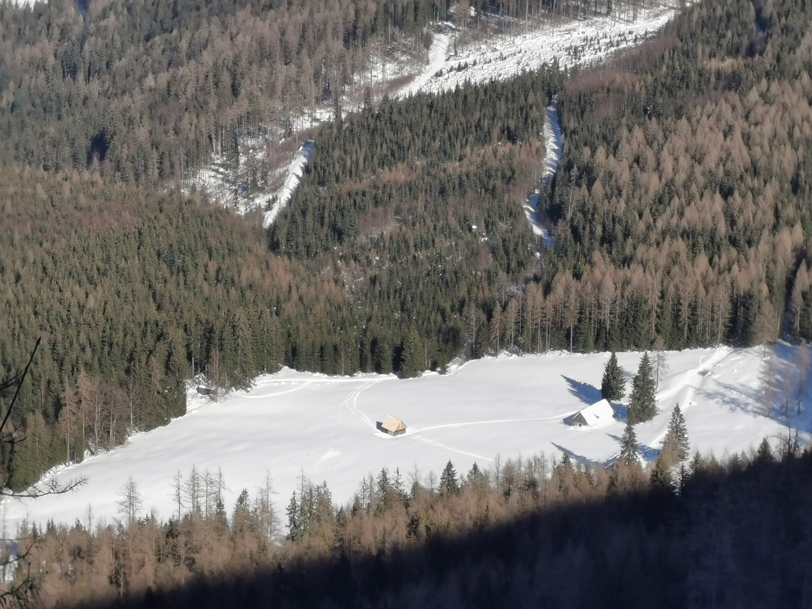 Im Tal der Schnee gefrohren. Sonnseitig schon etwas weich. Im nordseitigen Hang noch gesetzter Pulver. Die Hänge unterhalb der Wildalm total verspurt, die Forststraße gleicht einer Piste. Daher der etwas längere Weg zur Edtbauernalm. Aber auch die Pisten hinunter nach Hinterstoder eisig hart u. ausgefahren.