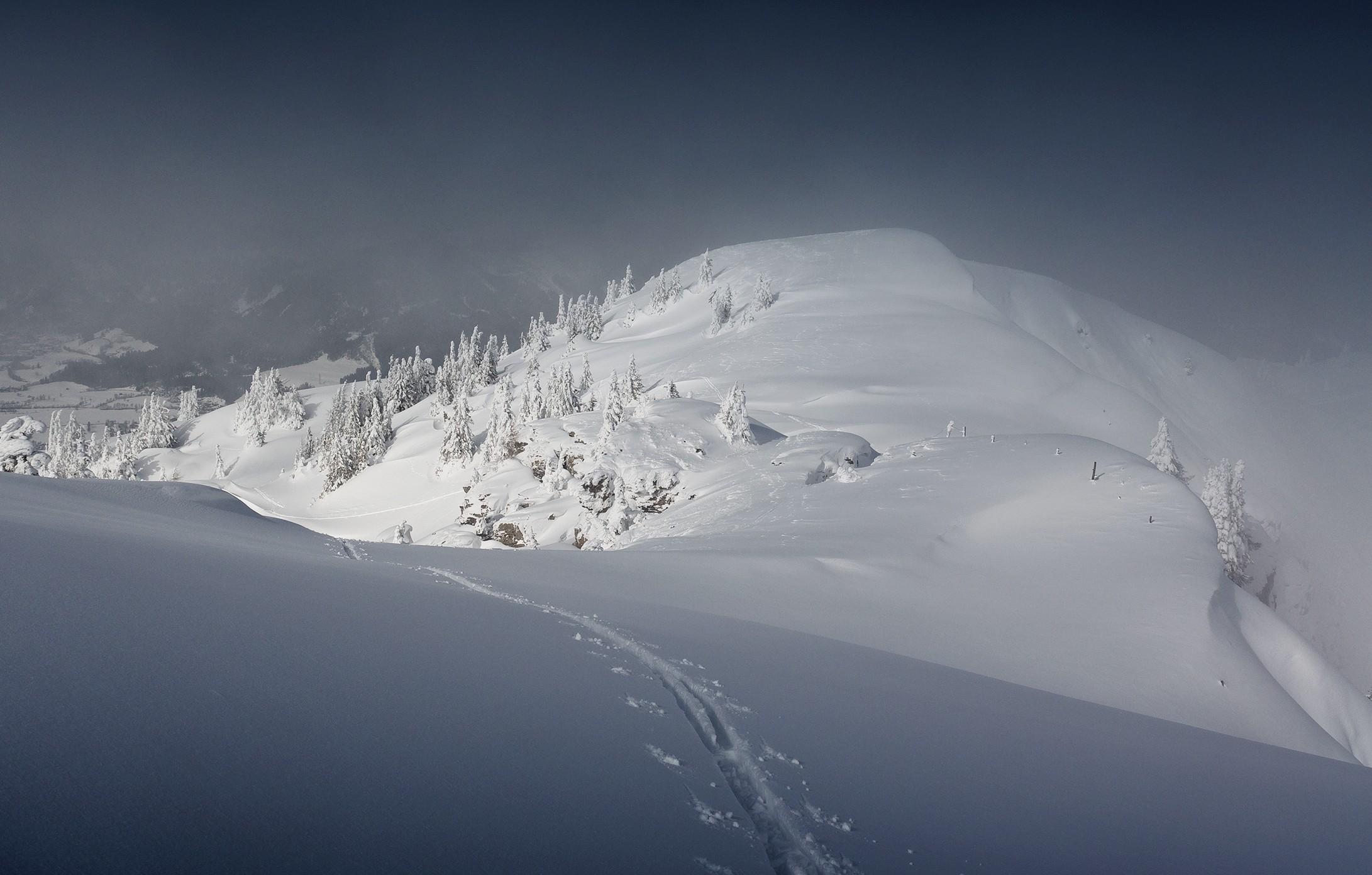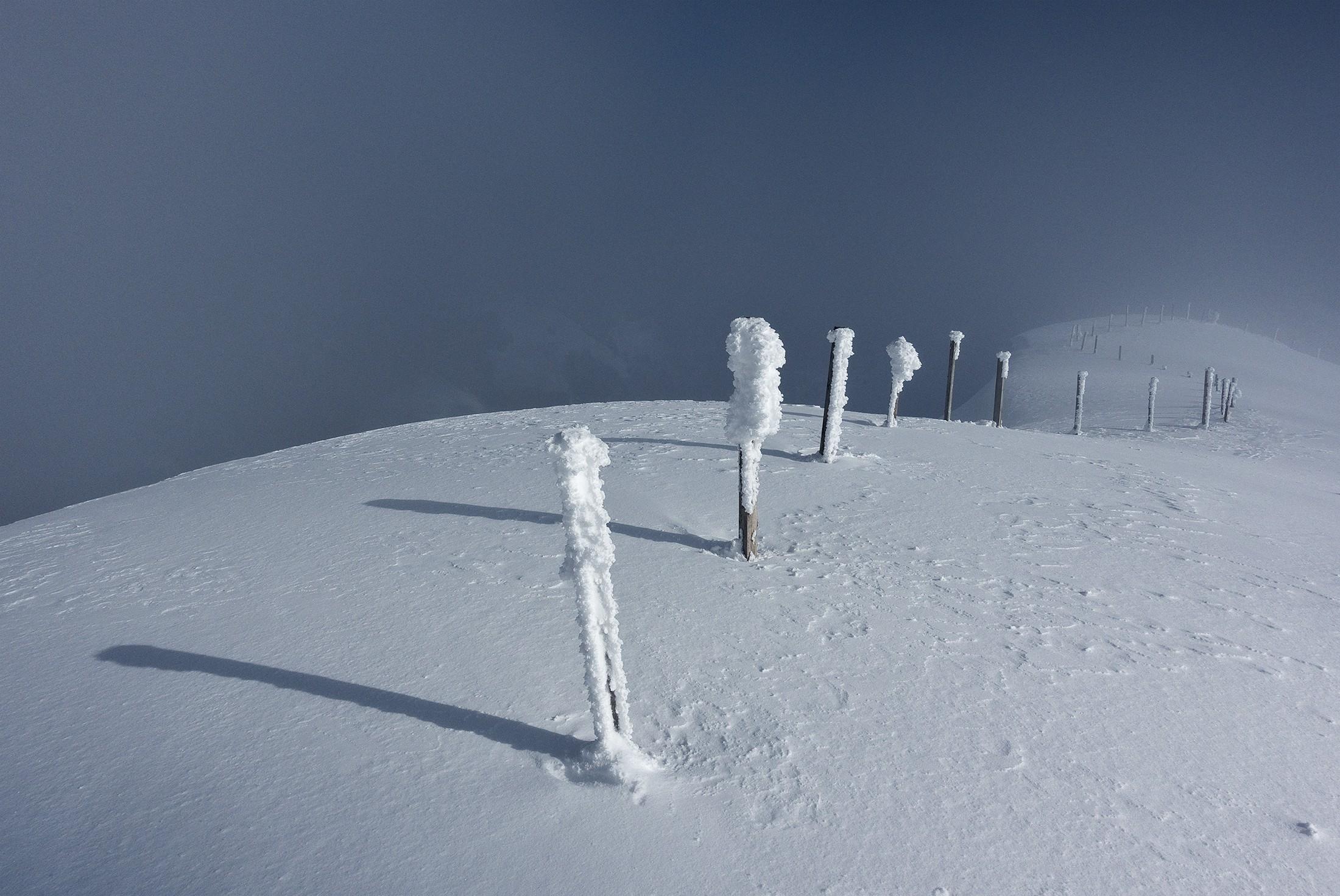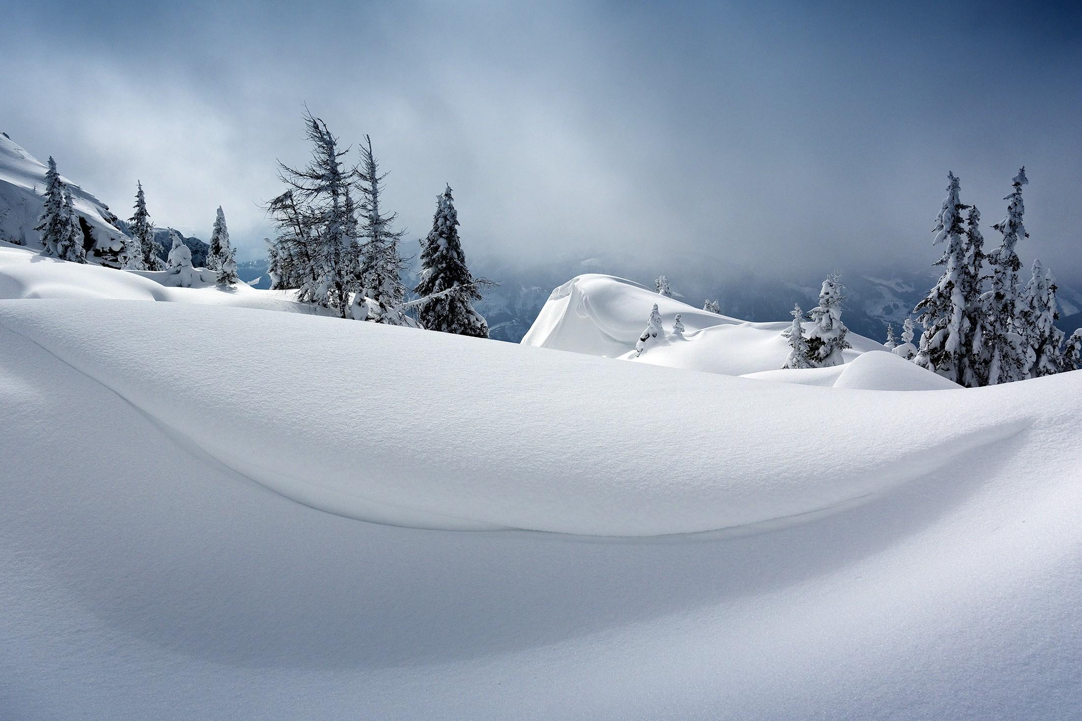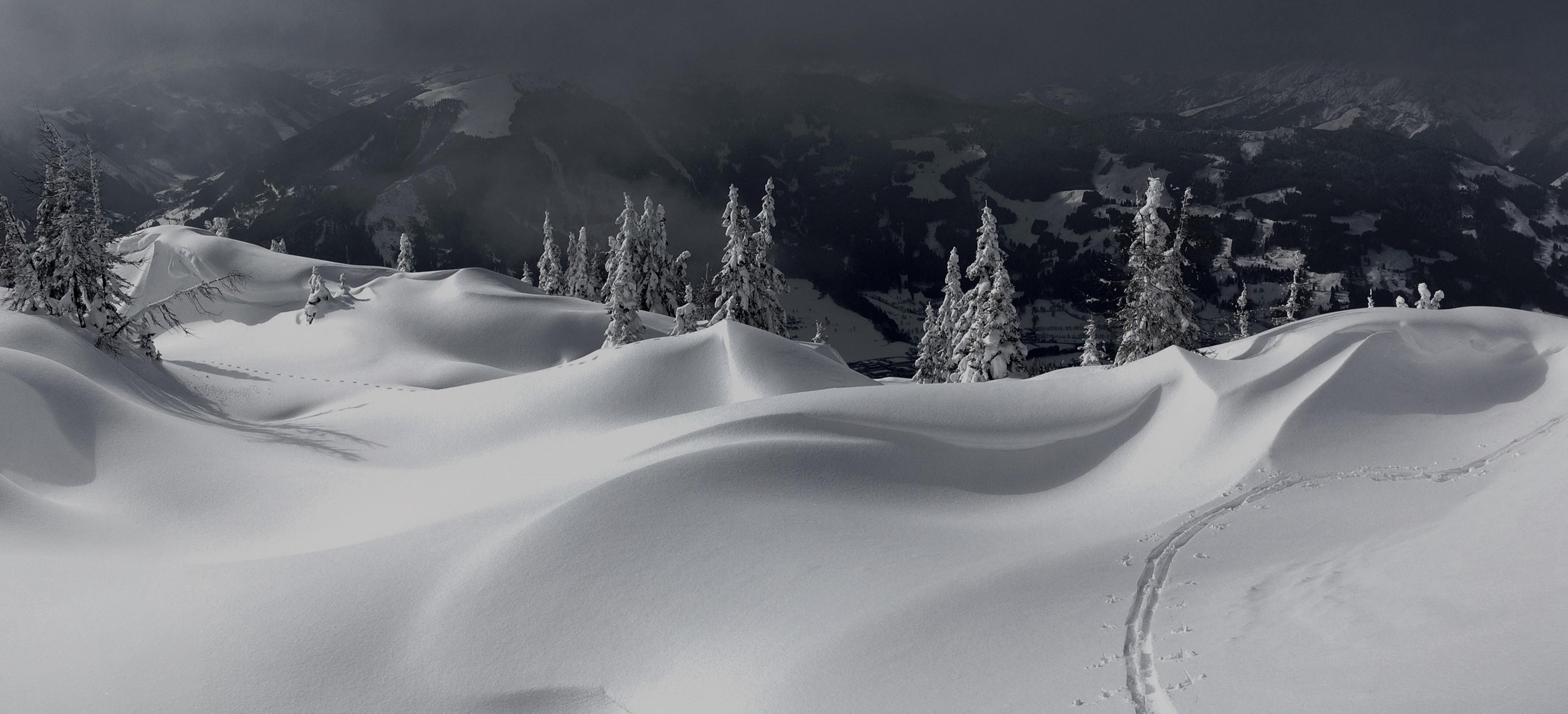 Und immer wieder bin ich lange stehen geblieben, um die wunderbaren Licht- und Schattenspiele von Wolken und Sonne auf dem unberührten Schnee in mich aufzunehmen.