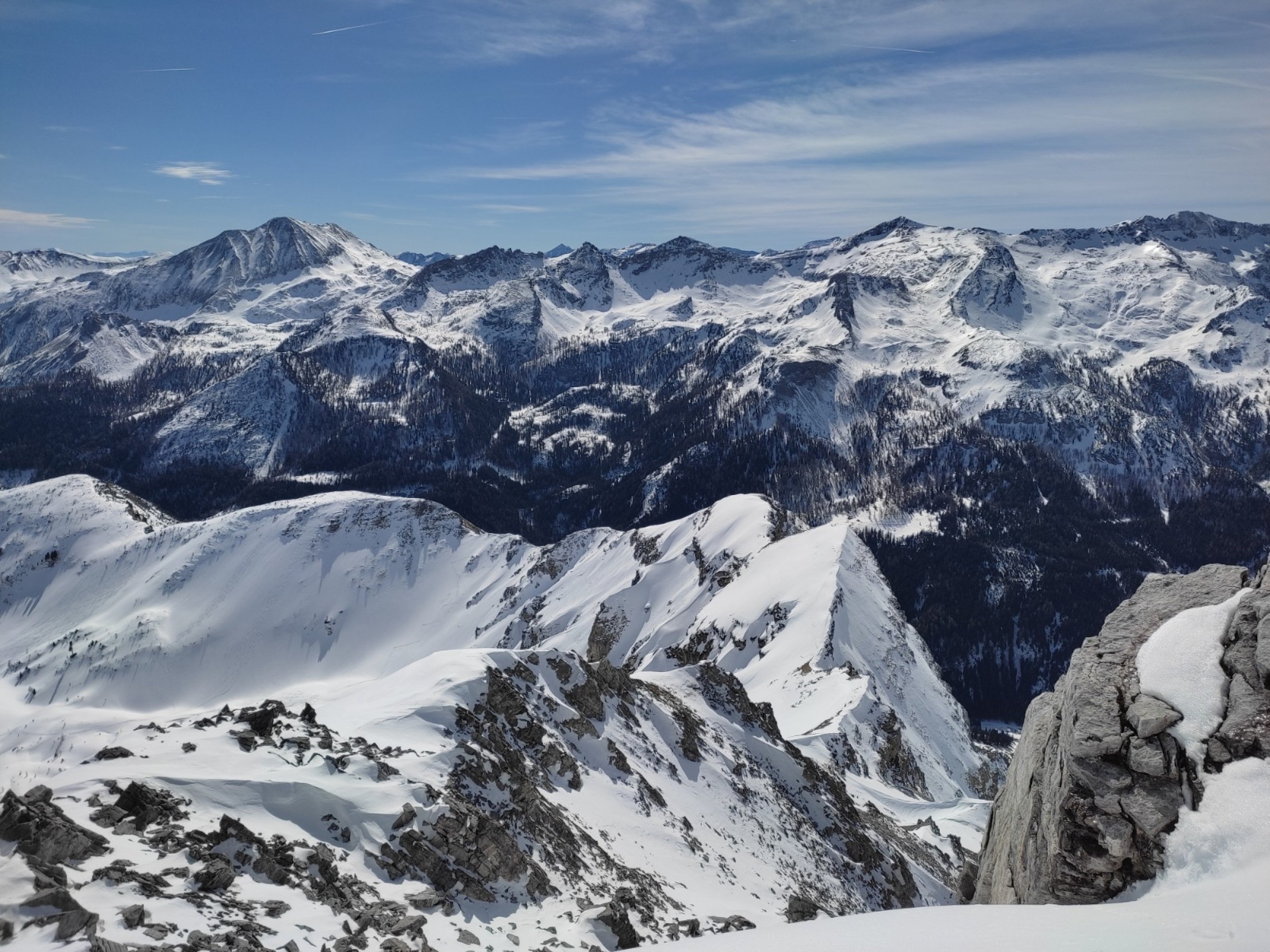 Wir haben gerade noch einen Parkplatz ergattert und starten gegen 9:15 bei angenehmen Temperaturen und Sonnenschein. Ab der Gastalm sehen wir schon die Kolonne auf die Kesselspitze. Weil im Schatten der Schnee noch schön pulvrig ist und von der Sichelwand erst zwei Abfahrstspuren zu sehen sind, steigen wir zuerst dorthin auf. Die Temperatur steigt gewaltig. Oben ist es hart aber angenehm zu fahren. Im Hang geht´s gut, auch wenn der Pulver schon nicht mehr ganz fluffig ist. Die Kesselspitze ist gut besucht und Ost- und Südabfahrt sind ziemlich beackert. Wir entscheiden uns für die Südvariante. Die Abfahrt ist mit etwas Schwung ganz gut zu fahren. Wir hatten heute eine Frühlingstour ohne Firn.