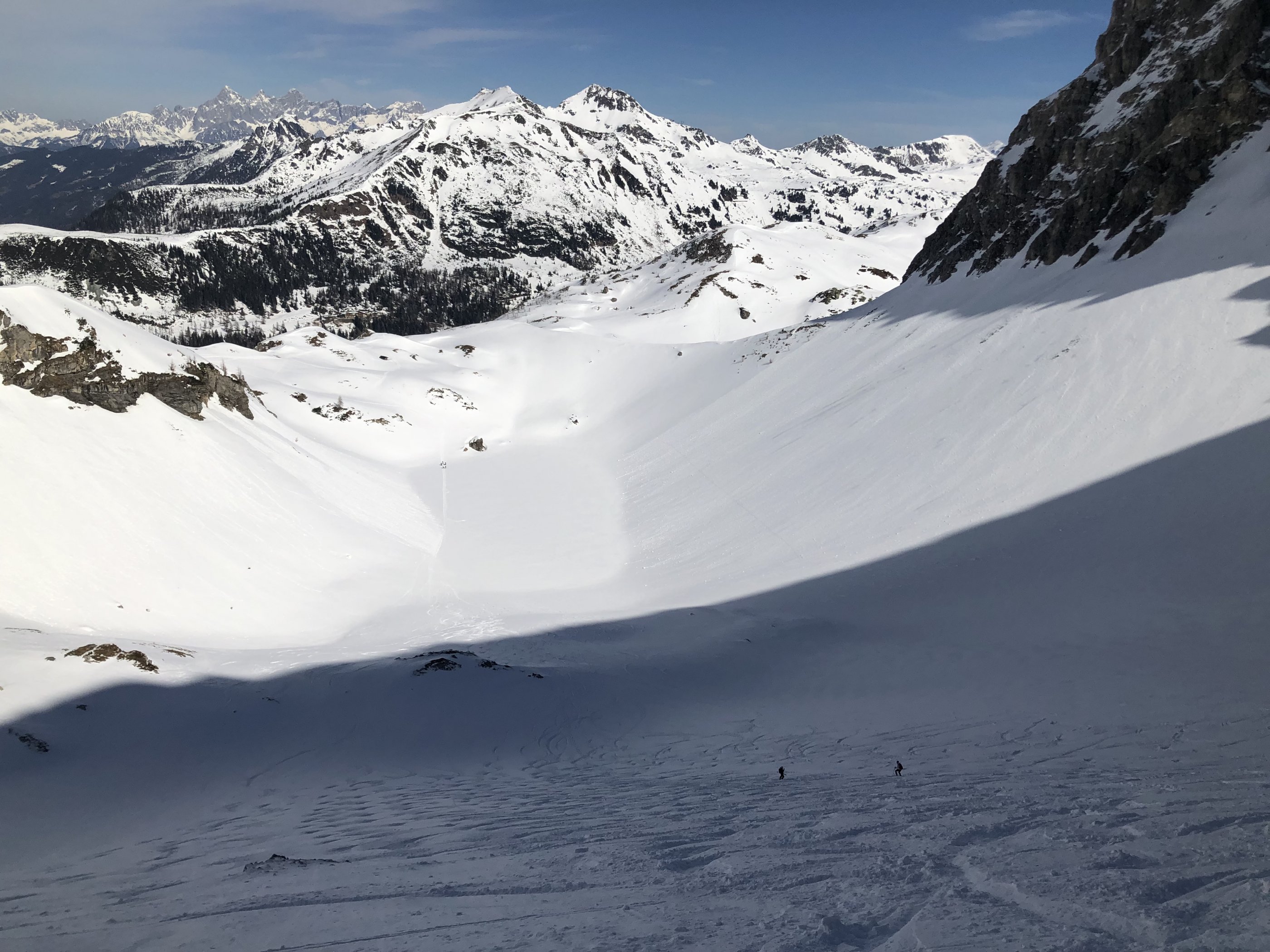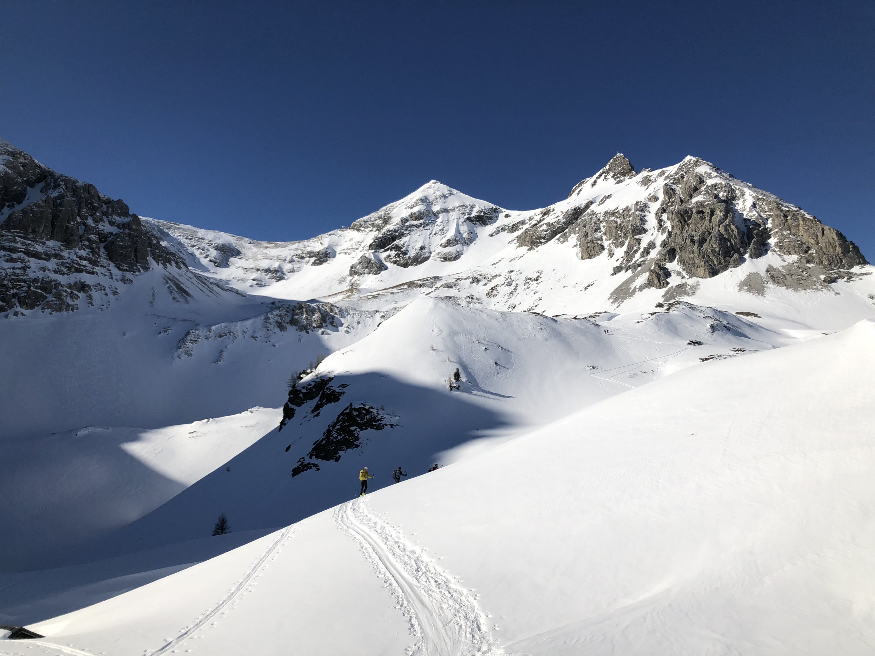 Schnee: genügend ab PP an der Katschbergstraße. Bei der Abfahrt zwischen 11 und 12 Uhr zuerst schöner weicher Schnee auf fester Unterlage im dem Ostkar der Grosswandspitzen, dann idealer aber natürlich arg zerfahrener Pulver bei der Abfahrt zum Wildsee, ab dem Kreuz links im steilen Lärchenwald der Bödenalm wieder balliger Neuschnee, wieder bestens zu fahren außerhalb der „Wuzeln“, die die Vorausfahrenden auslösten und zum Schluss ab Felseralm ausgefahrene Piste.