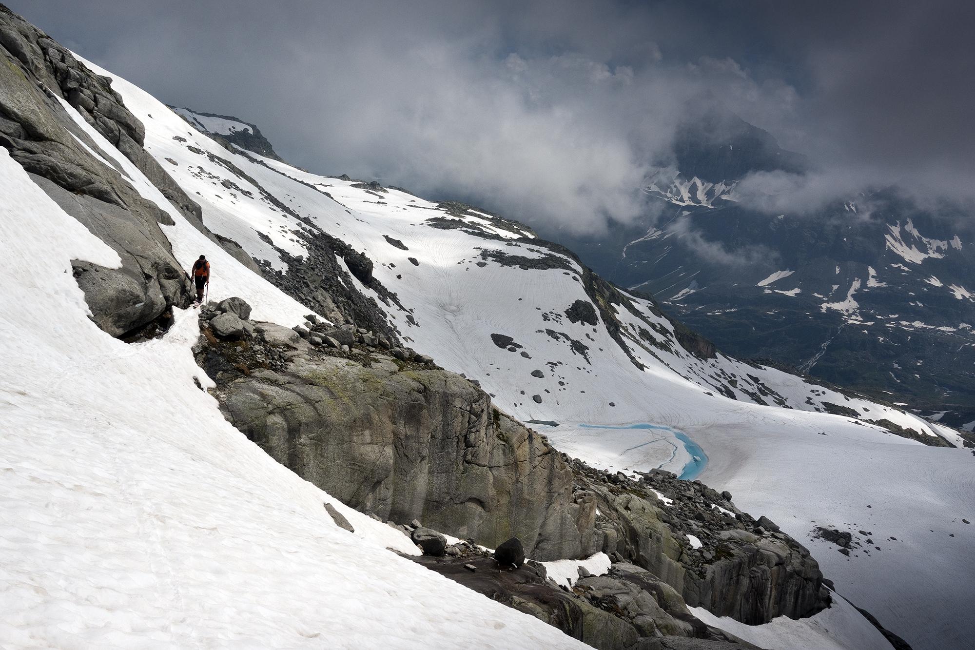 Nur an der Steilstufe unter dem Sonnblickkees gibt es schon eine kurze "Engstelle" mit Schneebrücke.