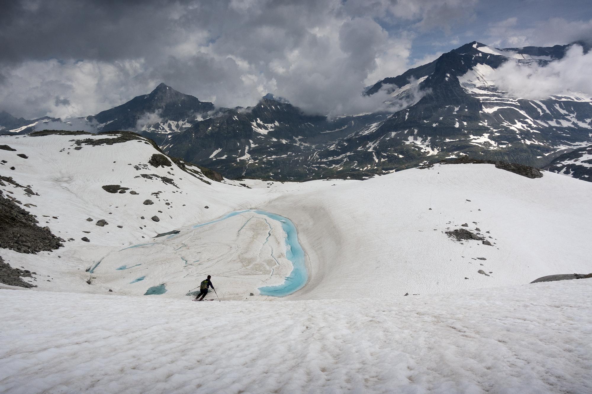 Von der Rudolfshütte tragen wir die Ski um den Weißsee, und dann können wir auch schon anschnallen. Feiner buckliger Schnee mit geringer Einsinktiefe und Sonnenschein bis hinauf zum Skidepot.