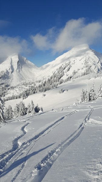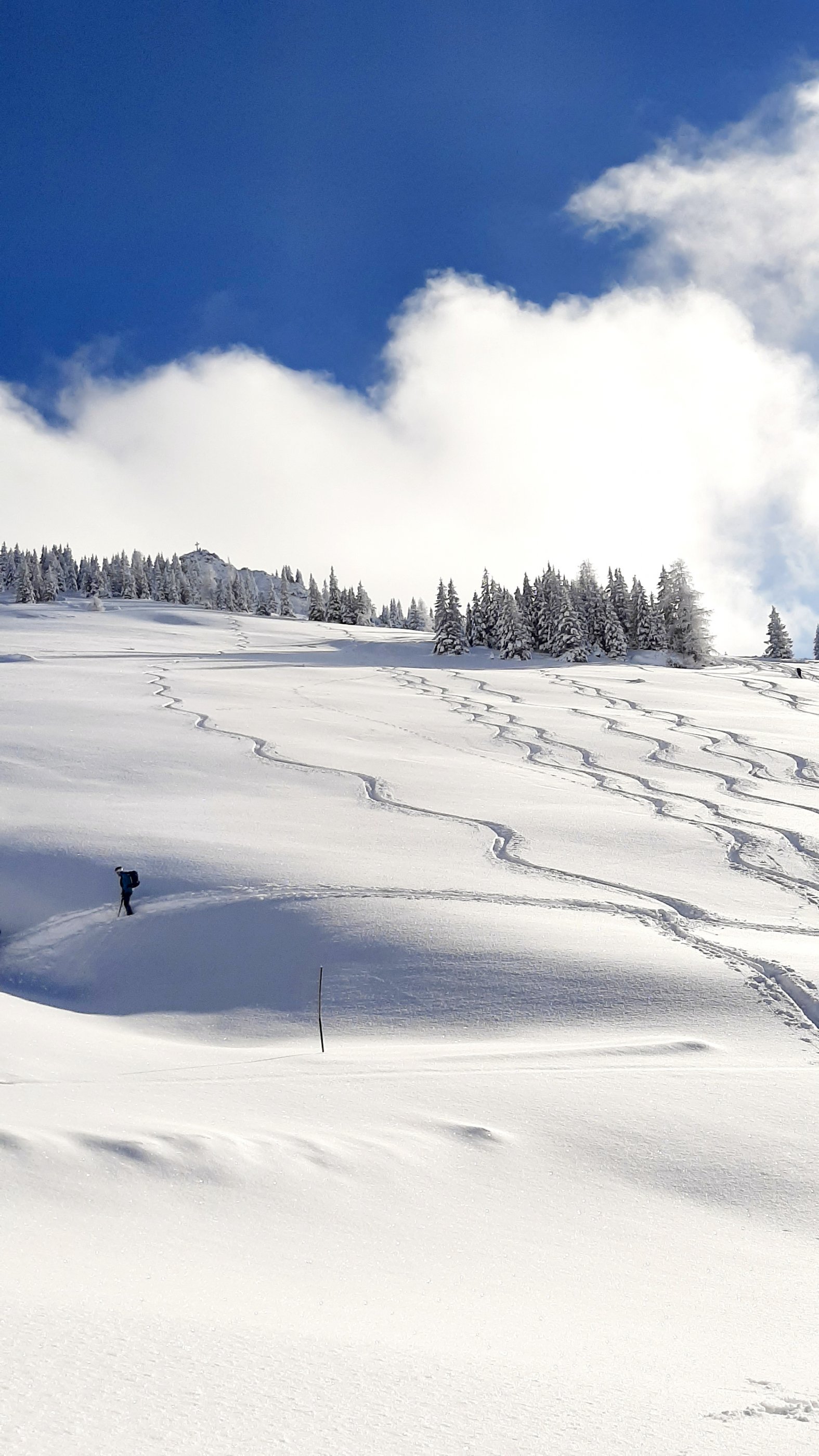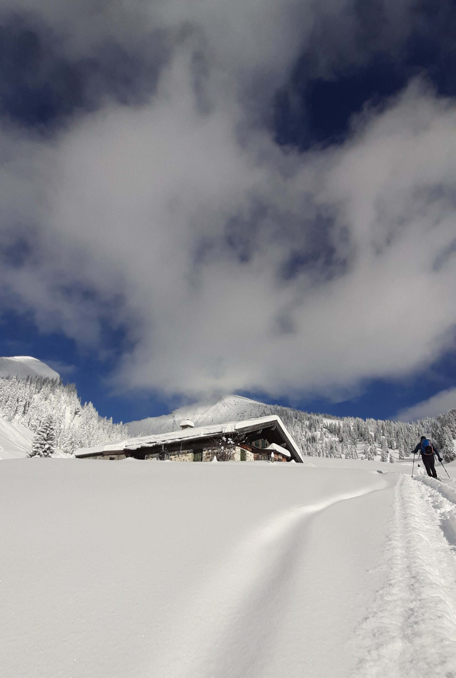 Winterwonderland. So frühhochwinterlich habe ich die Hochalm und die umliegenden Zauberberge noch nie erlebt. Massig Powder. Lediglich auf den letzten 100 Höhenmetern zum Sonntagshorn war er windmisshandelt, aber noch gut fahrbar. Die Latschen sind auch schon weitgehend eingepackt. Am Gipfel ein lausiger Westwind, der die Minustemperaturen noch weiter in den Keller rasseln lässt. In die Reifelrinne haben sich auch 4 verirrt...schon steil...aber eben verführerisch. Auf der Wildalm noch kein Liftbetrieb und die Hochalm noch geschlossen. Wohltuende Stille...nur manchmal durch archaische Freudenschreie aus einem Powderhang unterbrochen. Nichts sonst stört. Da fällt mir wieder Nani's Text ein, der das so trefflich beschreibt (danke Nani!)