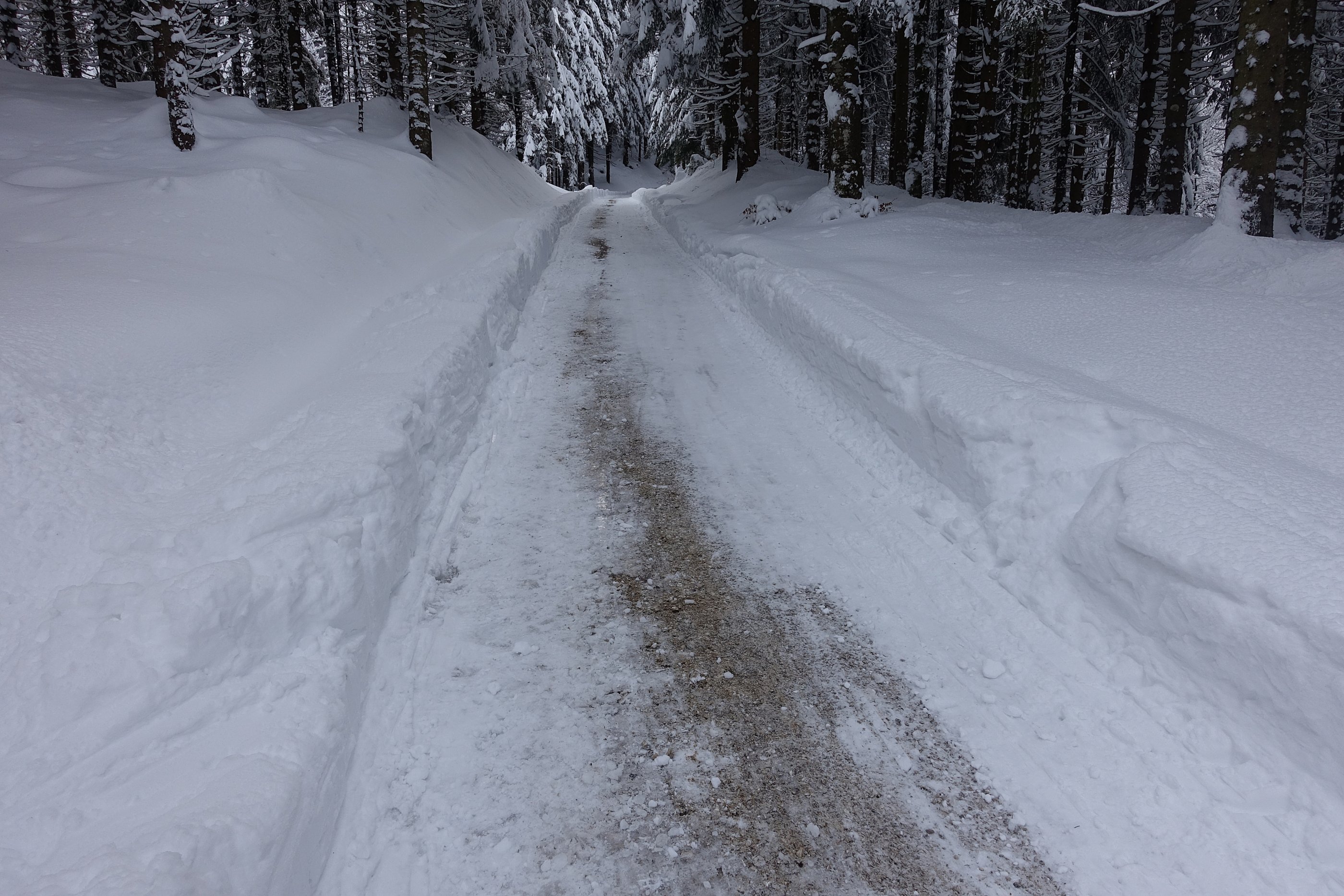 C: Die Forststraße von den Schafbergalmen (Ausnahme Mautstraße) bis fast ganz runter ist für die derzeitigen Verhältnisse zu flach - Spurfahren Aufstiegsspur ist angesagt