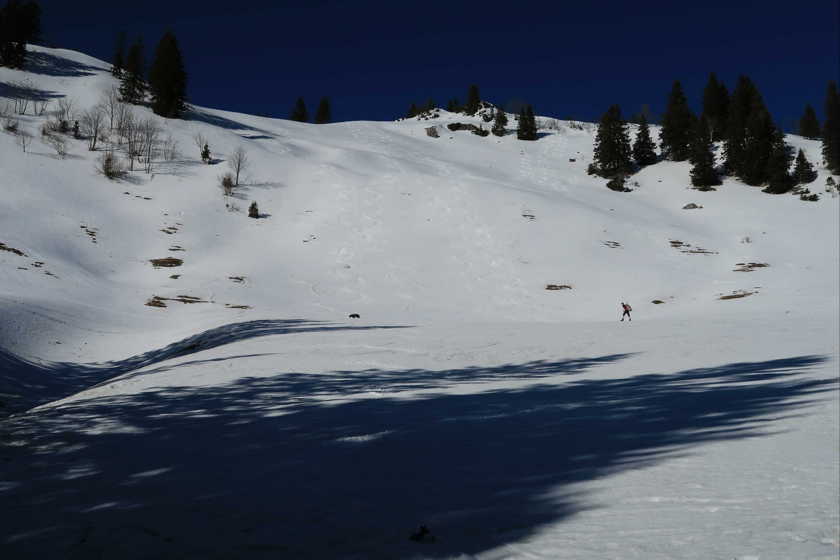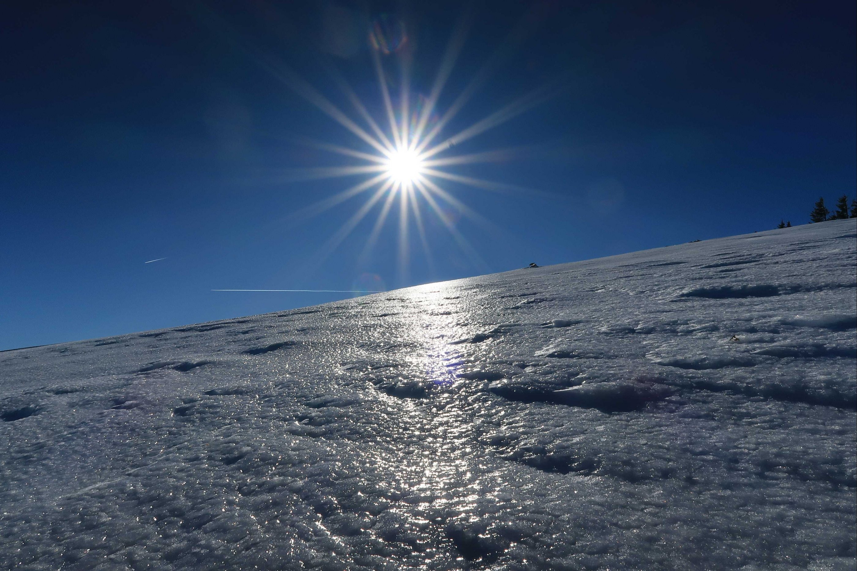 Geringe Lawinengefahr. Schattseitig blieb der Schnee hart, in manchen Bereichen gibt es unangenehmes, steinhartes Regeneis, die Abrutschgefahr ist nicht zu unterschätzen; zu Fuß sind in diesen Bereichen Grödel/Harscheisen obligatorisch.