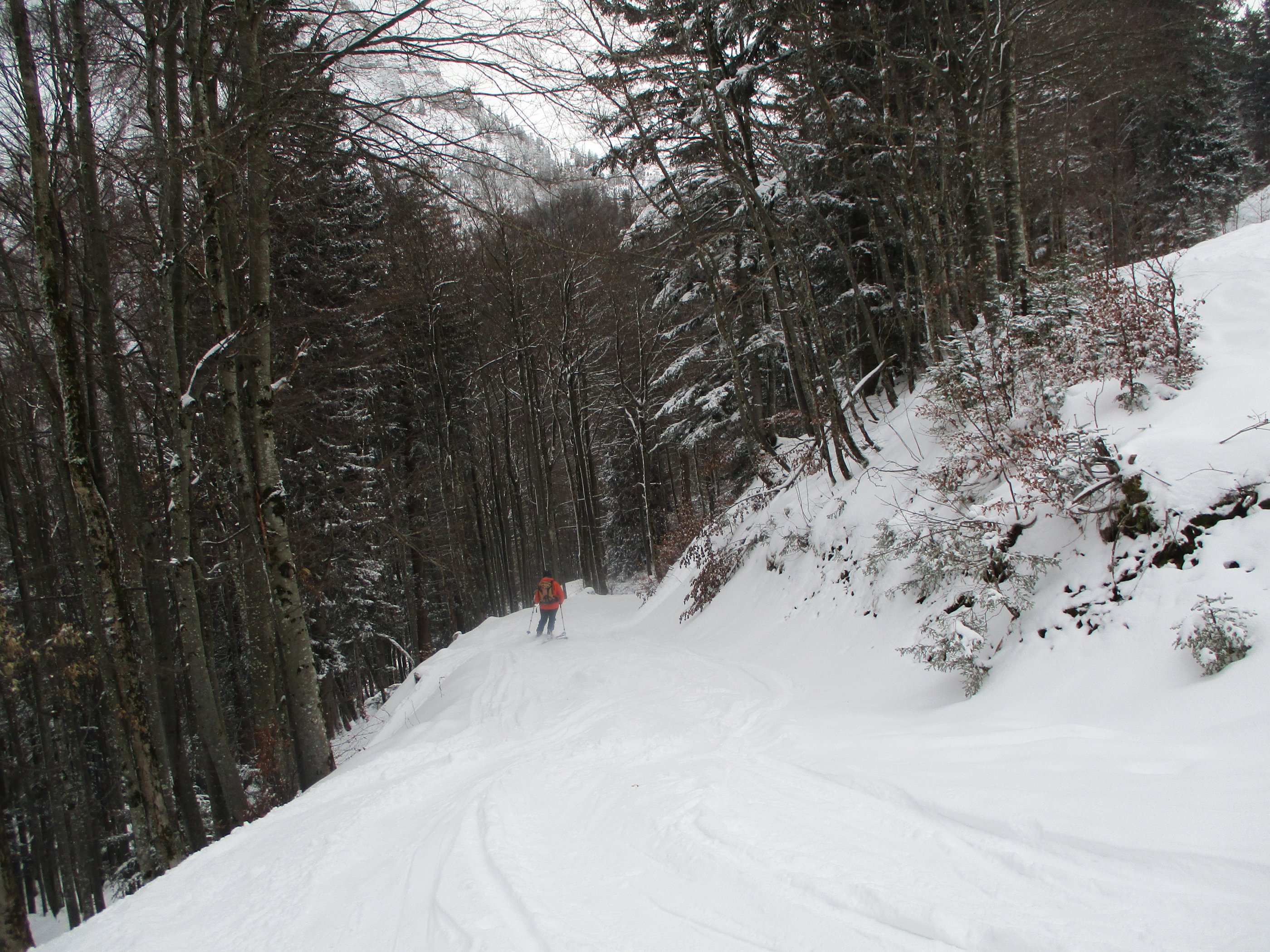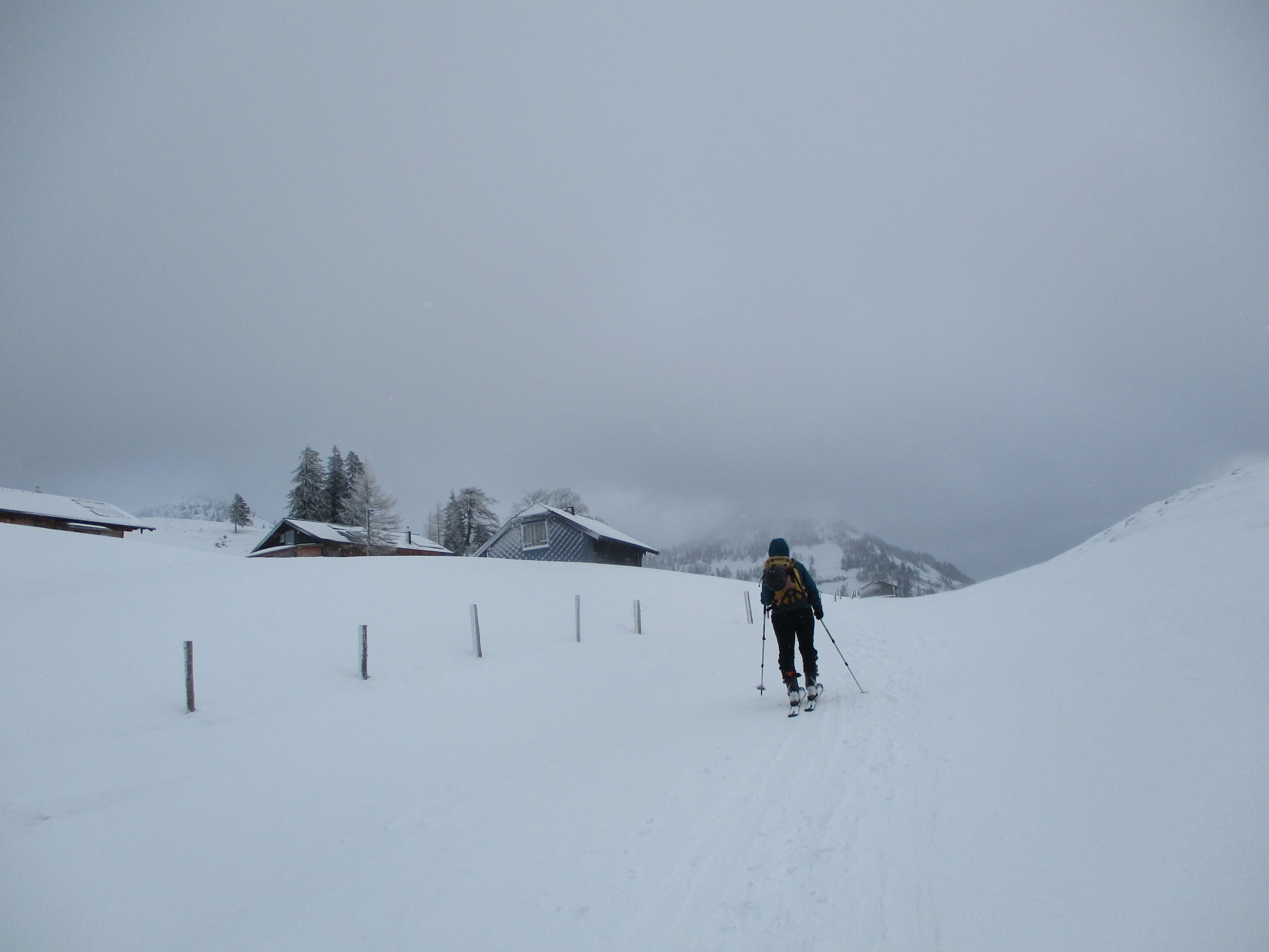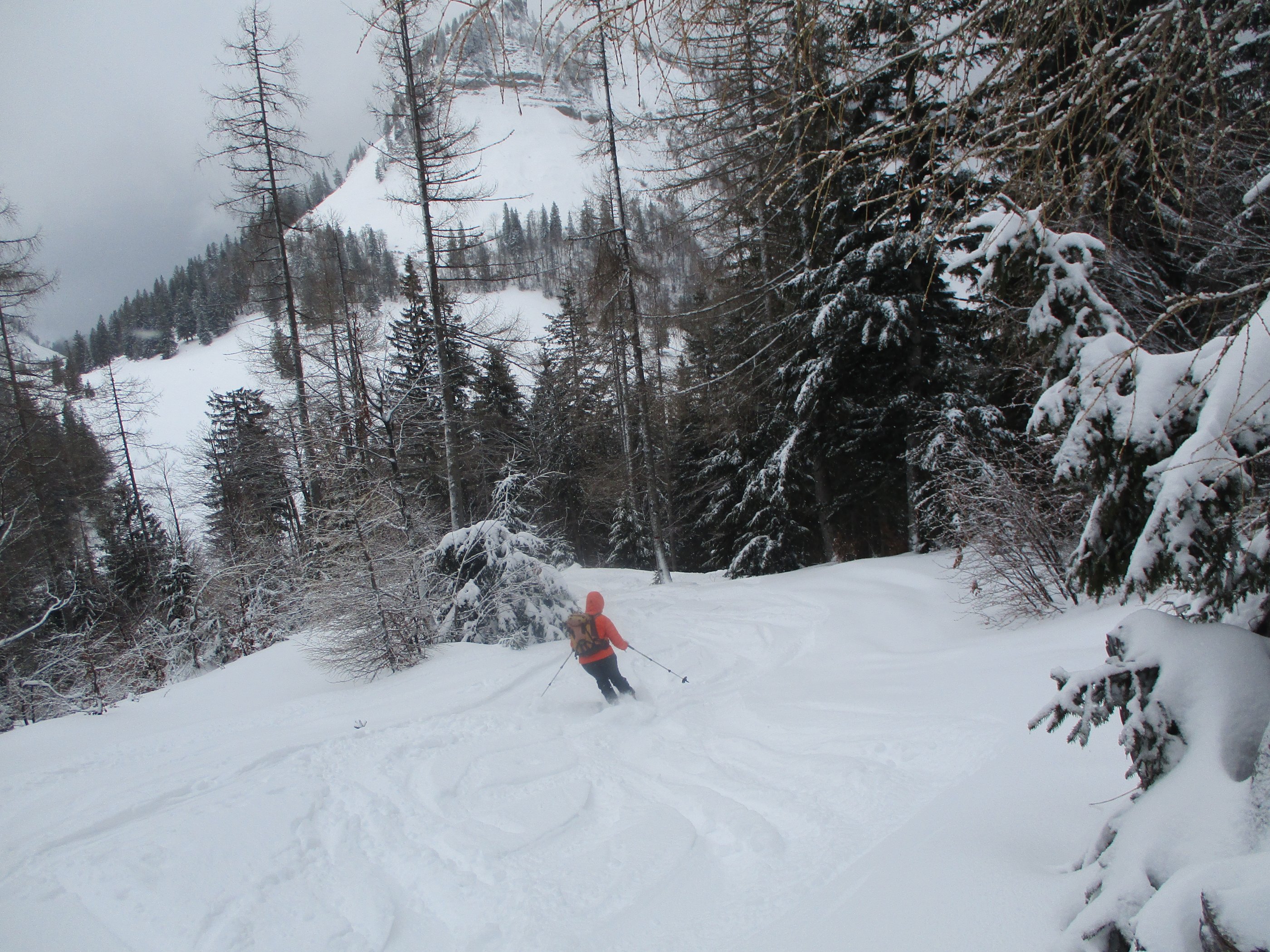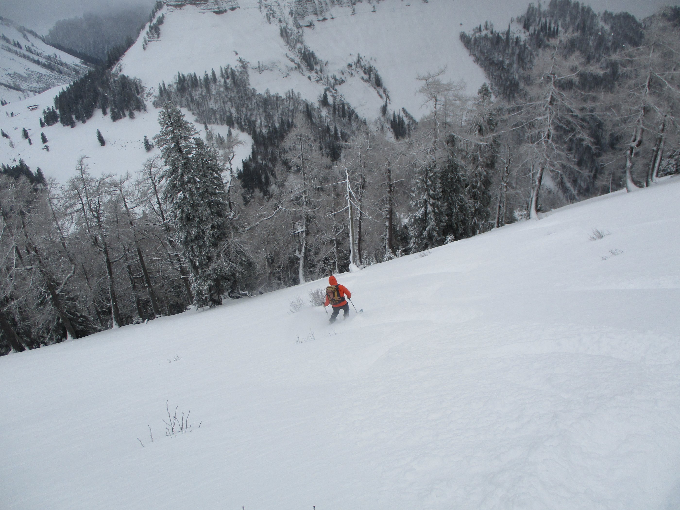 Die Parkplatzgebühr in Lämmerbach beträgt 7 Euro. Die Temperatur am ziemlich leerem Parkplatz - 2Grad. Die Abkürzung der Forststraße durch den Wald über den Sommerweg ist möglich. Das Wetter meist stark bewölkt mit kurzen Aufhellungen, dazu weht ab der Genneralm zeitweise ein kalter Wind. Sehr gute Abfahrtsverhältnisse am Gipfelhang, im Waldbereich war teilweise ein Harschdeckel spürbar. Die Forststraße von der Genneralm zum Parkplatz hat zwar eine ausreichende Schneelage , das Abfahrtsvergnügen hält sich durch eine alte Fahrzeugspur die ab Abzweigung Gruberalm tief wird - in Grenzen.