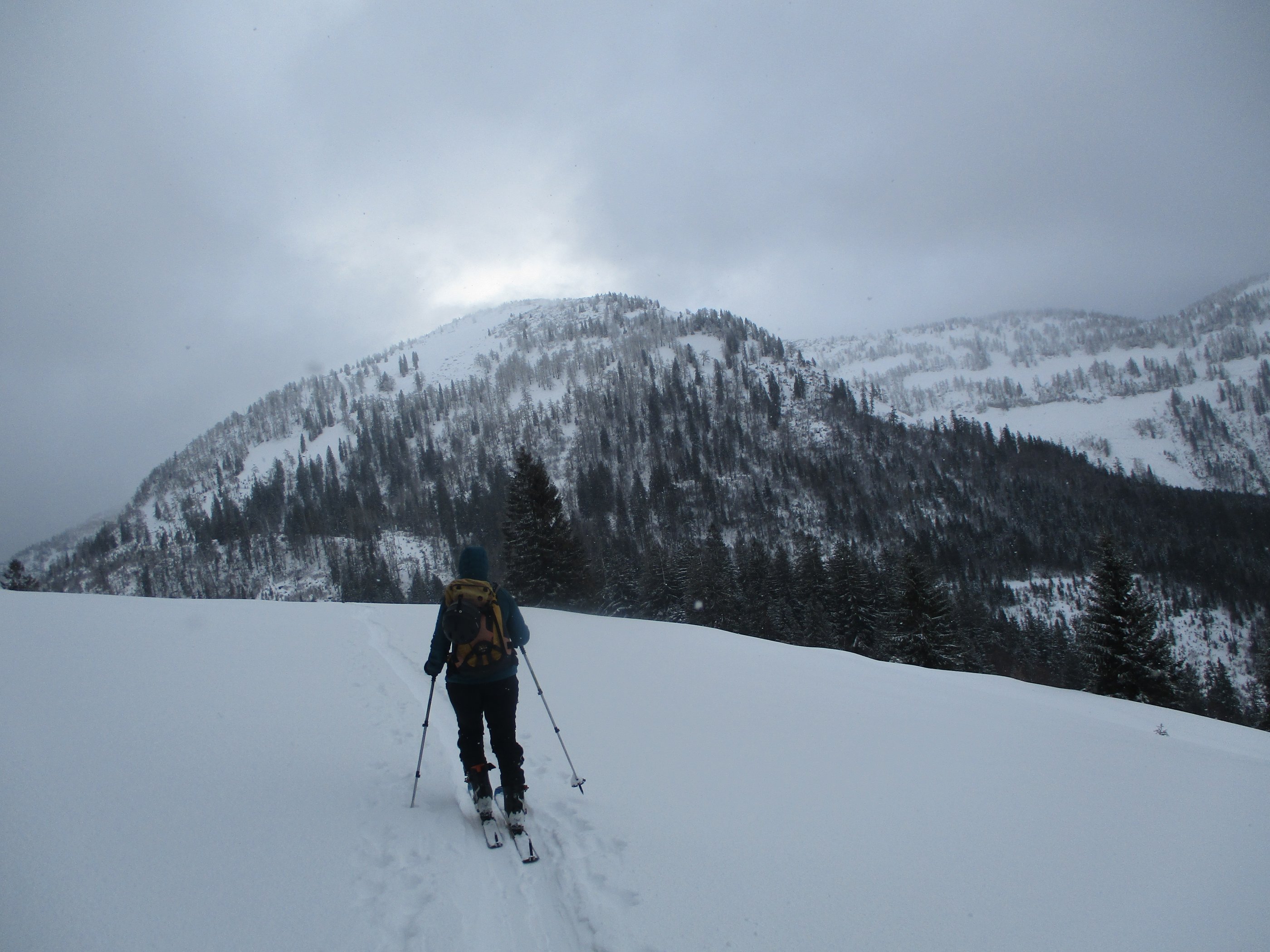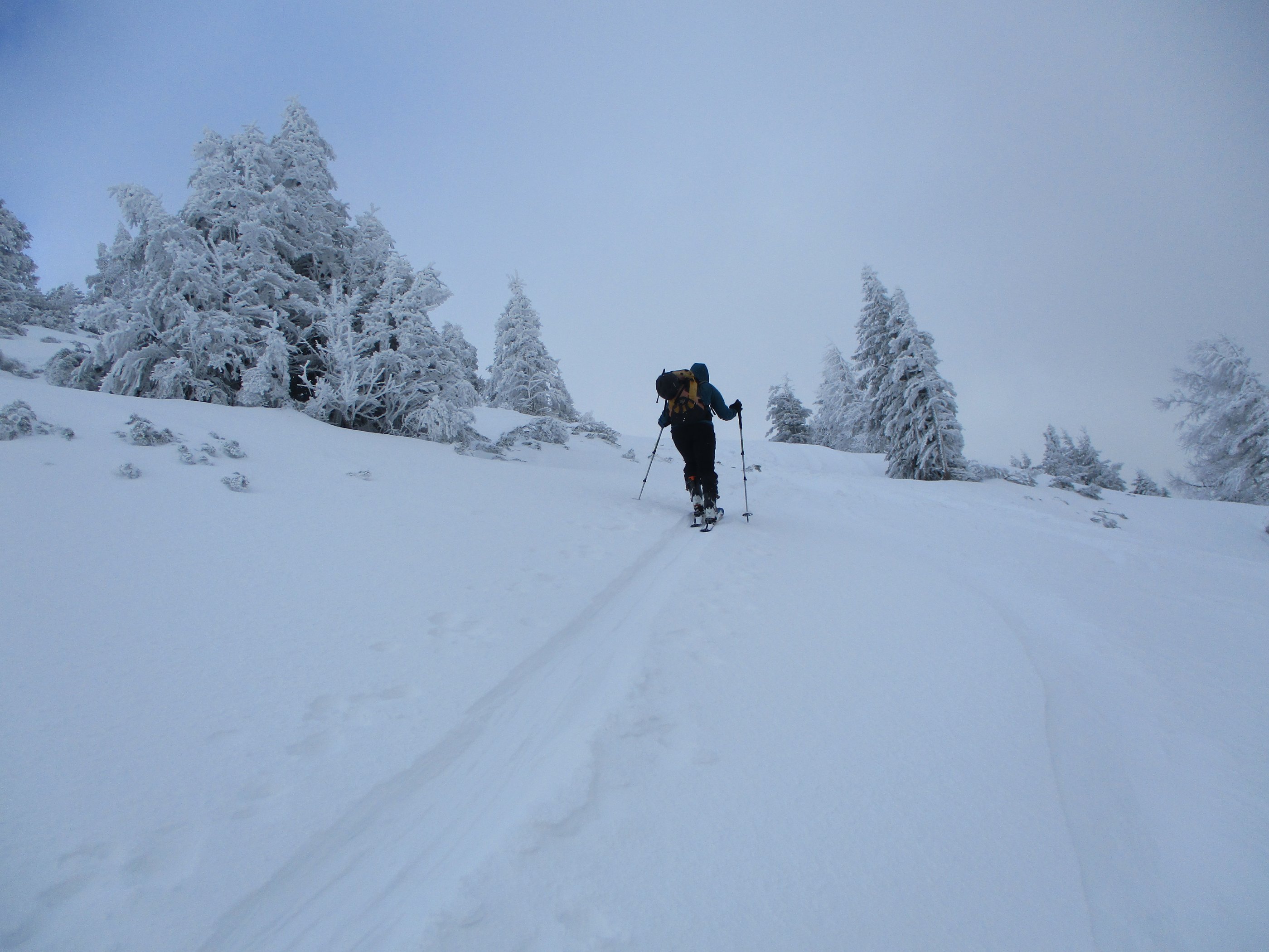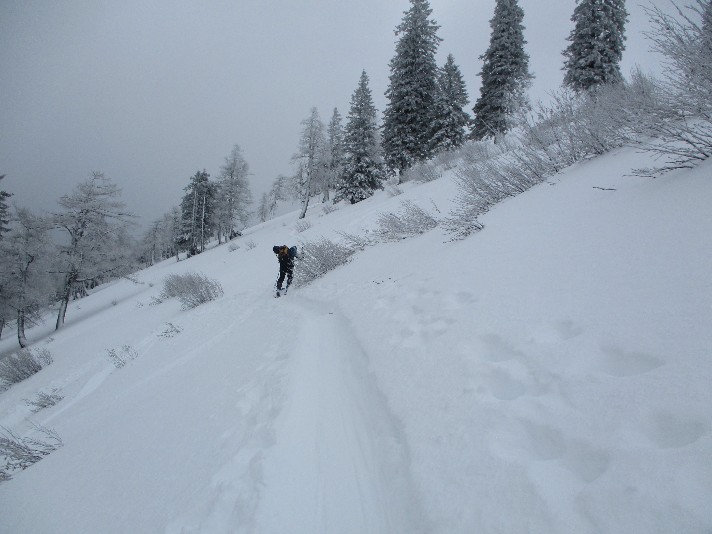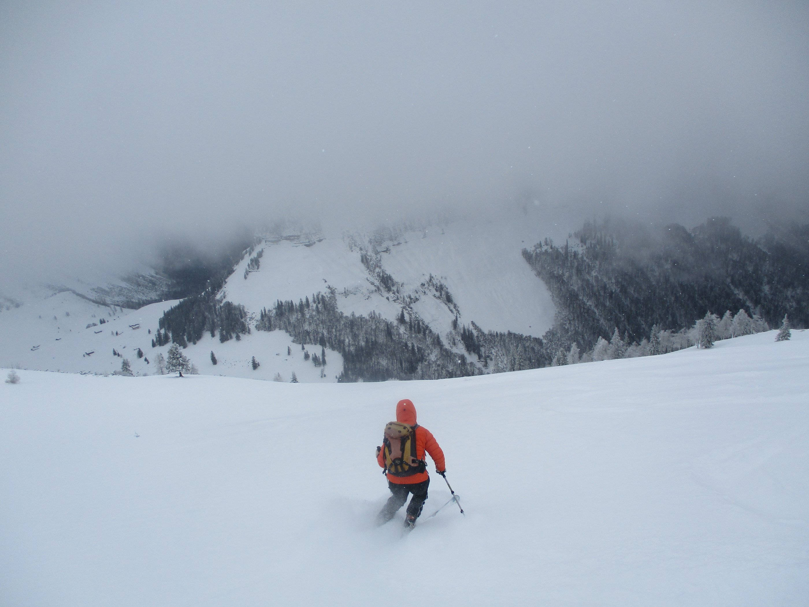 Die Parkplatzgebühr in Lämmerbach beträgt 7 Euro. Die Temperatur am ziemlich leerem Parkplatz - 2Grad. Die Abkürzung der Forststraße durch den Wald über den Sommerweg ist möglich. Das Wetter meist stark bewölkt mit kurzen Aufhellungen, dazu weht ab der Genneralm zeitweise ein kalter Wind. Sehr gute Abfahrtsverhältnisse am Gipfelhang, im Waldbereich war teilweise ein Harschdeckel spürbar. Die Forststraße von der Genneralm zum Parkplatz hat zwar eine ausreichende Schneelage , das Abfahrtsvergnügen hält sich durch eine alte Fahrzeugspur die ab Abzweigung Gruberalm tief wird - in Grenzen.