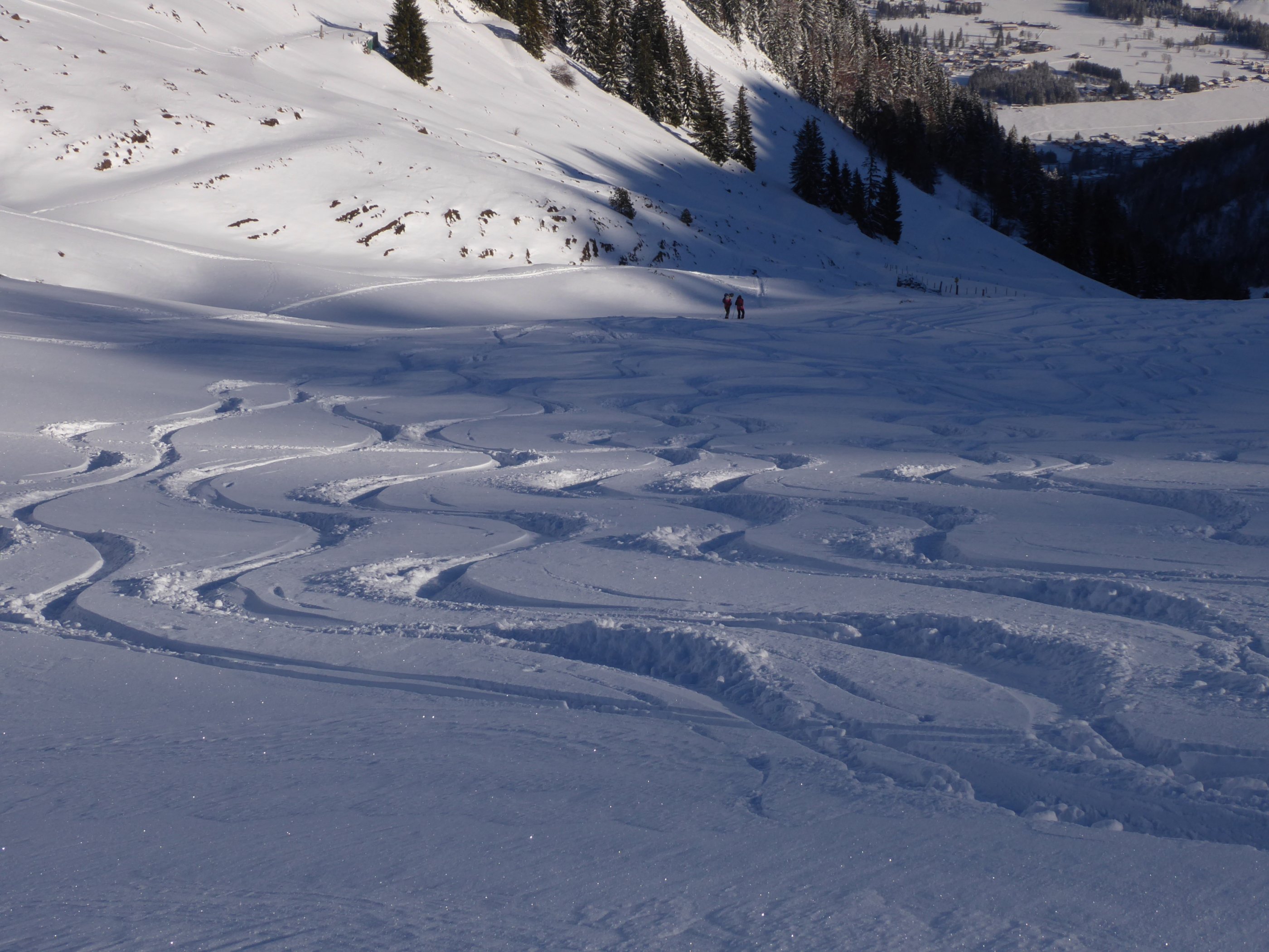 Pillerseeberge sehr gut eingeschneit, deutlich mehr als die paar Kilometer östlich in der Bereich Lofer. Auf eher dünner, aber kompakter Unterlage (~20cm) 20-40cm (unten) frischer, trockener, kalter Pulver, oben bis etwa 60cm anwachsend. Wenig bis keine Windspuren, alles recht spannungsarm und vom Gipfel bis zur Autotür herrlich leicht und schön zu fahren, die Almwiesen im Lindtal halt teilweise schon recht zerfahren. Man muss a bissl schauen, dann findet man schon noch etwas. Kaum zu fassen bei diesen Bedingungen, dass heute am Speiereck/Lungau ein Lawinenopfer zu beklagen ist.
