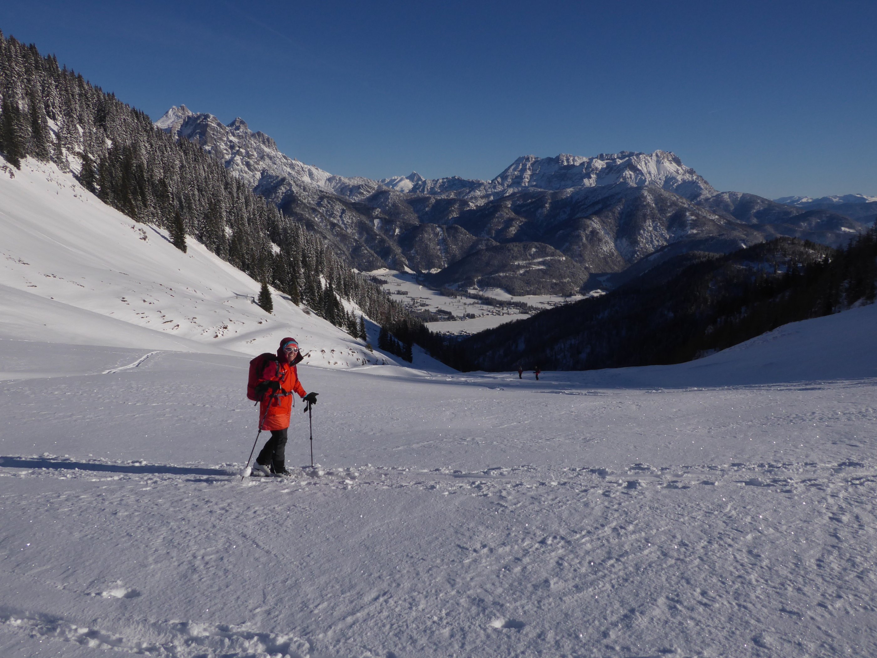 Start bei -7° in St.Ulrich/Pillersee. Erstaunlich viel los heute, fast 20 Autos, für diese Tour eher ungewöhnlich. Aufstieg über Lindtalalm. Wir wählen den etwas niedrigeren Westgipfel des Wallerbergs.Warum? Etwas freieres Gelände und noch viel weniger verspurt.