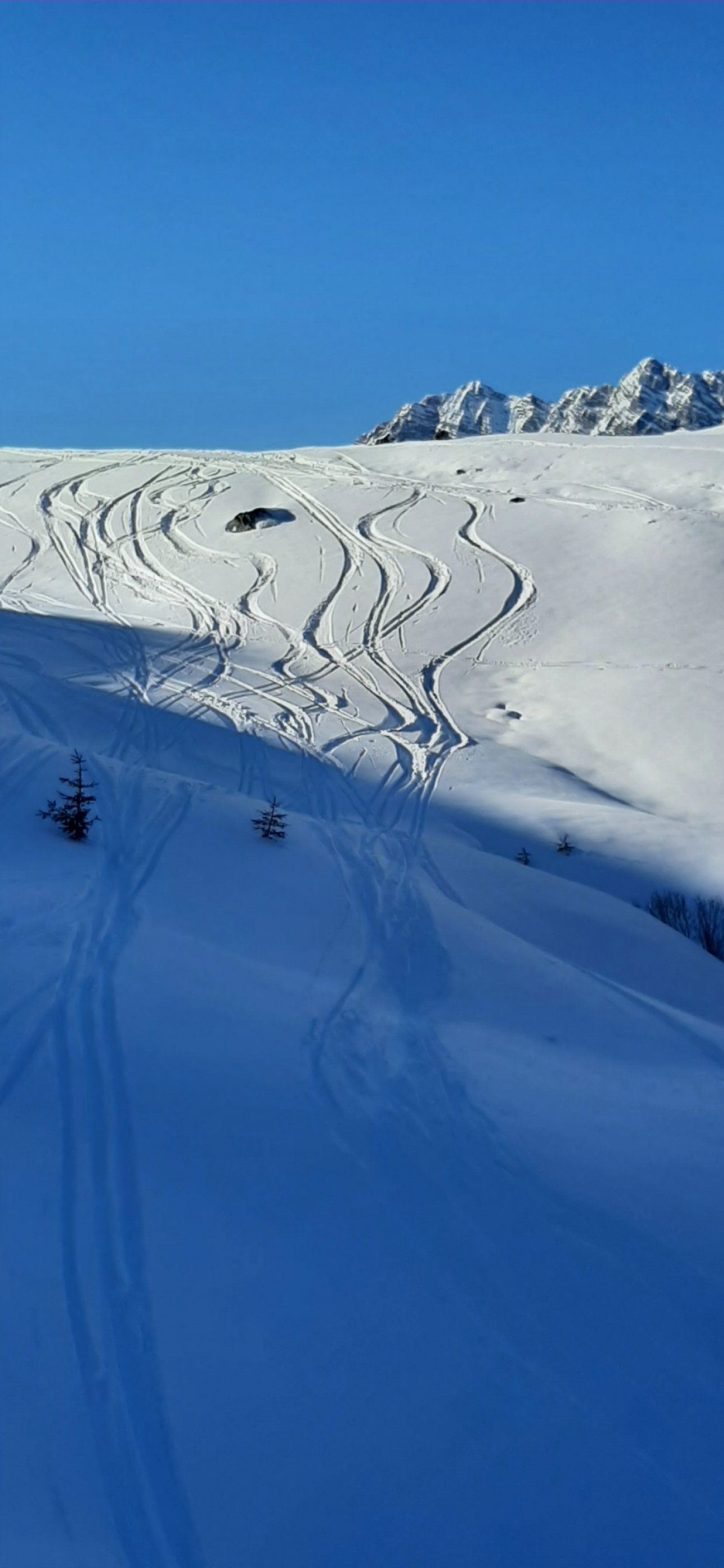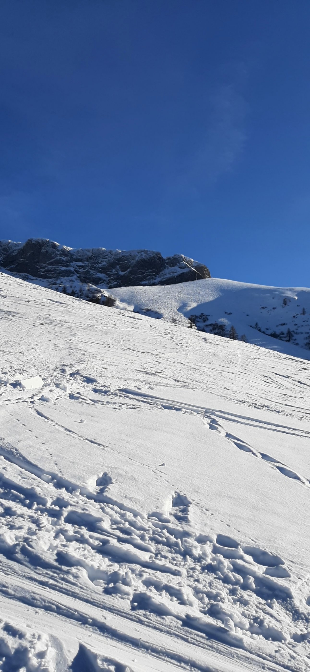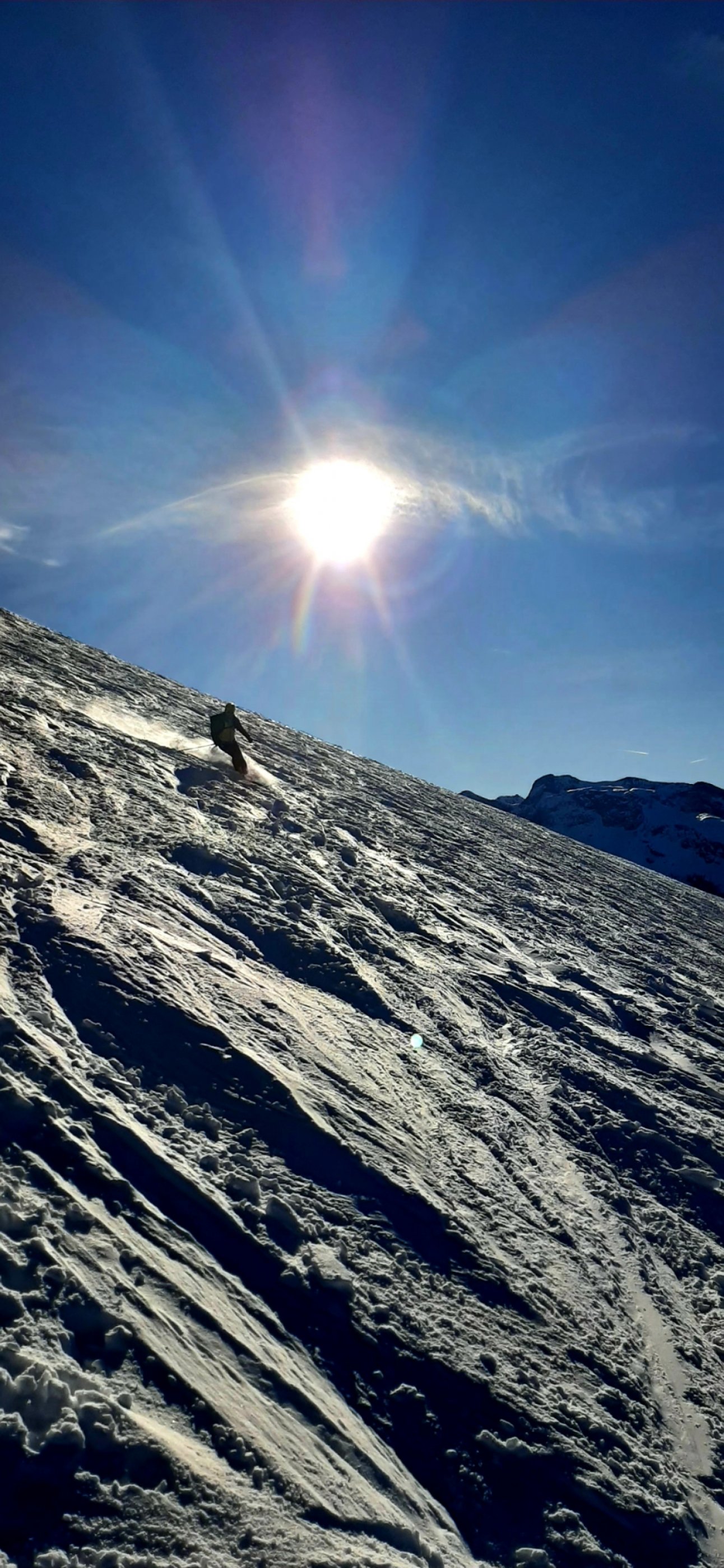 Sonnig, windstill, Pulverschnee in Schattenlage perfekt, in sonnigen Passagen weicher Deckel. Bessere Option orographisch links in den Stiergraben abfahren, weniger verspurt. Abfahrt über Hochbahn bis 300m nach dem roten Kastl makellos, danach ist nur mit Steinski die Abfahrt bis PP anzuraten.