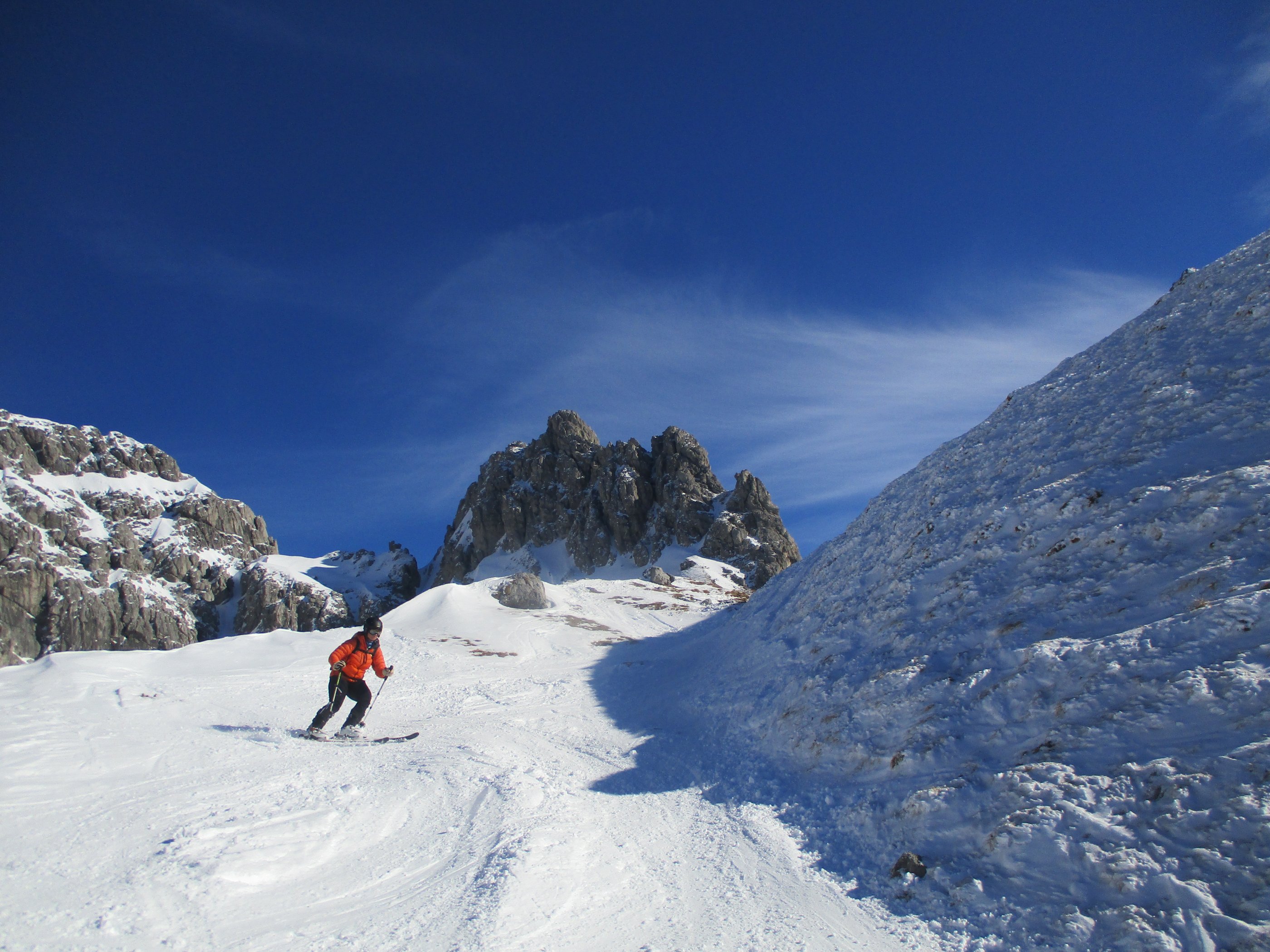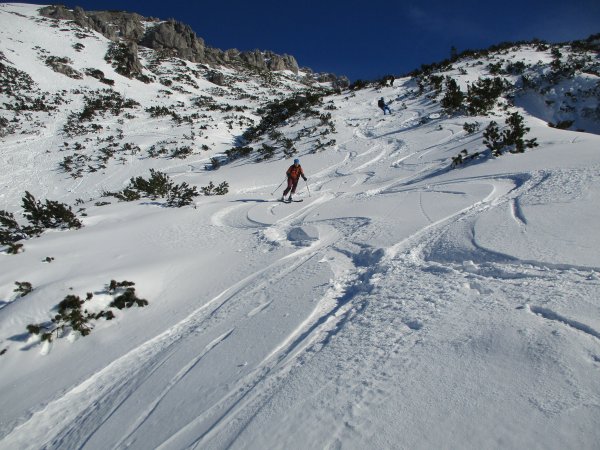 Nordseitig noch immer pulvrig, der kurze Gipfelhang hat eine harte Schneedecke.