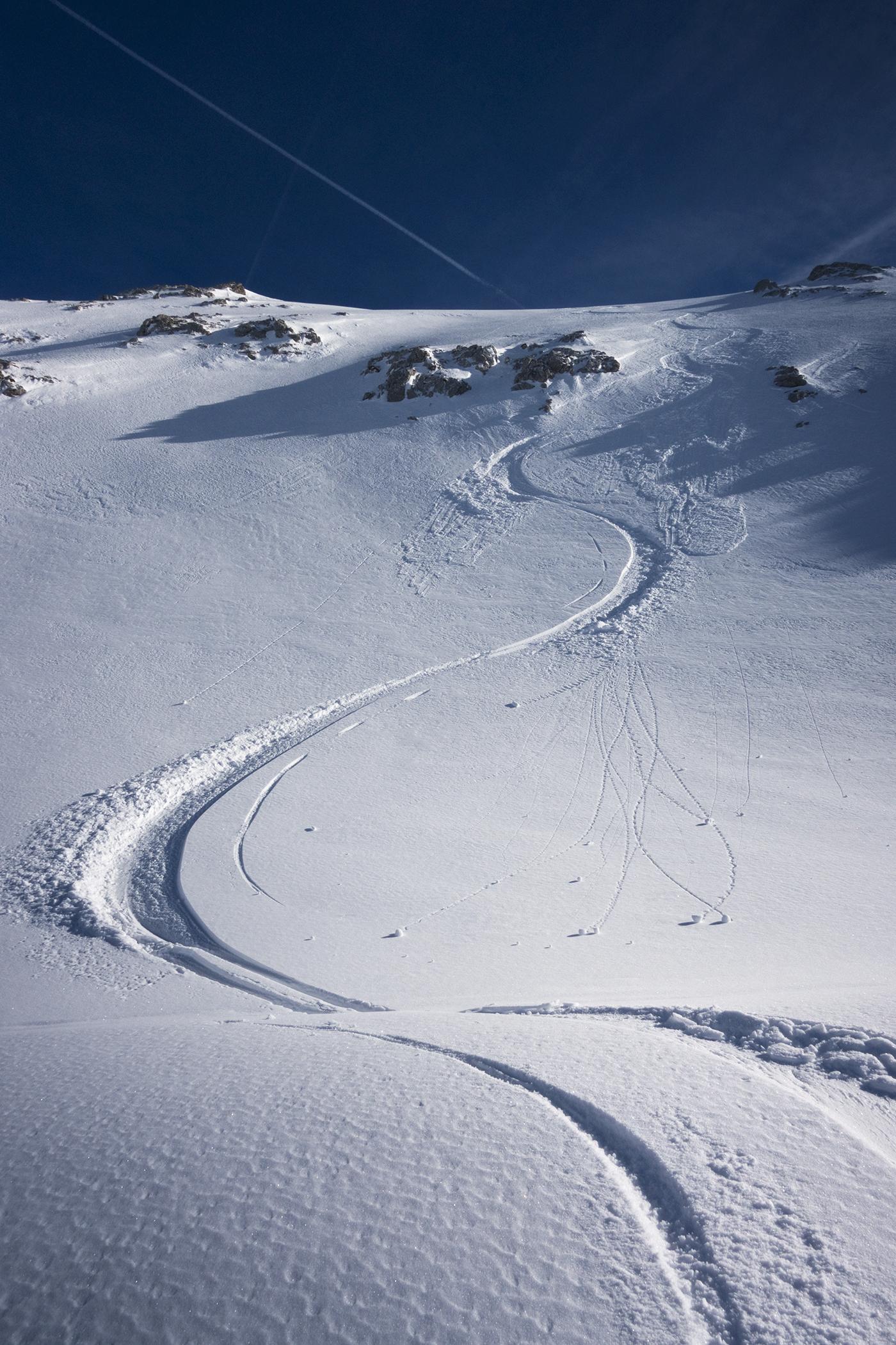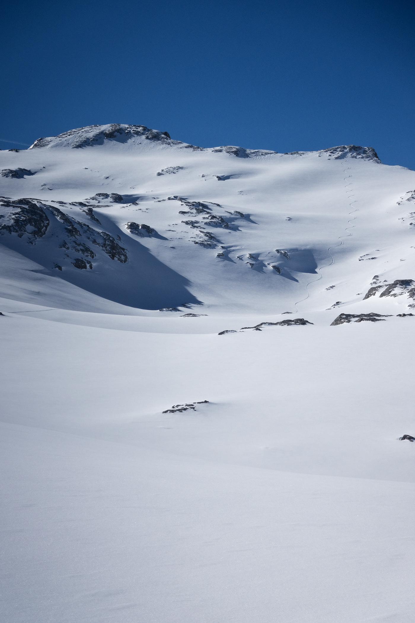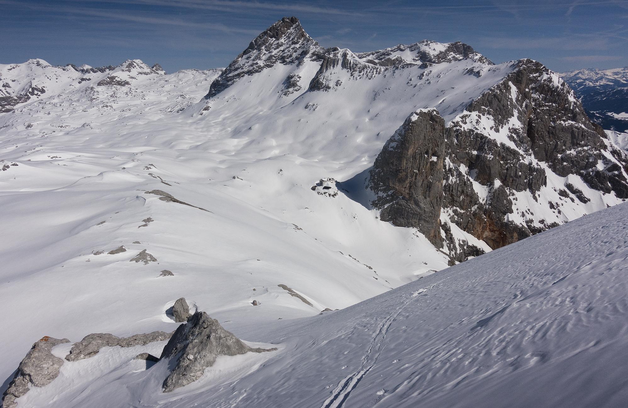 Abfahrt in die Schartengrube und weiter ums Schönfeldspitz herum zum Riemannhaus, 2177m .
