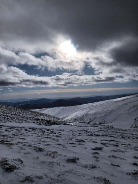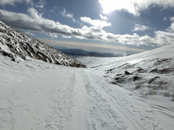 Sehr wenig Schnee, daher auch Abfahrt über die Pisten des Skigebietes Schönberg-Lachtal. Sehr windig im Gipfelbereich.