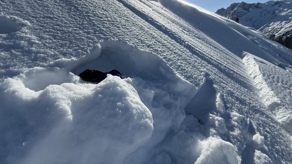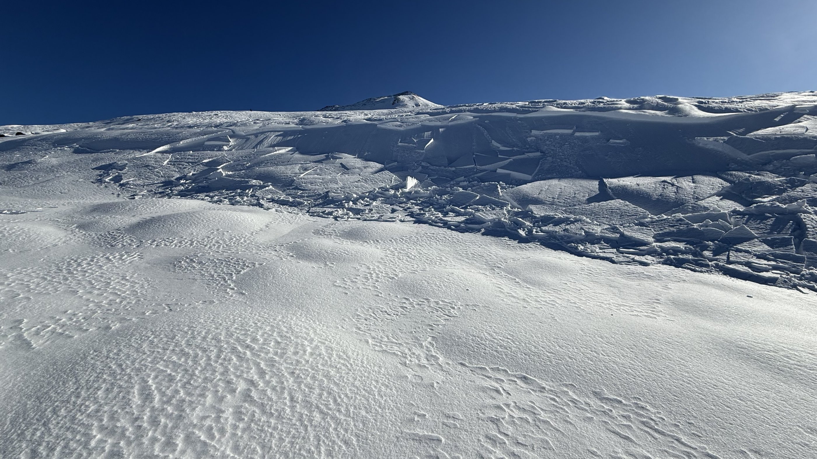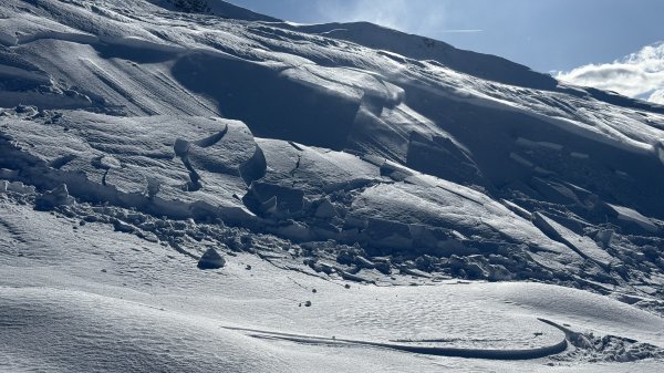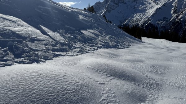 In der Exposition NW, kammfern, 1.850 m, an einer Geländekante löste sich ein Triebschneepaket, ausgelöst durch Querfahrt in der Zugzone am Neigungswechsel, dabei Hangneigung kleiner 30 Grad , Gleitfläche im Bereich einer Kruste
