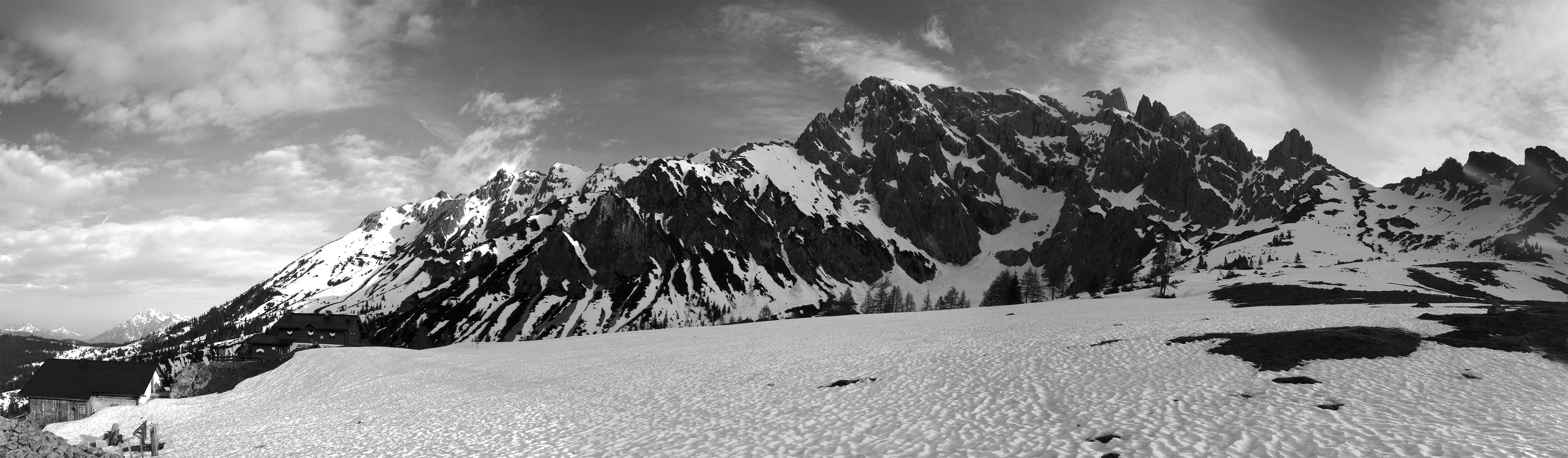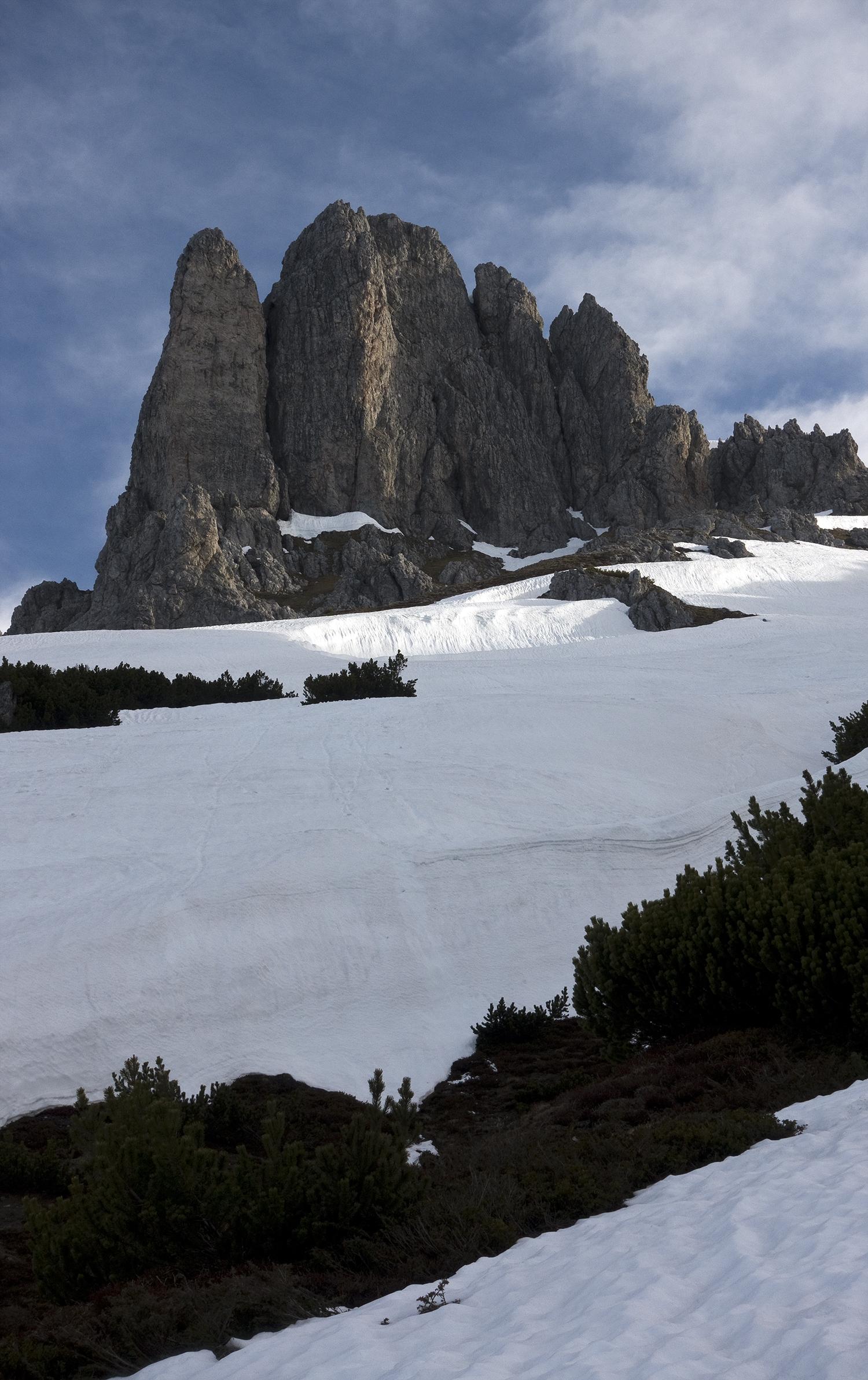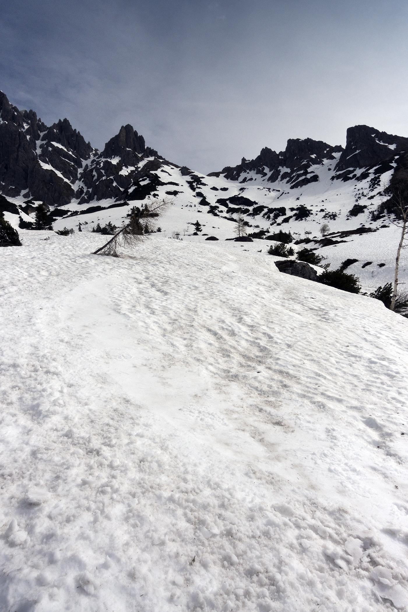 Die Querung zum Einstieg des Klettersteigs ist heute weitgehend schneefrei.