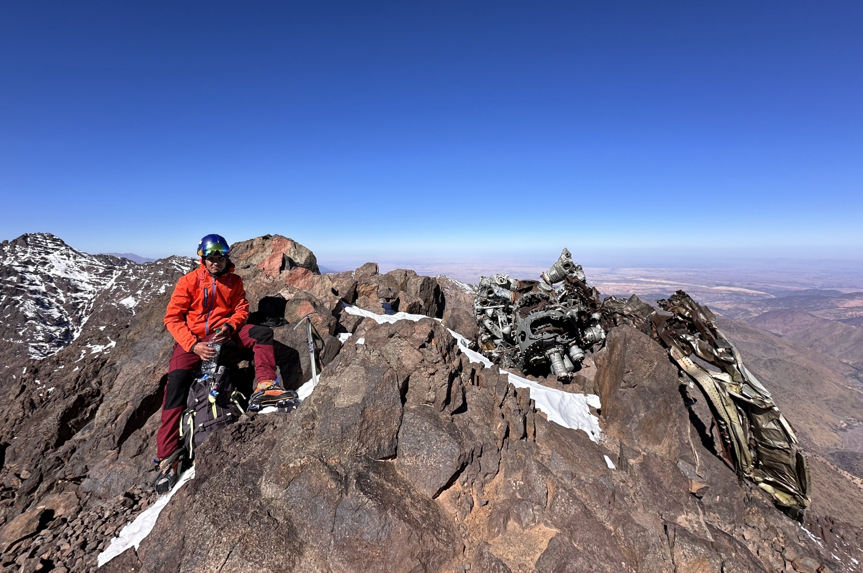 Dunkel ist es noch, kalt fegt der Wind um die Hütte, und im Süden leuchtet das Sternbild Skorpion über dem Pass. Nicht mit Ski, sondern mit Steigeisen starten wir zur Überschreitung von Marokkos höchstem Gipfel. Der Wind wird stärker am Grat zum Westgipfel(4017m), aber inzwischen wärmt die Sonne. Am Jebel Toubkal (4167m) schauen wir bis in die Sahara hinein. Aber es gibt Alpendohlen, wie bei uns daheim. Nun steigen wir nach Norden ab, hier gibt es kaum Spuren, und der Wiederanstieg zum Imouzzer (3988m) ist felsig und anspruchsvoller. Dann kommt noch ein Gipfel. Die Luft ist dünn, aber bläst kräftig. Zwischen Sein und Nichtsein liegen manchmal nur wenige Meter. Vor mehr als 60 Jahren hat hier ein wagemutiger Pilot versucht, den Hohen Atlas beim Schneesturm zu überfliegen. Unser letzter Gipfel heute war sein Verhängnis, er raste in den Gipfelfelsen. Das Wrack wird für immer hier oben sein, den Piloten haben die Einheimischen auf einer Hochfläche weiter unten begraben. Gedankenvoll steigen wir ab. Wer kennt noch „Wind, Sand und Sterne“?