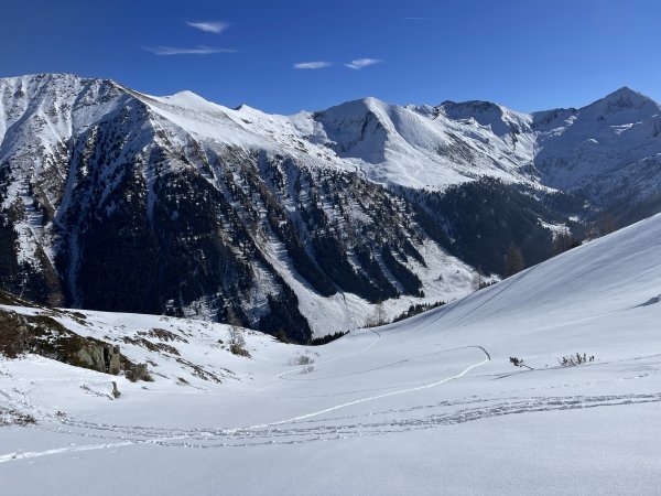 Tragender Altschnee mit 10 bis 15 cm Neuschneeauflage, teilweise mit Rauhreifoberfläche. Gipfelhang, südseitig exponiert ziemlich kompakt, Harscheisen bzw. Steigeisen vorteihaft. Insgesamt ausgezeichnet zu gehen und fahren. im Tal schneidig kalter Wind, am Gipfel fast windstill und glasklare Fernsicht