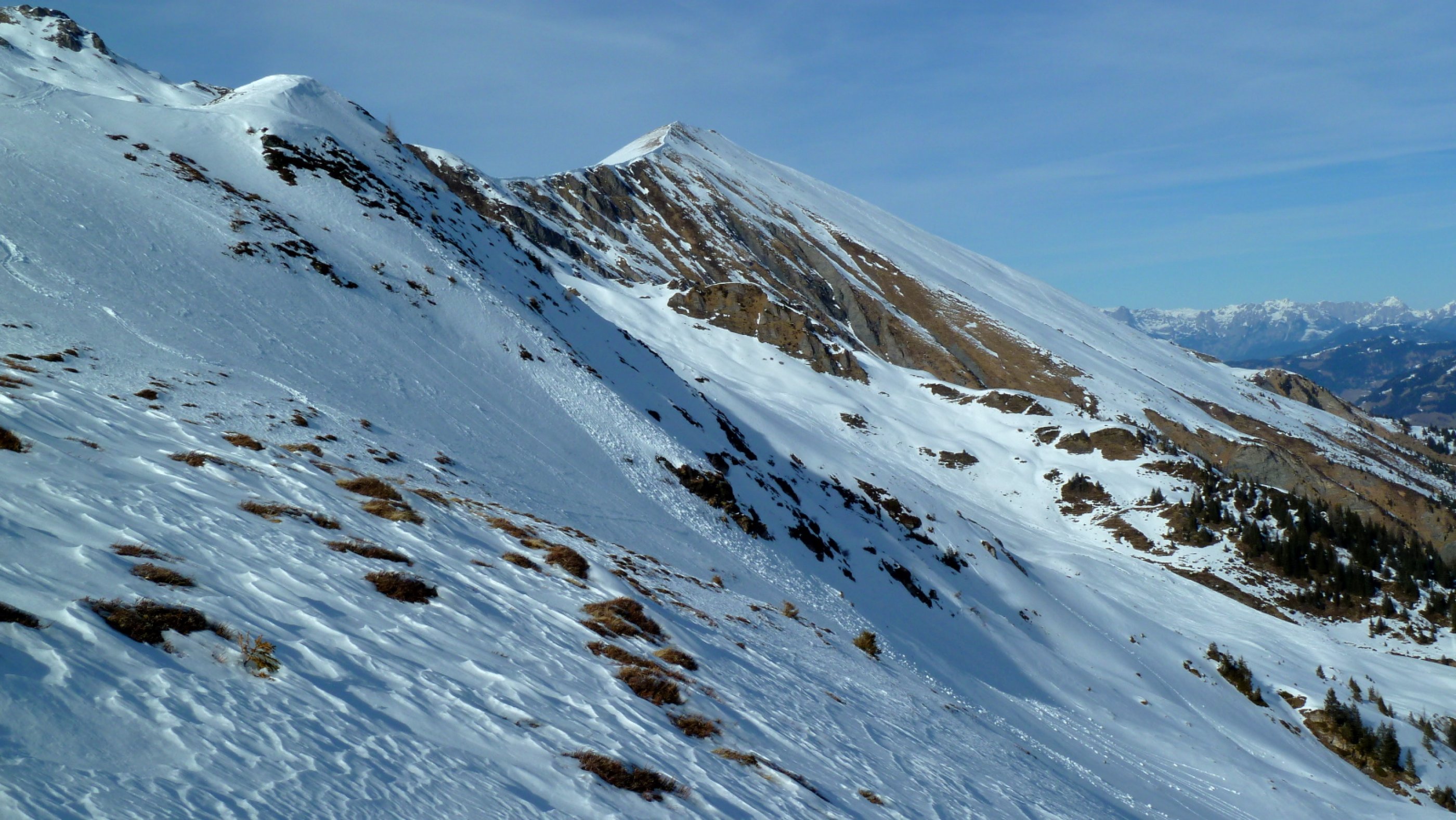 Am Südhang des Gamskarkogel sind Fischmäuler von kleinen Gleitschneelawinen zu sehen, viel abgehen kann angesichts der geringen Schneemengen wohl kaum. Auf der steilen Schattseite des Finsterkopfes haben einige Schneebälle die Schwerkraft probiert, für Schneebrettauslösung dürfte alles zu gut abgesessen sein.