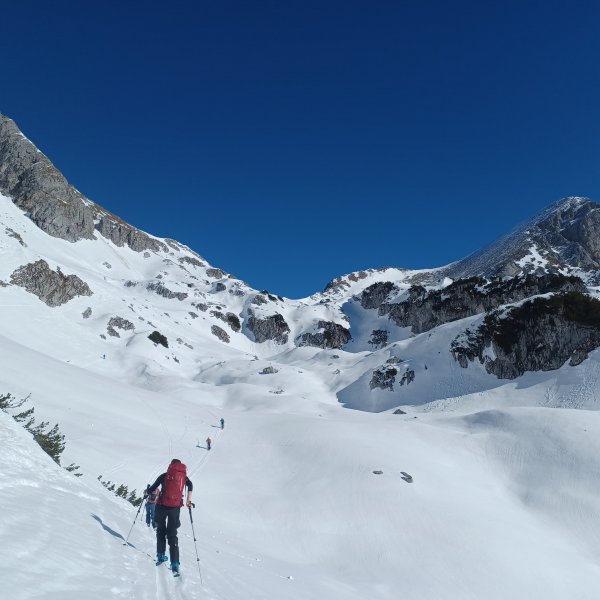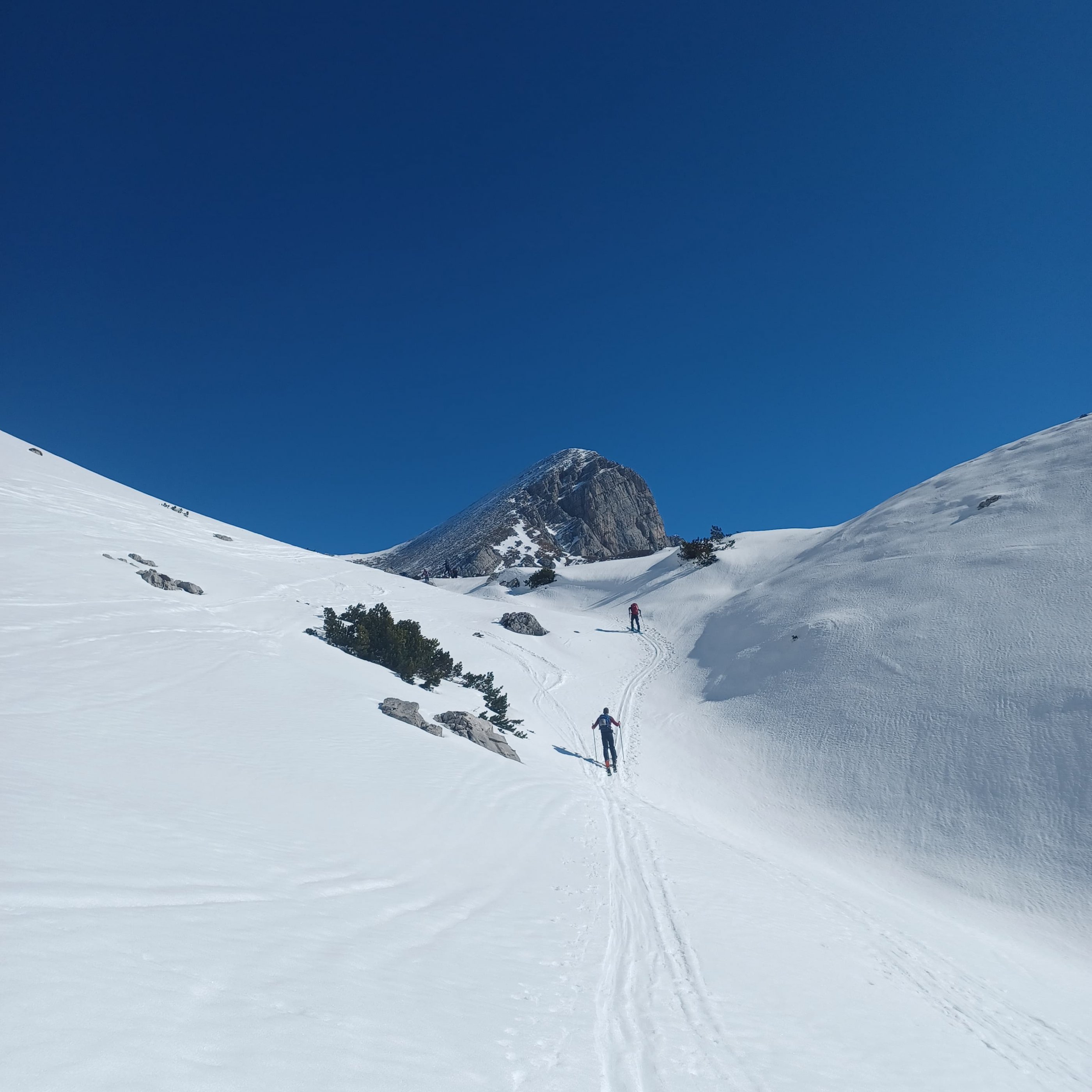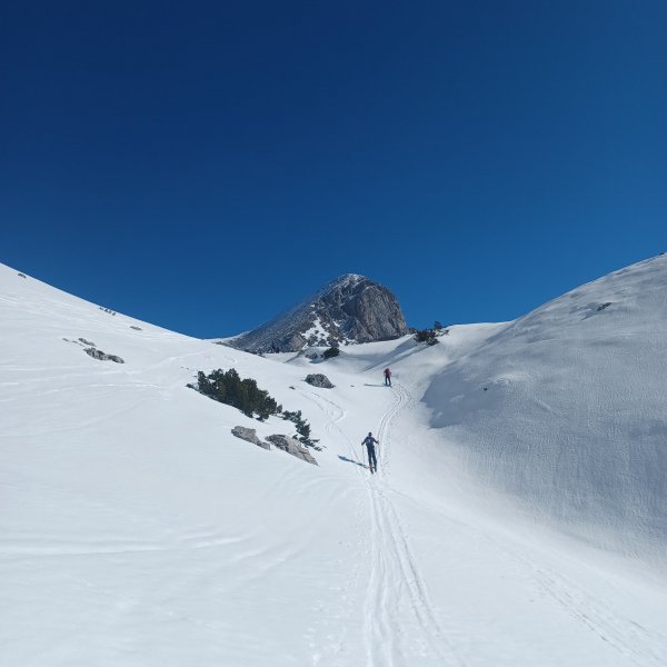 Aufstieg: Zügiger Aufstieg in Richtung des südseitigen Kahrs des großen Phyrgas. Hier mussten wir die Ski erneut für ca. 15 Minuten tragen, da es ausgeappert war.