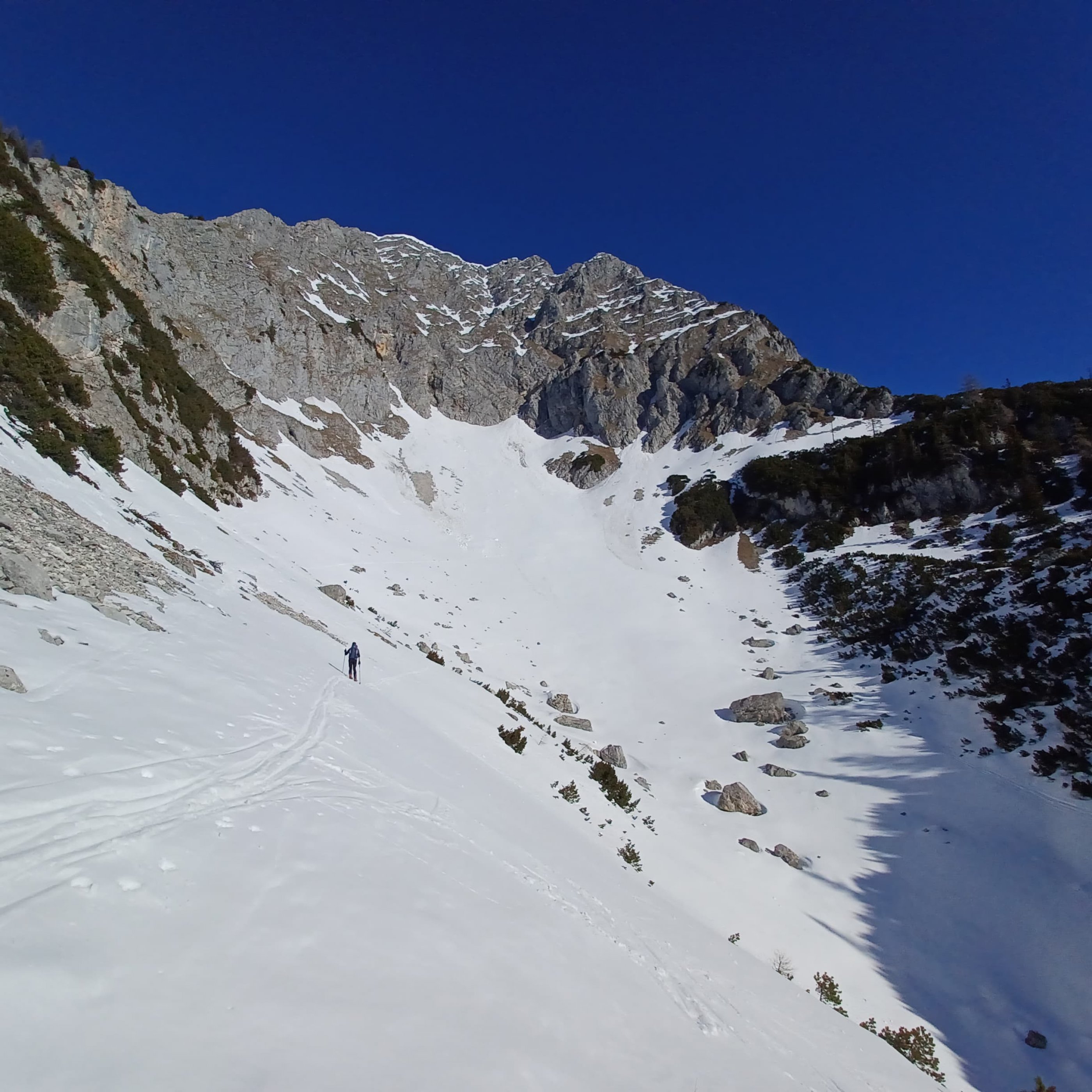 Ab der Scharte beim Gamsspitz ausreichend Schnee vorhanden, bei der Abfahrt über die lange Gasse bis ca. 1500 gut, dann kein Schnee.