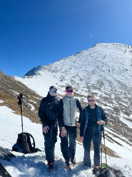Ab der Scharte: Hervorragende Bedingungen mit viel Sonnenschein. Wir entschieden uns, nicht bis zum Gipfel zu gehen, da das letzte Stück zu Fuß bewältigt werden musste. Stattdessen stiegen wir südseitig bis zum Grat auf.