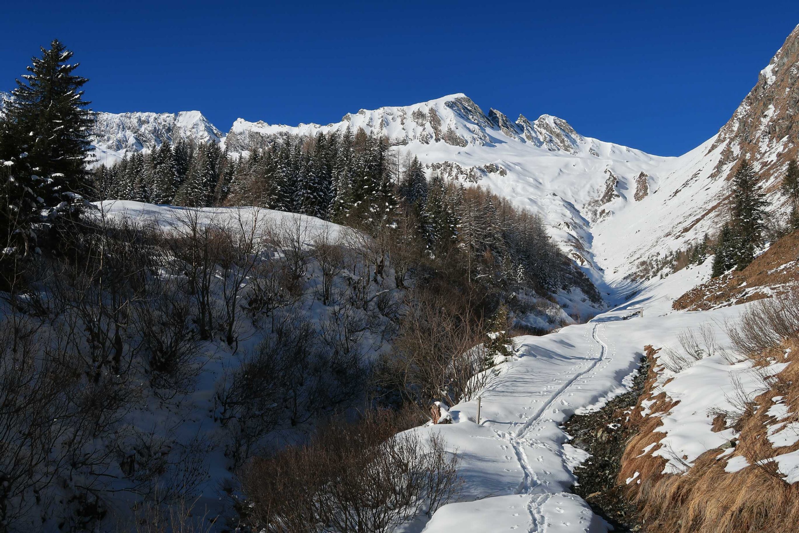 Die Forststraße hat nur noch sehr dünne, z.T. etwas eisige Auflage. Man kann bis auf eine kurze Unterbrechung noch alles mit Ski aufsteigen, bei der Abfahrt kratzen aber an etlichen Stellen die Kiesel am Belag. In ca. 1200m wird die Forststraße nach rechts verlassen und man überquert 2 schmale Holz-Fußgängerbrücken. Jenseits des Baches steigt man z.T. noch mit Ski, z.T. tragend bis zur Querung in den Schiedergraben (ca. 1500m, beim Abstieg alles getragen). Nach der Querung des Grabens beginnt sehr schönes , kuppiertes Tourengelände. Gestern haben 2 Tourengeher den Anstieg bis ca. 100Hm unterhalb der Grüneckkogelscharte gespurt (besten Dank), sie sind dann aber über die Harlandalm abgefahren. Bis auf 2 Tourengeher nach mir war heute keiner unterwegs. Abfahrt oben in ca. 20cm unverspurtem Pulver war ein Traum.