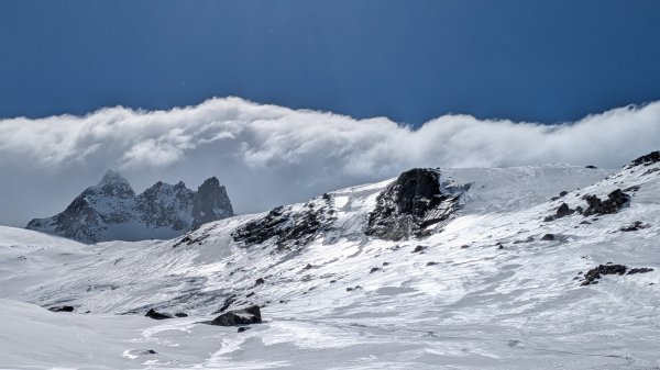 Unten waren ein paar nasse Lockerschneerutsche abgegangen, sonst keine Lawineneobachtungen, bei machen im Schatten gelegenen Querungen oberhalb von 2500m und insbesondere im Gipfelbereich hatten sich kleinräumige Triebschneeansammlungen gebildet.